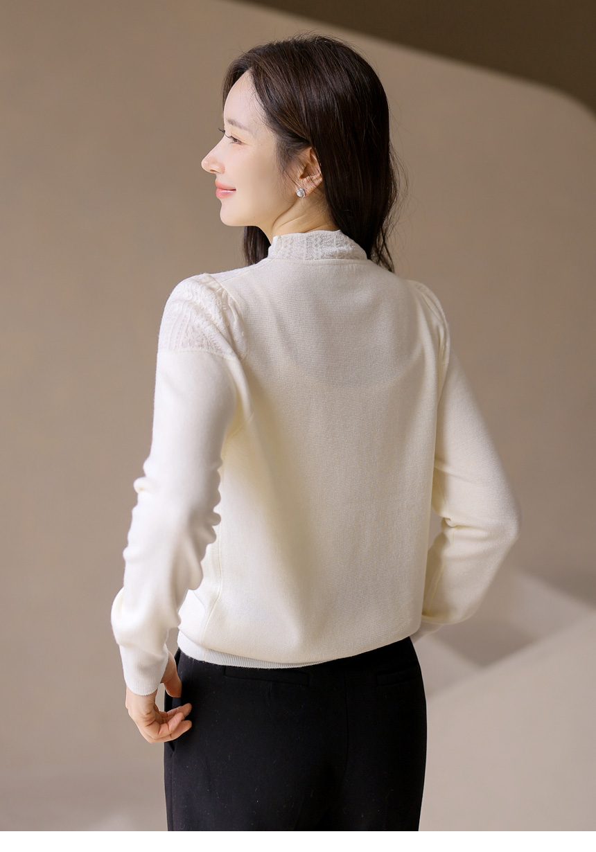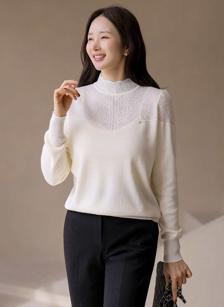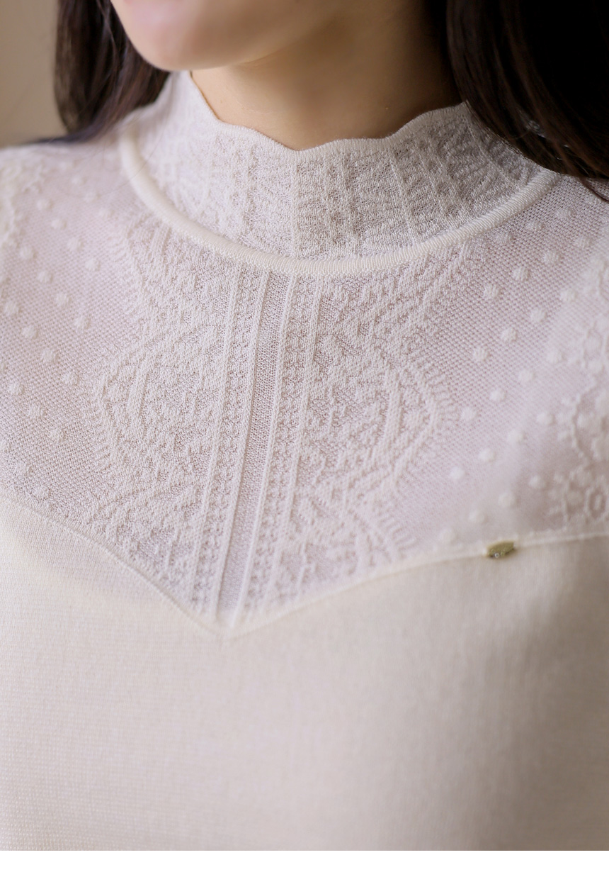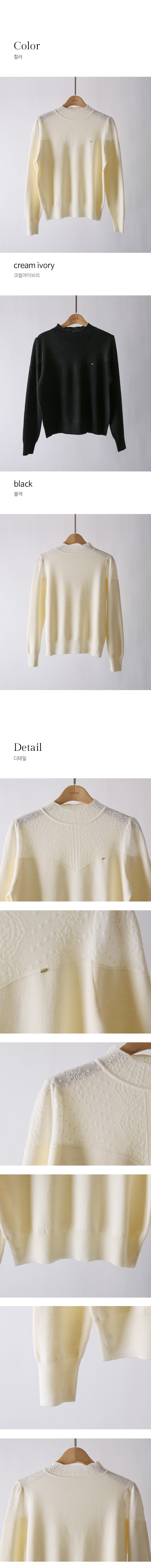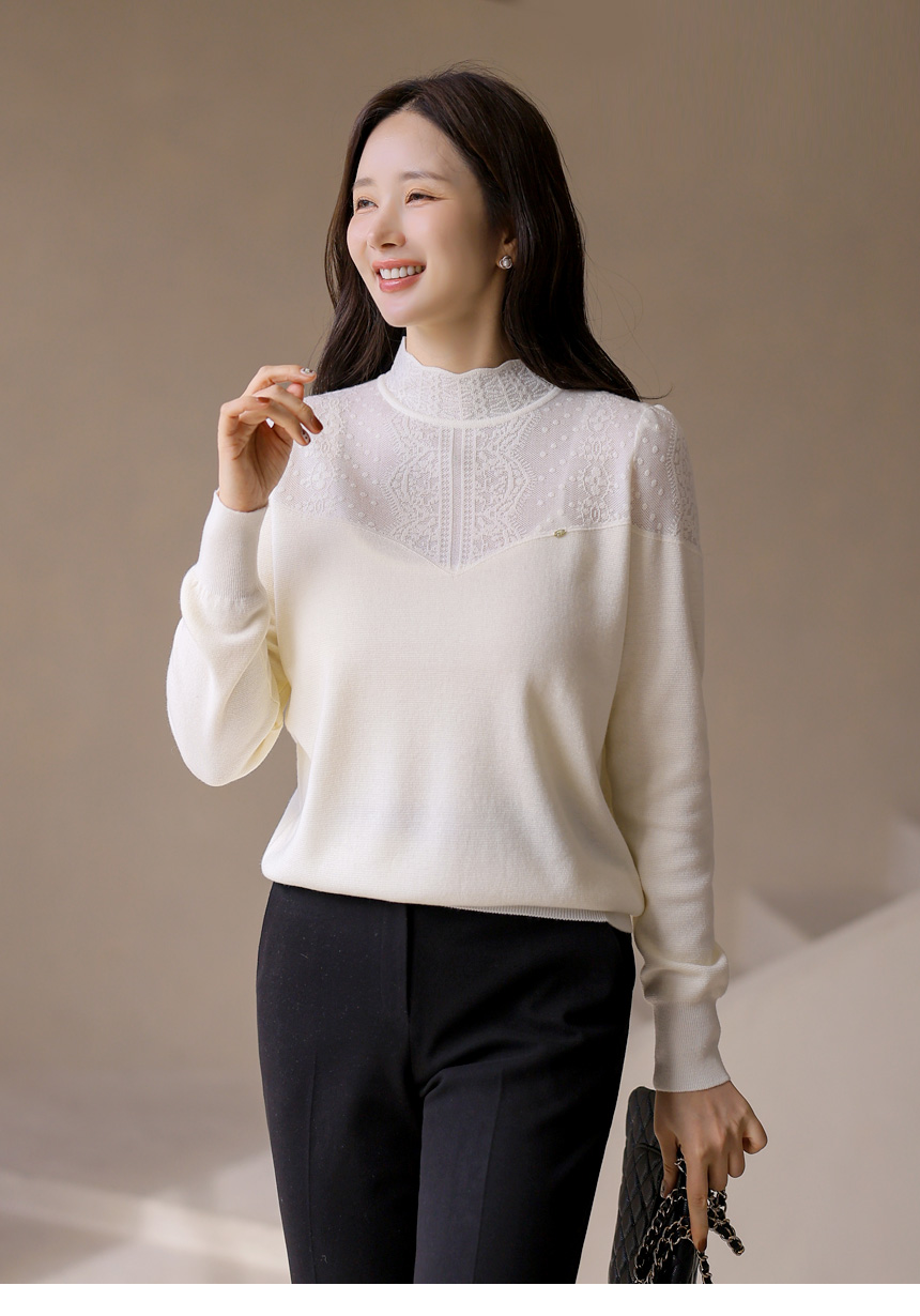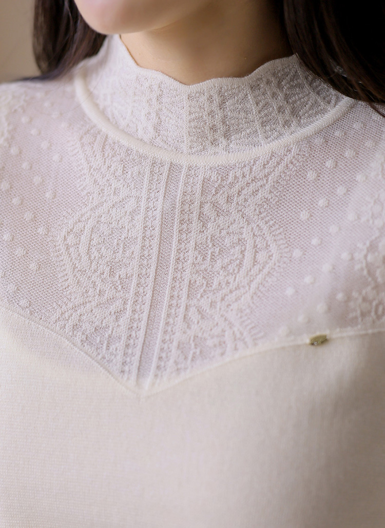 리로사 하트 라인 레이스 도트 쟈가드 배색 반하이넥 니트