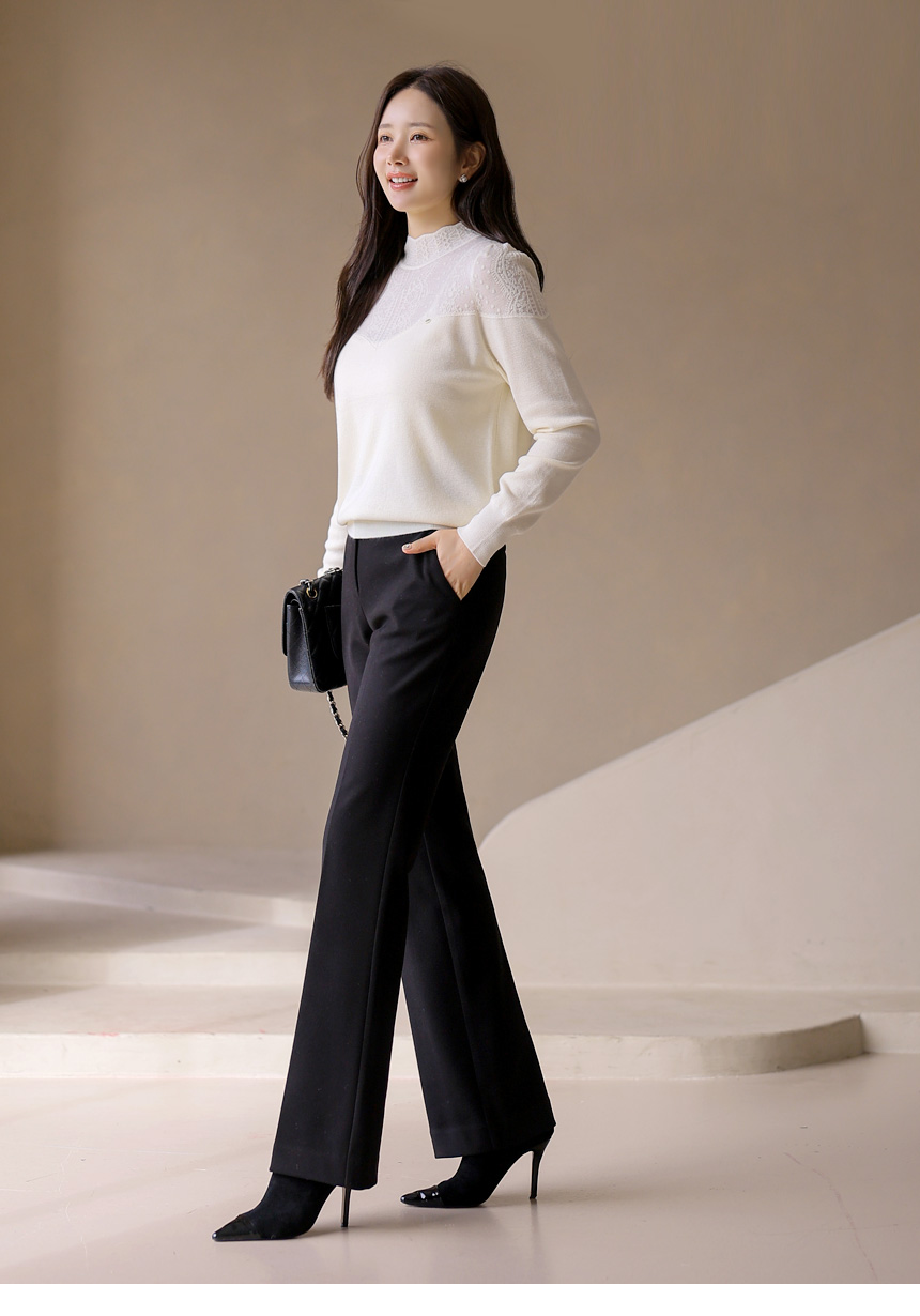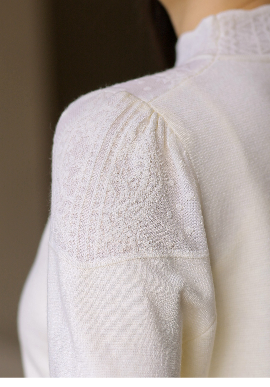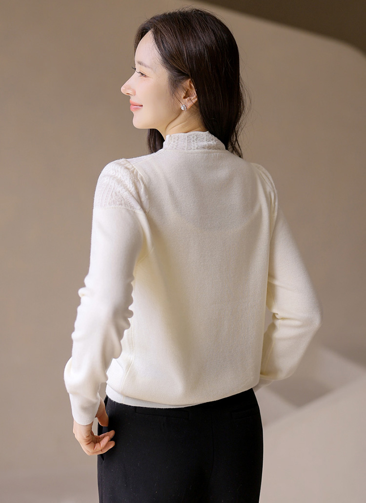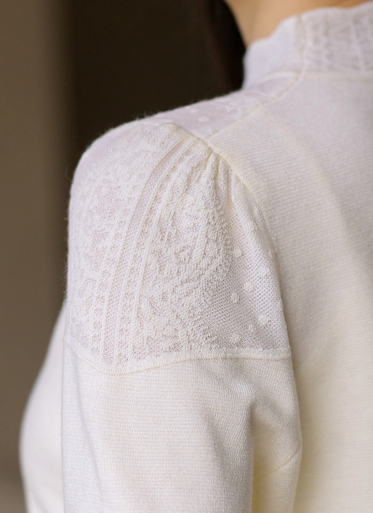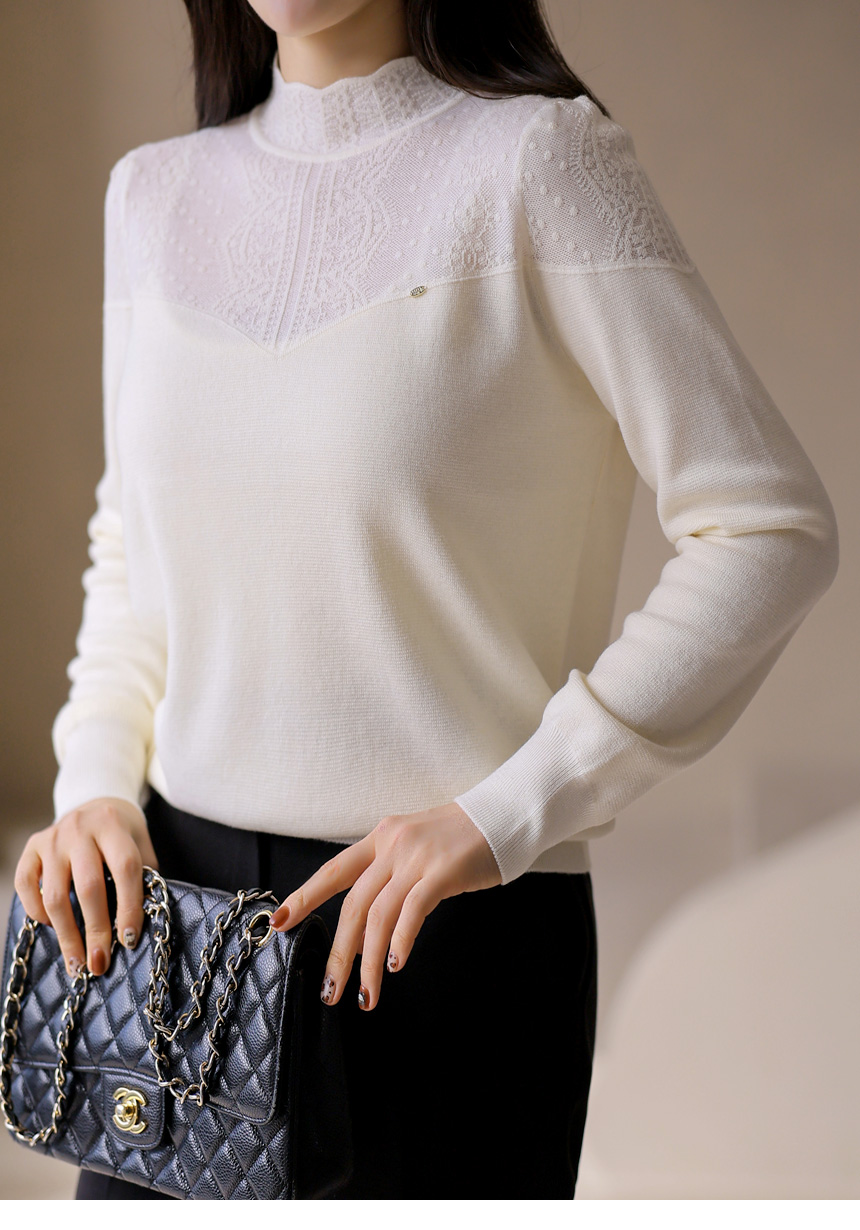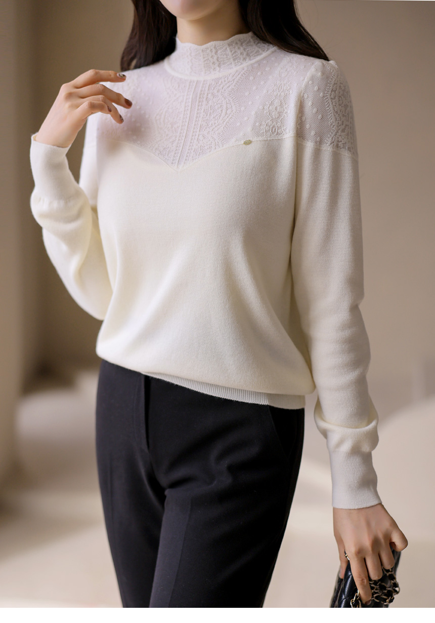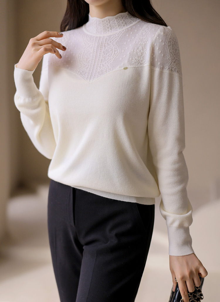 리로사 하트 라인 레이스 도트 쟈가드 배색 반하이넥 니트