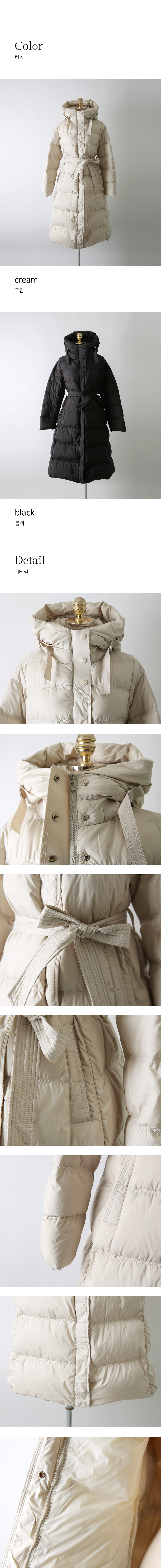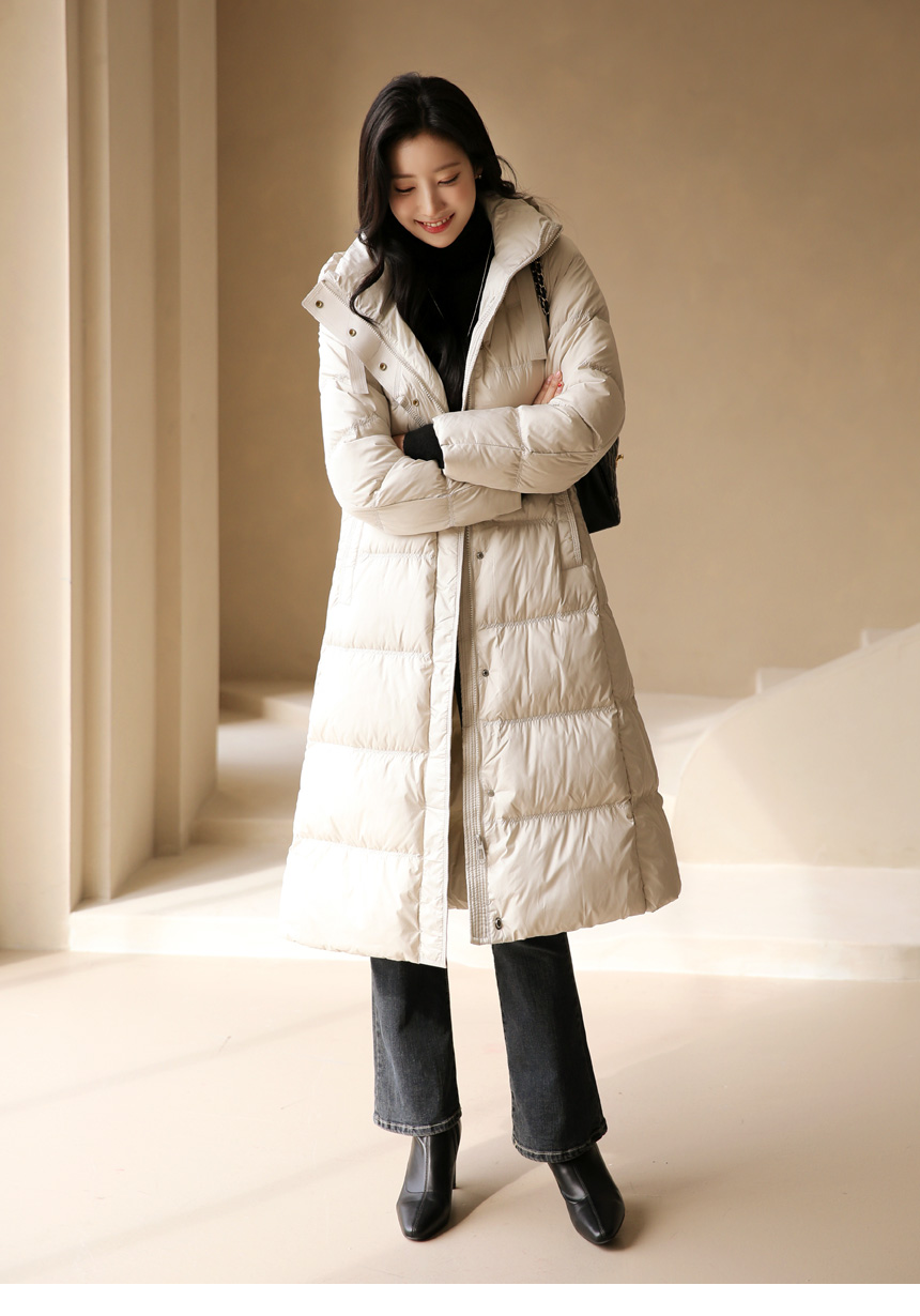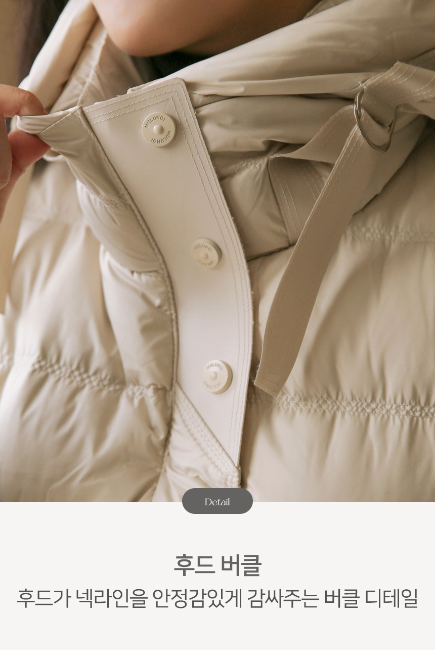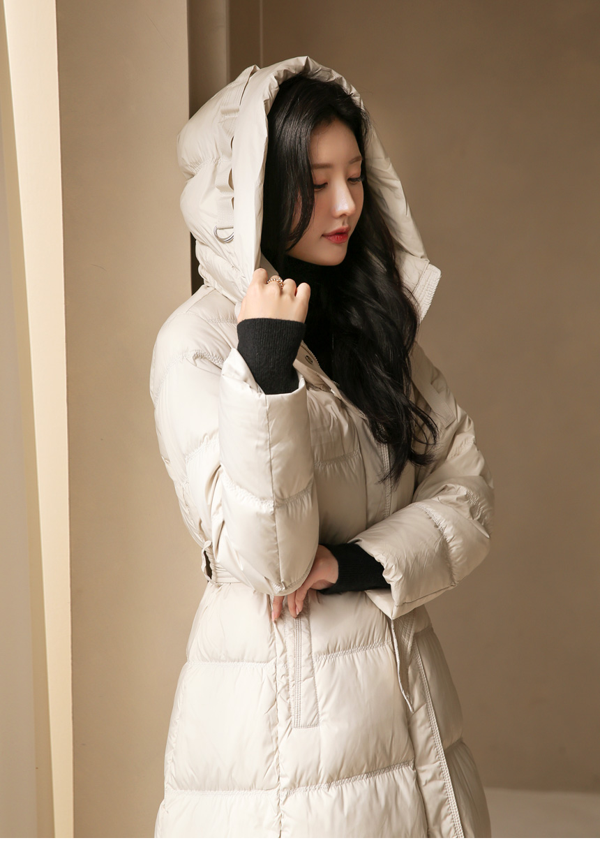벨로티 페미닌라인 오리털 버클 하이넥후드 롱 패딩 점퍼