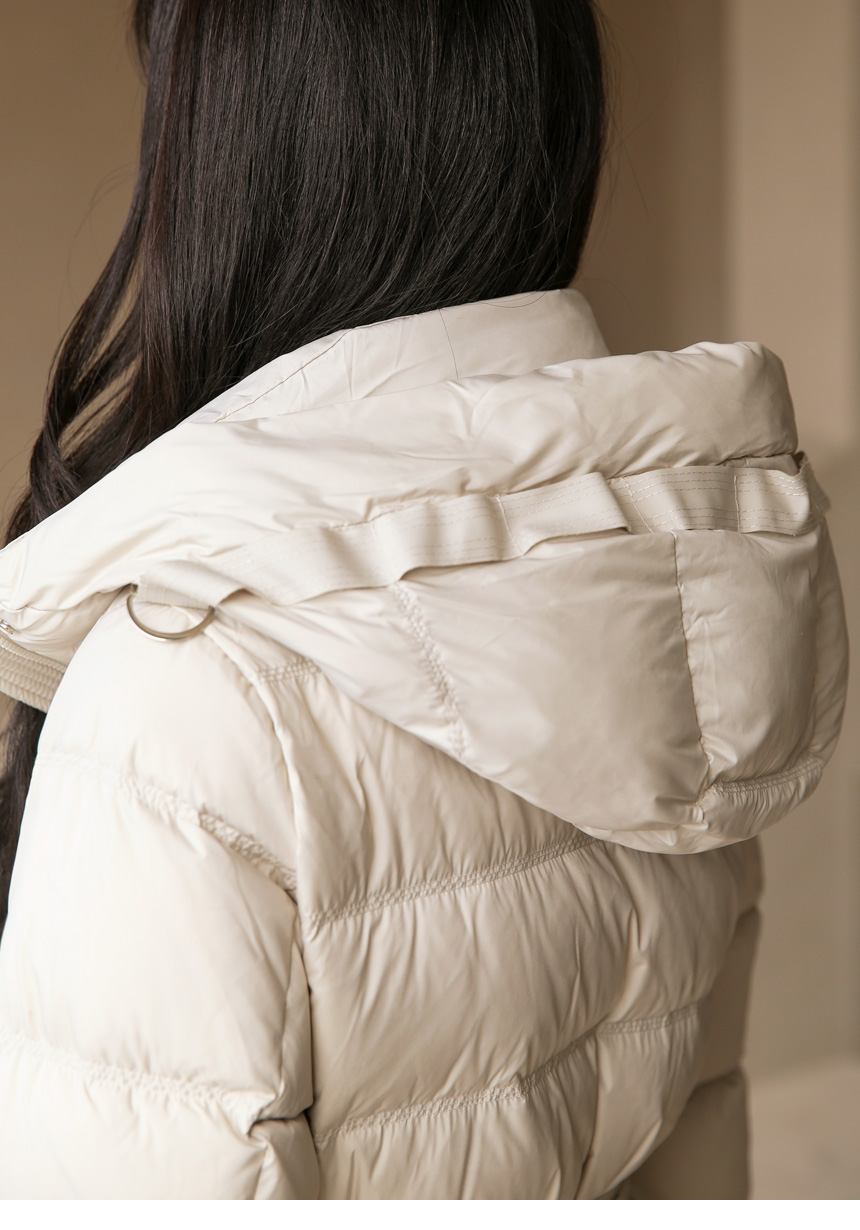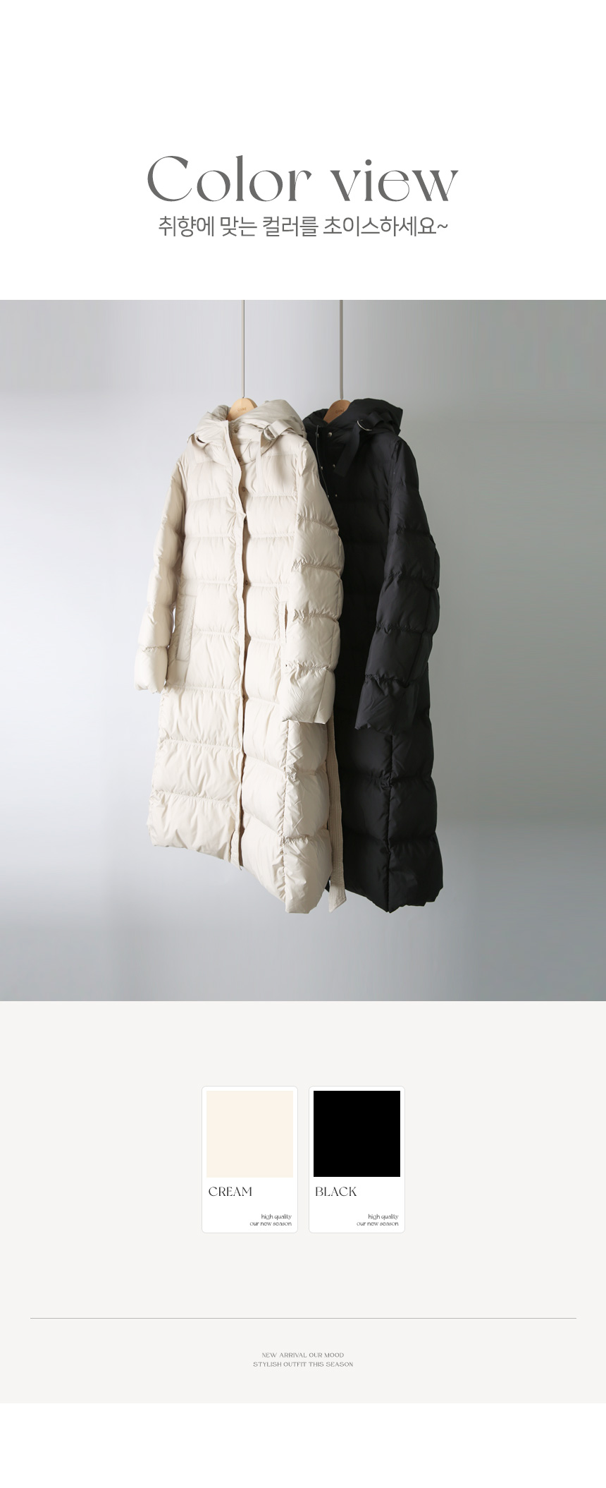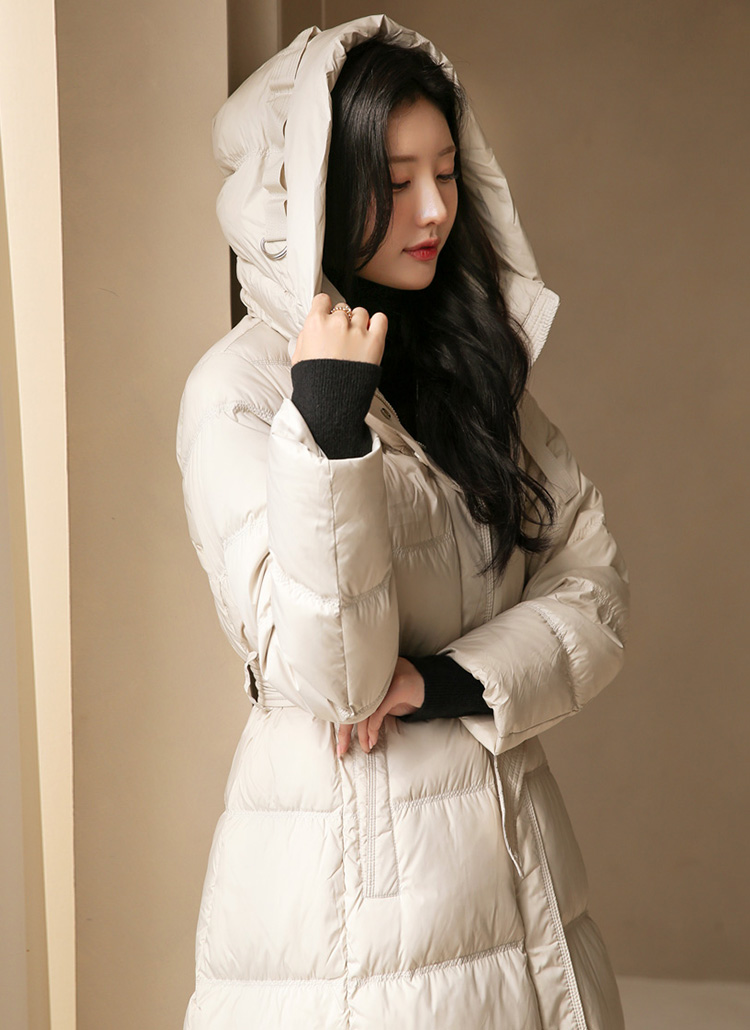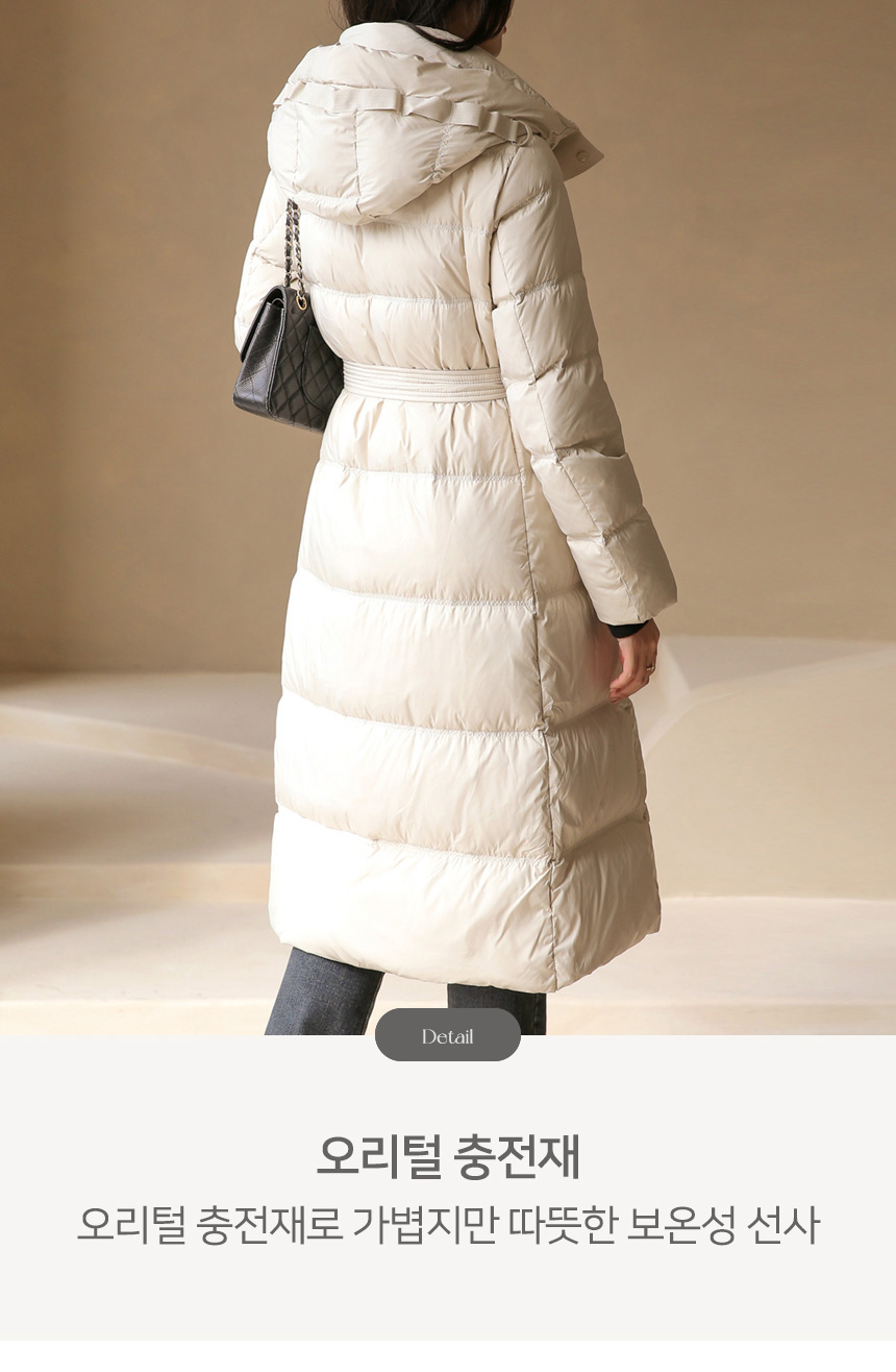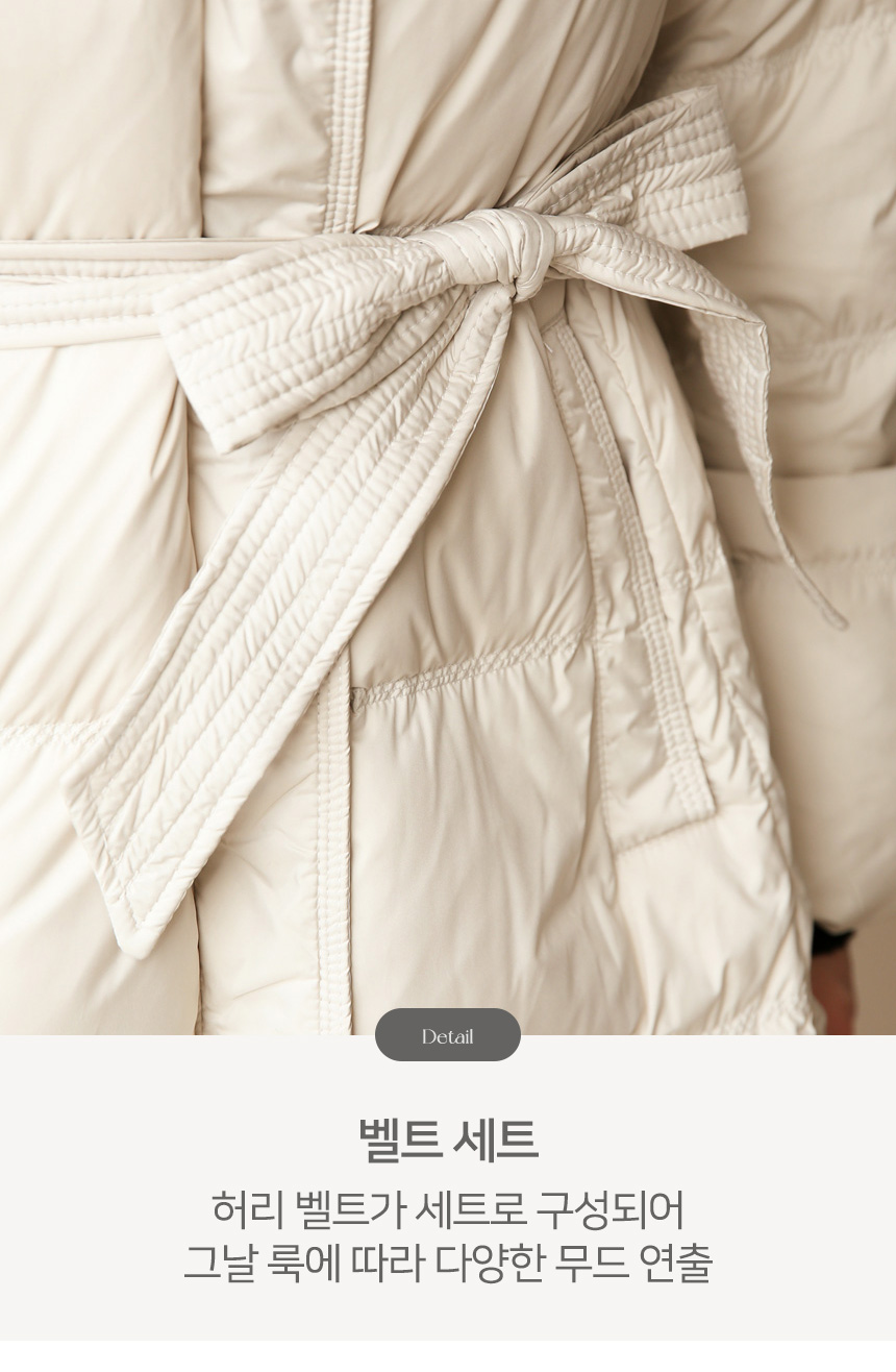 벨로티 페미닌라인 오리털 버클 하이넥후드 롱 패딩 점퍼