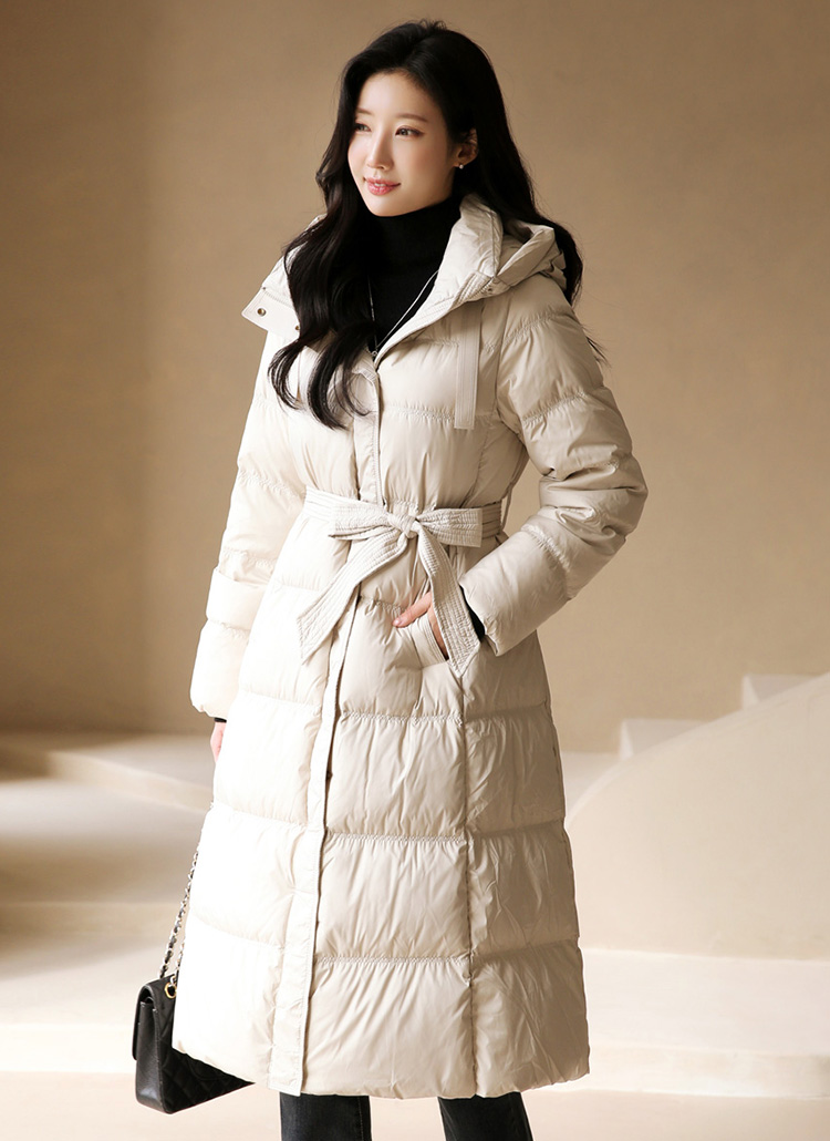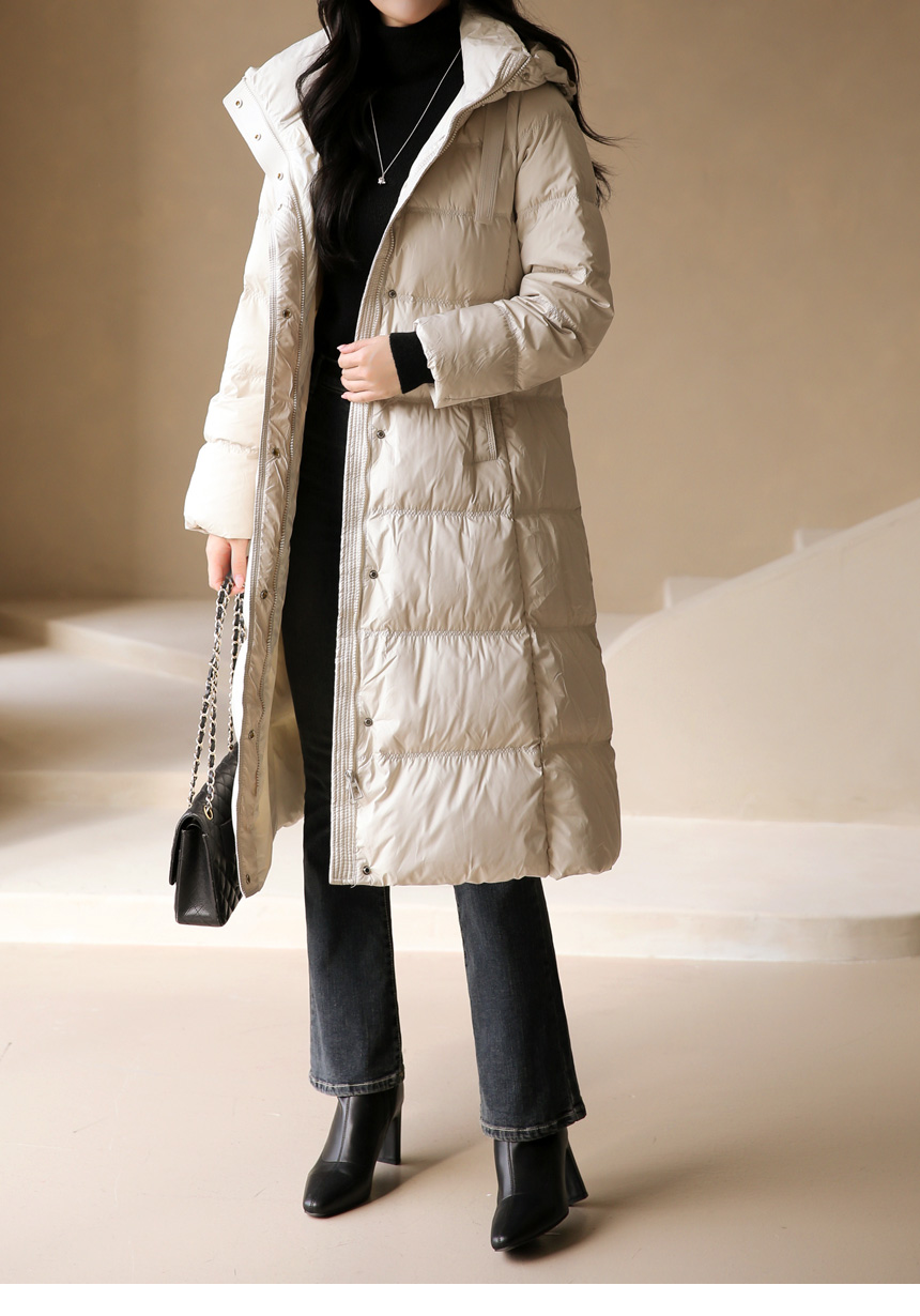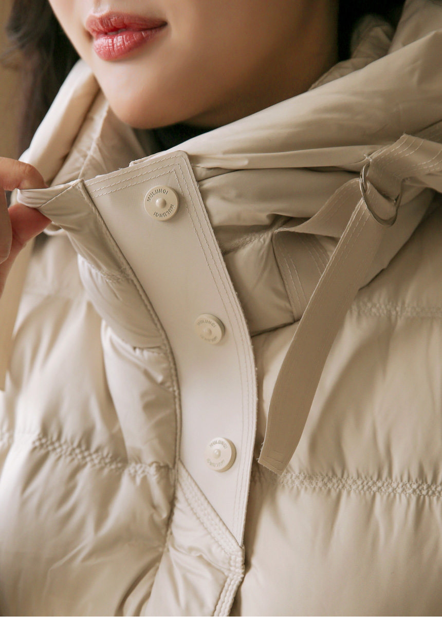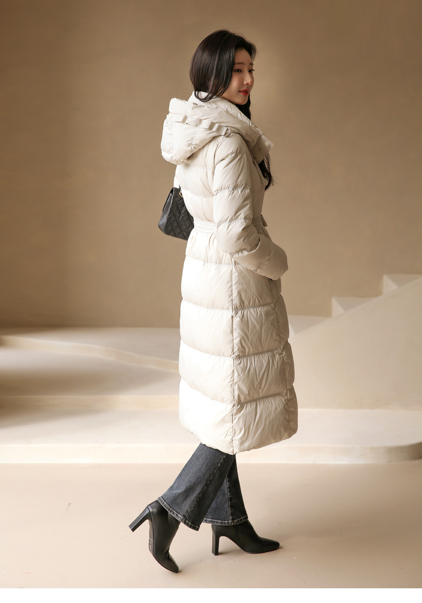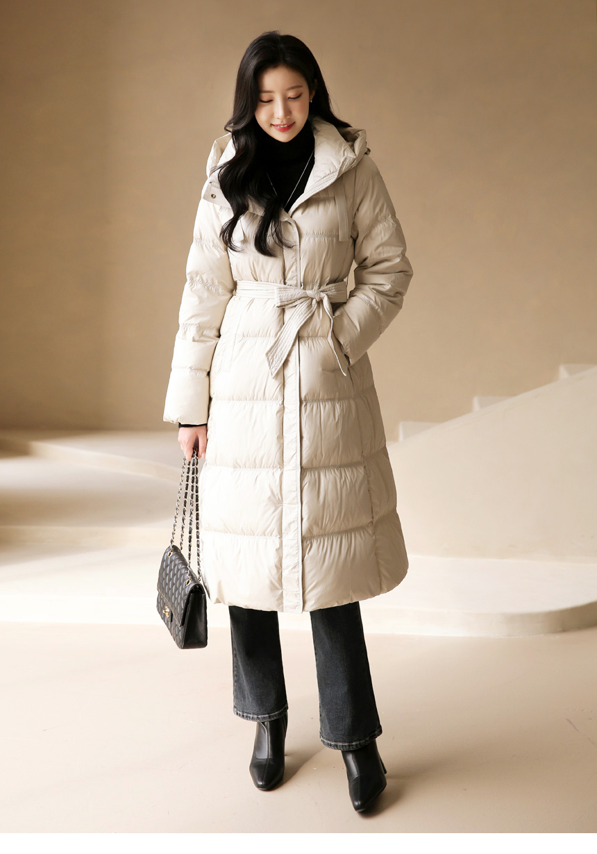 벨로티 페미닌라인 오리털 버클 하이넥후드 롱 패딩 점퍼