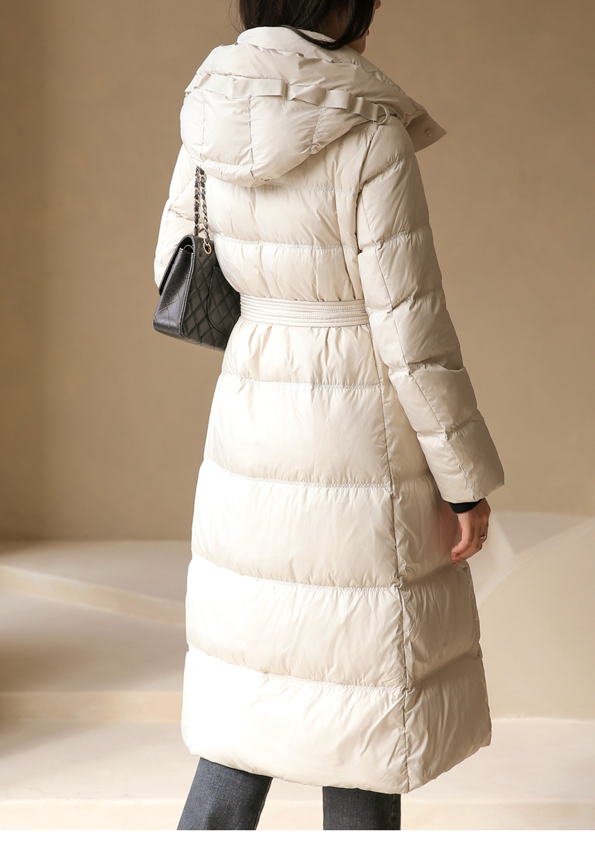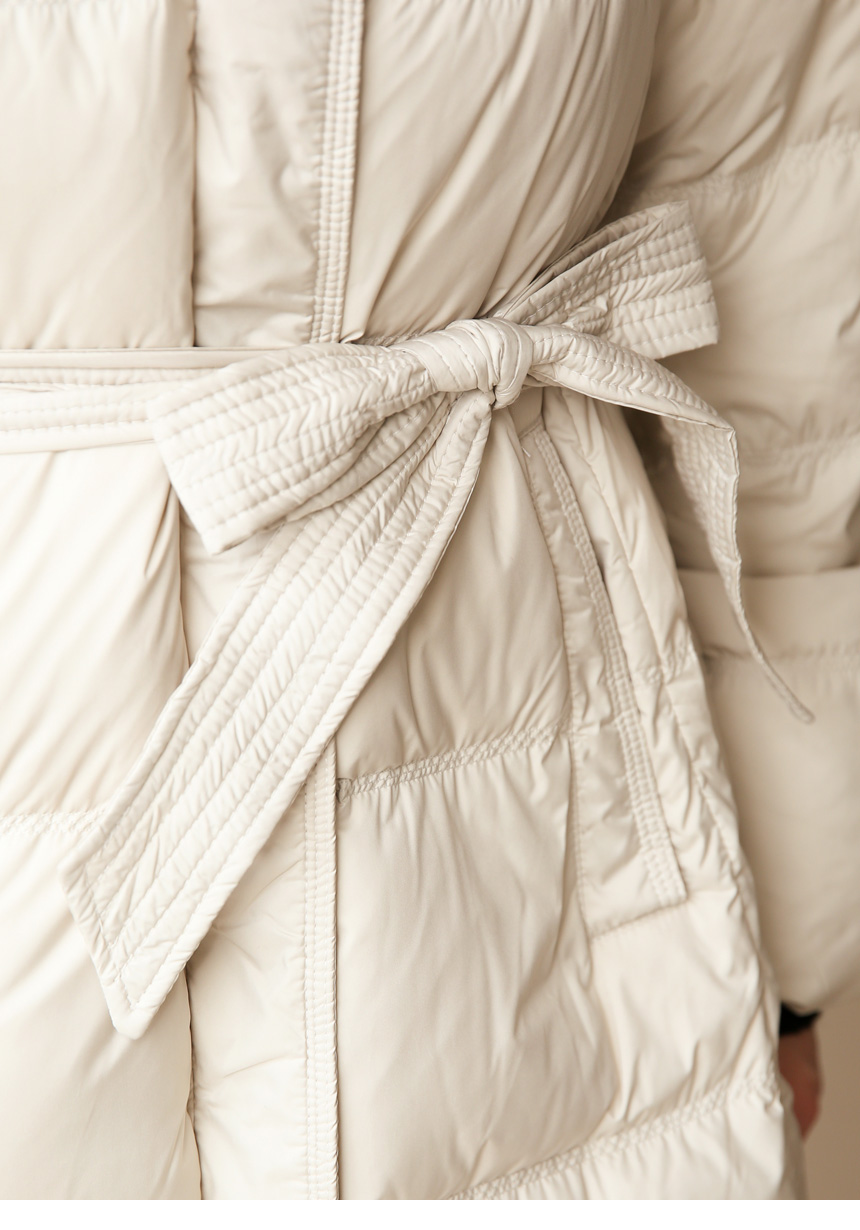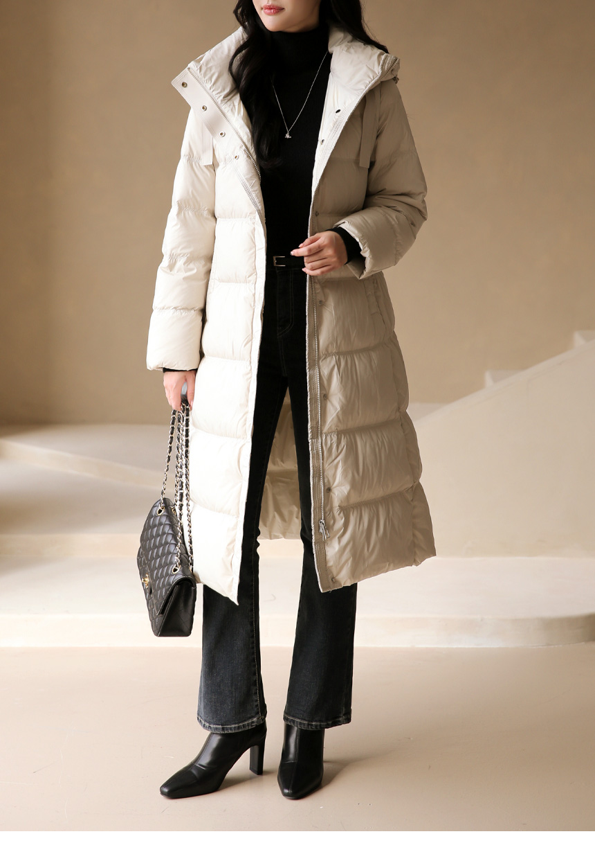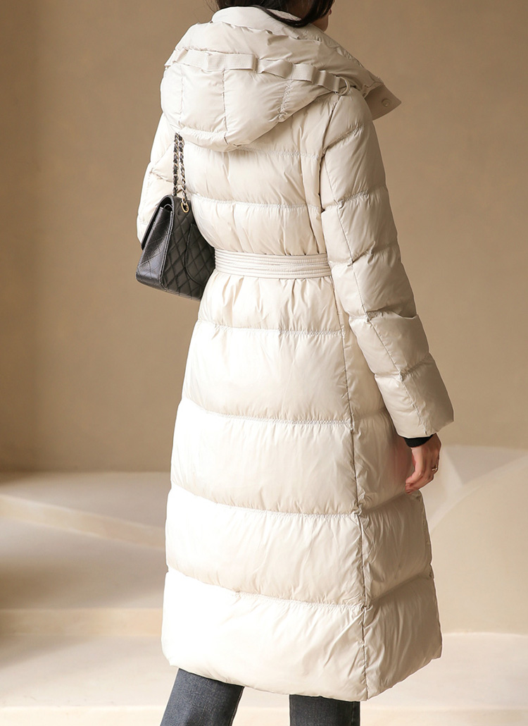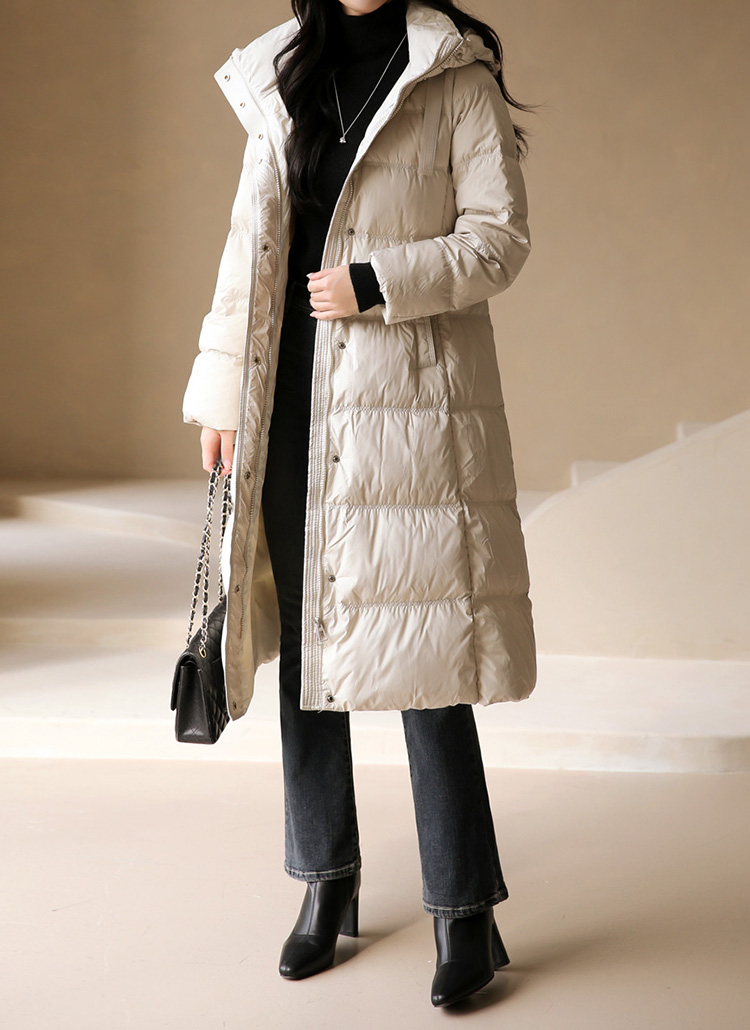 벨로티 페미닌라인 오리털 버클 하이넥후드 롱 패딩 점퍼