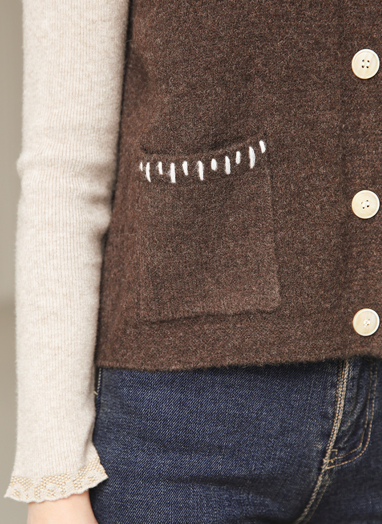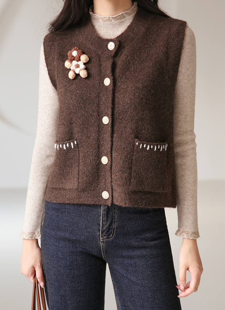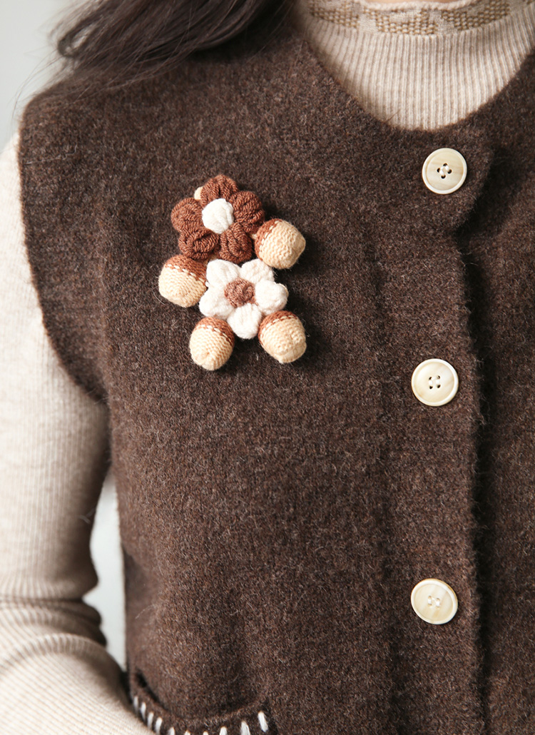 [A plush knit vest with a soft brushed feel, a fixed playful flower brooch, and stitched pocket accents, bringing warmth and charming detail to effortless daily outfits.]