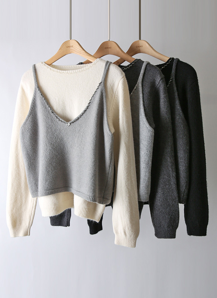 [This two-piece set blends a smooth boat-neck top with a slim V-neck vest adorned with glimmering beads and a petite heart detail for elevated styling.]