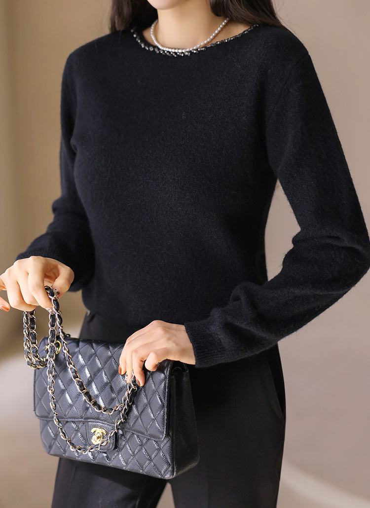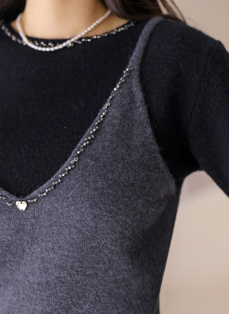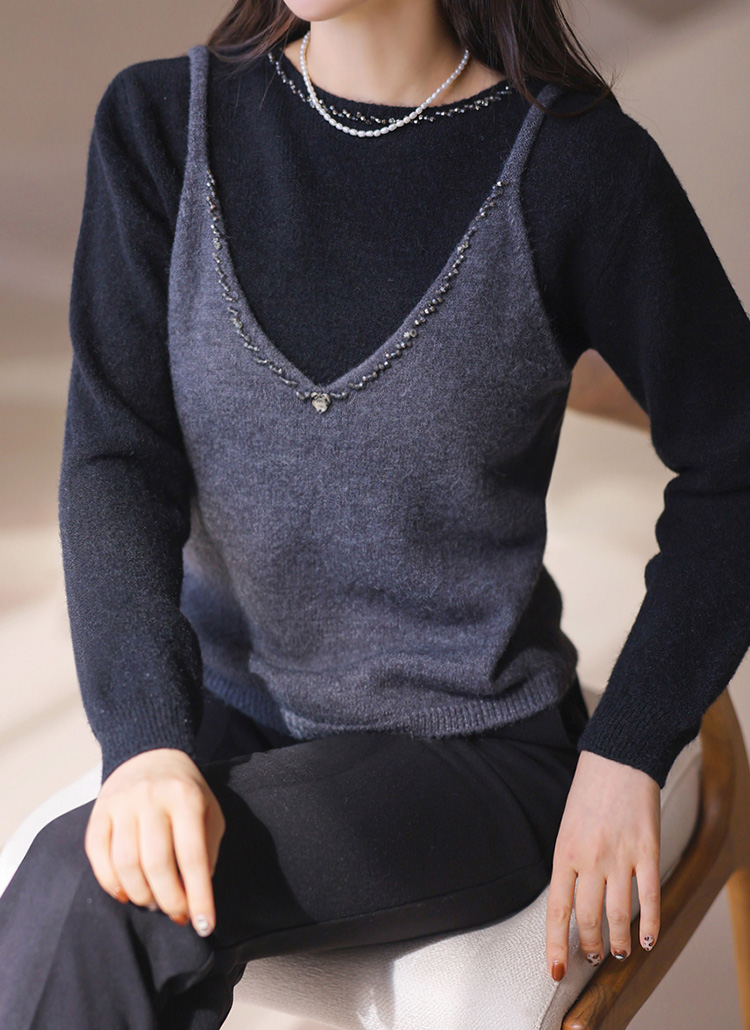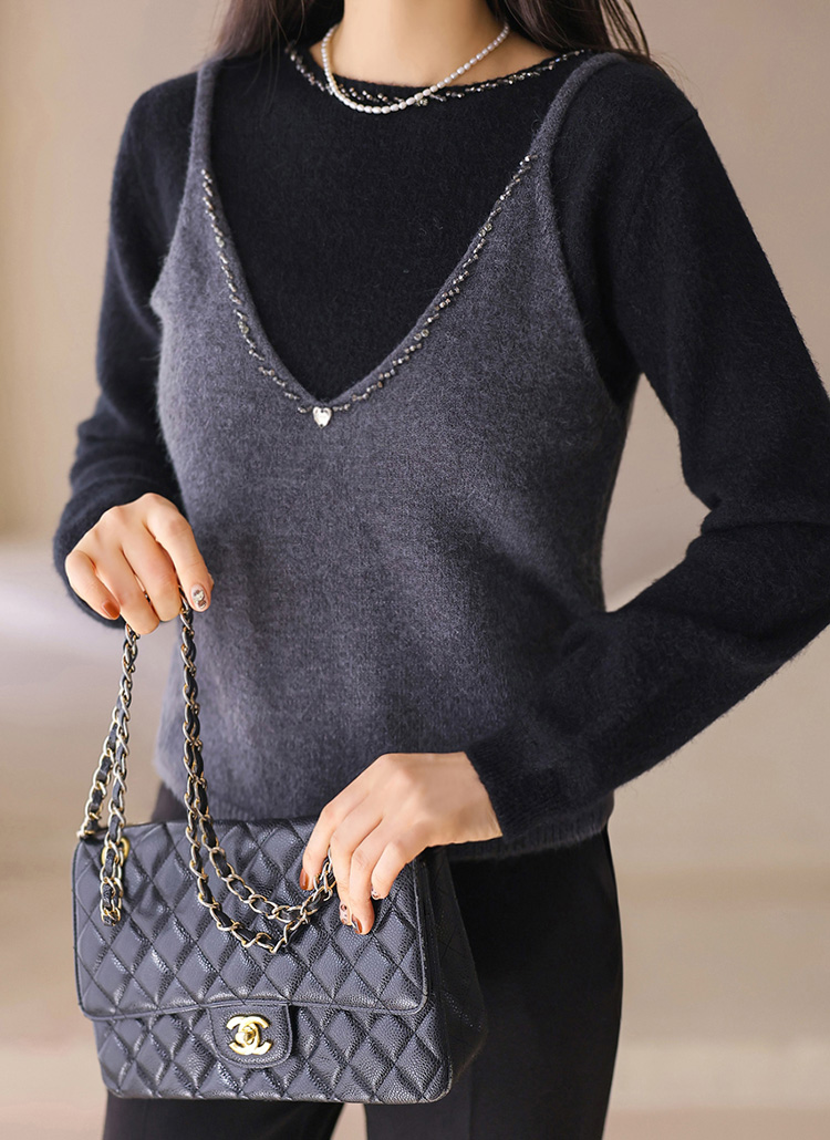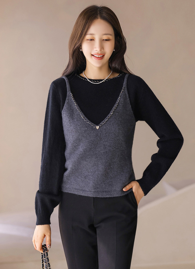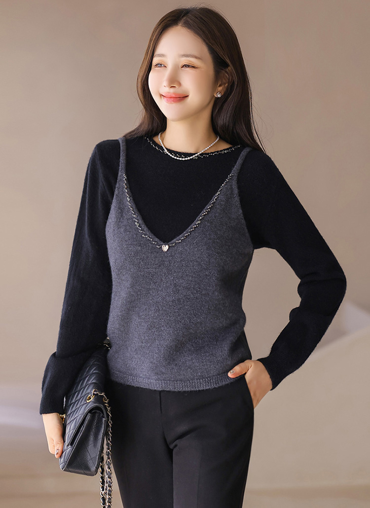 [This two-piece set blends a smooth boat-neck top with a slim V-neck vest adorned with glimmering beads and a petite heart detail for elevated styling.]