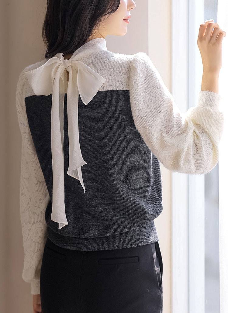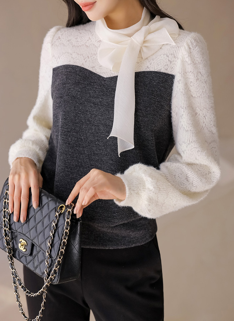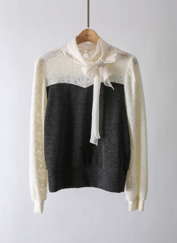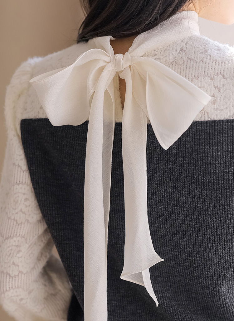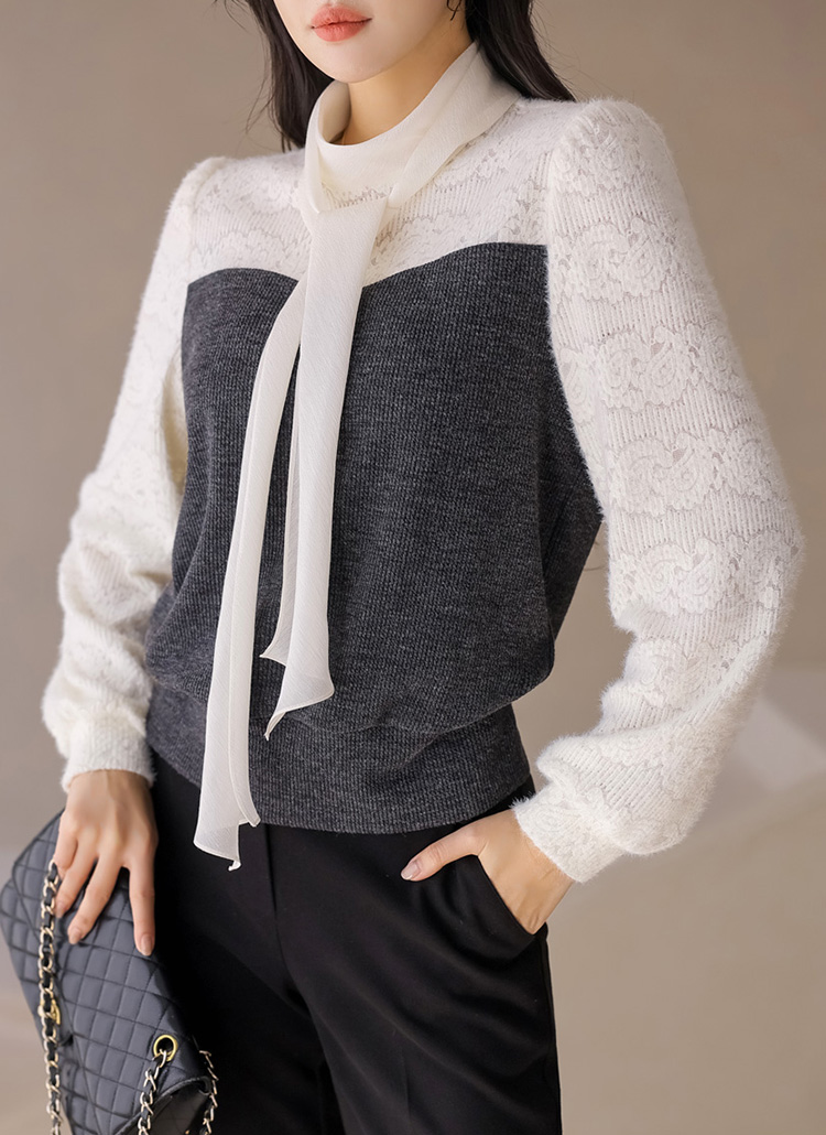 [A soft brushed lace sleeve design paired with a cozy ribbed body and a flowing ribbon tie that frames the neckline with graceful, feminine charm.]