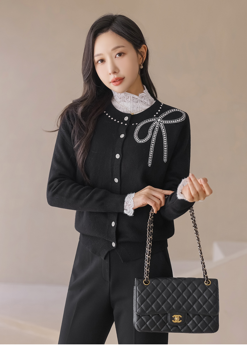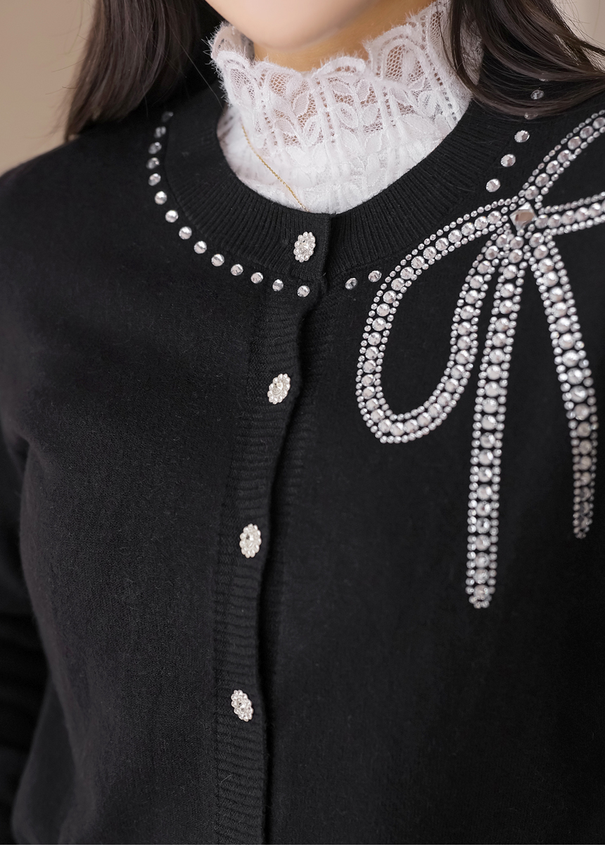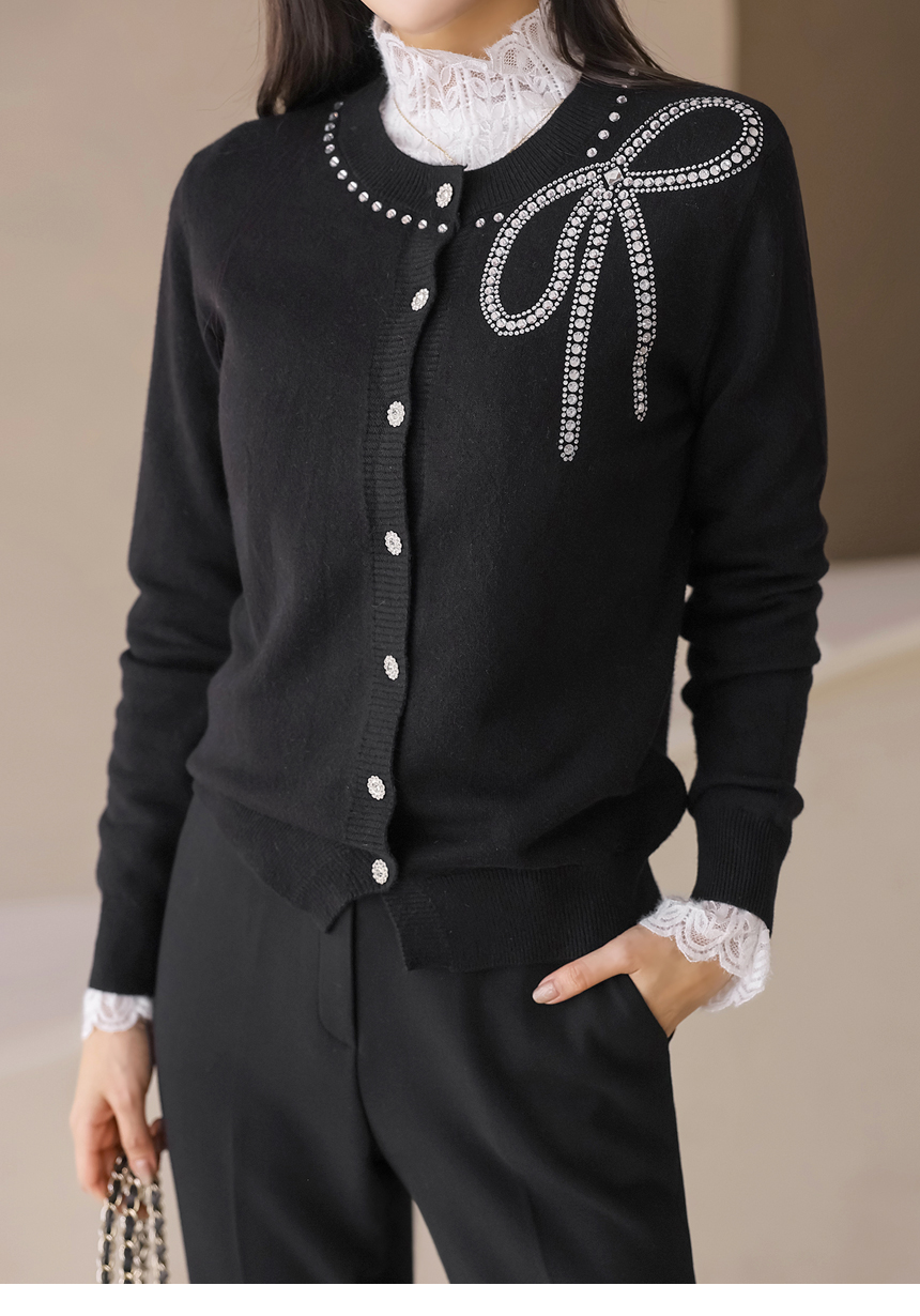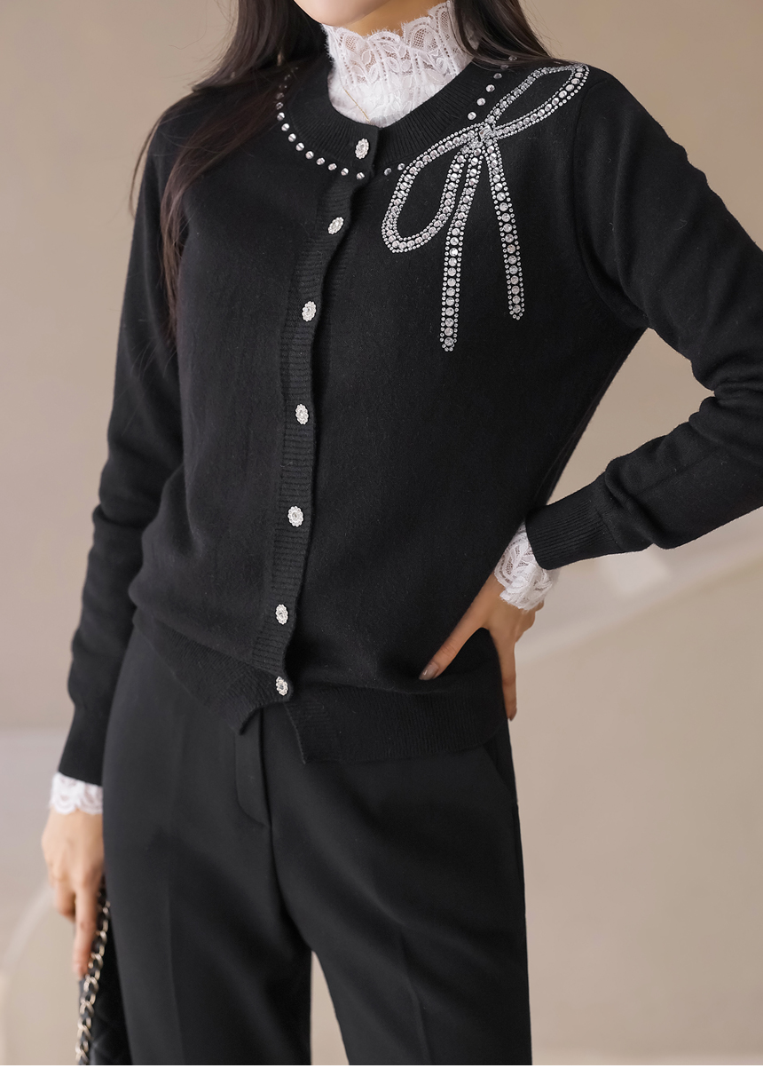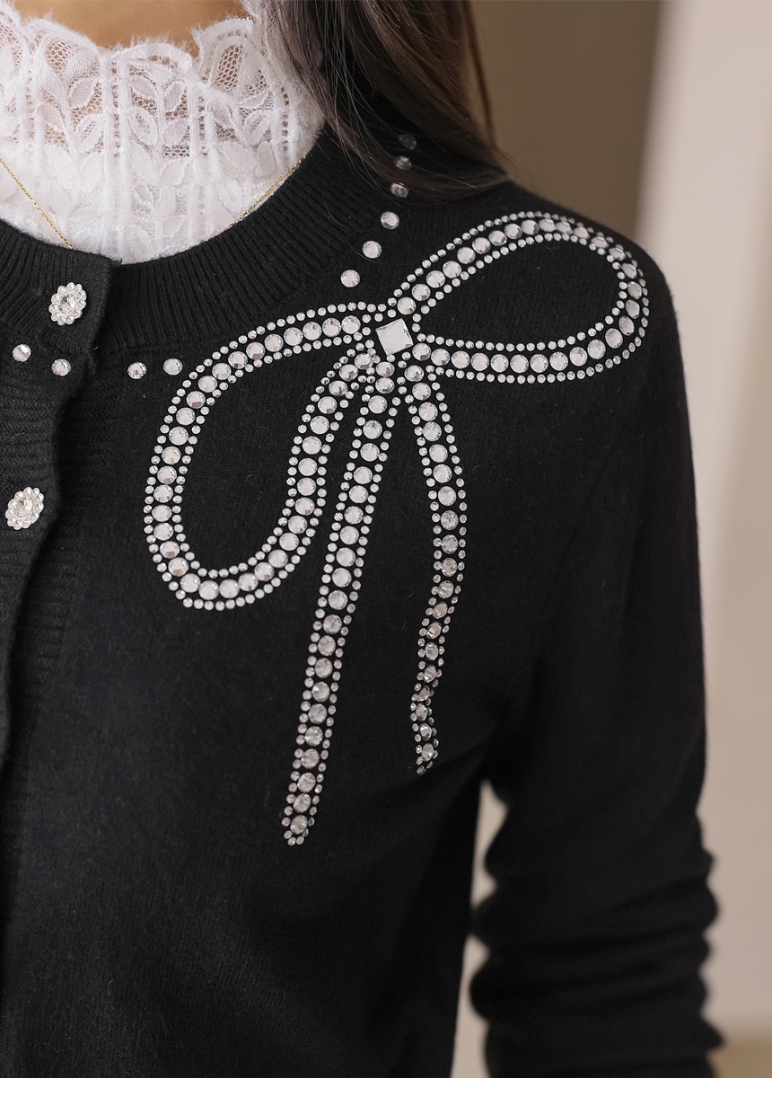 [Shimmering stones trace a graceful bow motif, adding refined sparkle to a slim, clean silhouette that layers effortlessly through the colder season.]