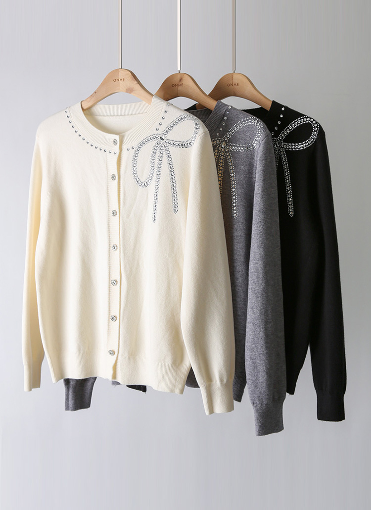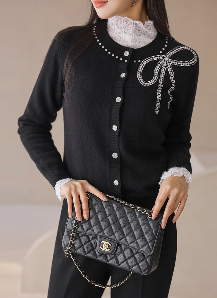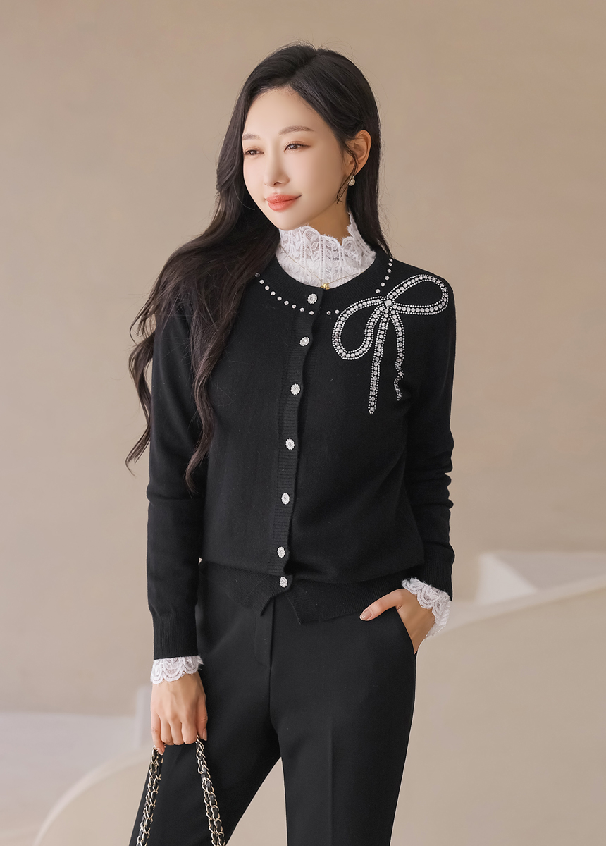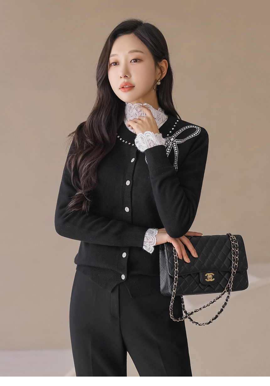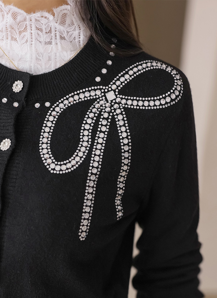 [Shimmering stones trace a graceful bow motif, adding refined sparkle to a slim, clean silhouette that layers effortlessly through the colder season.]