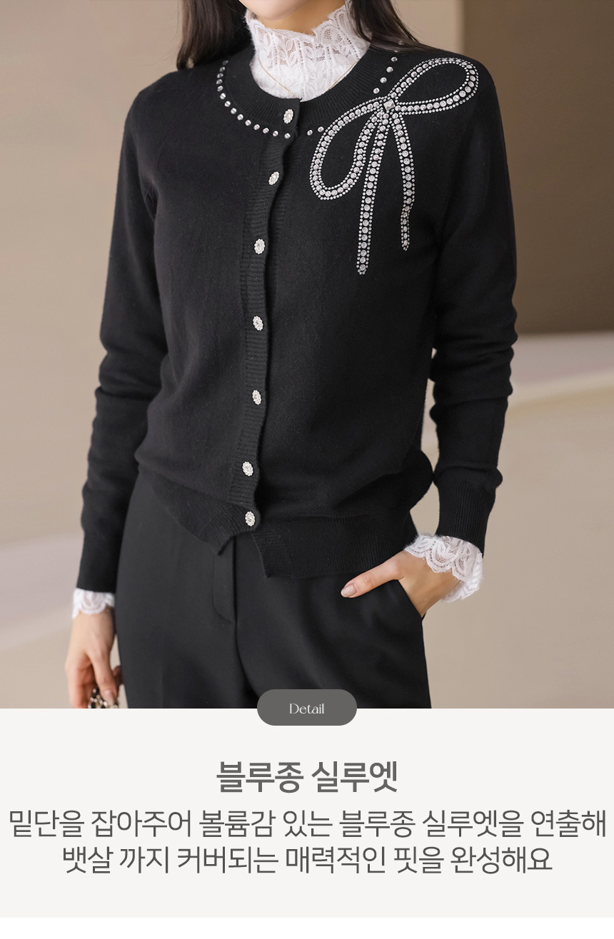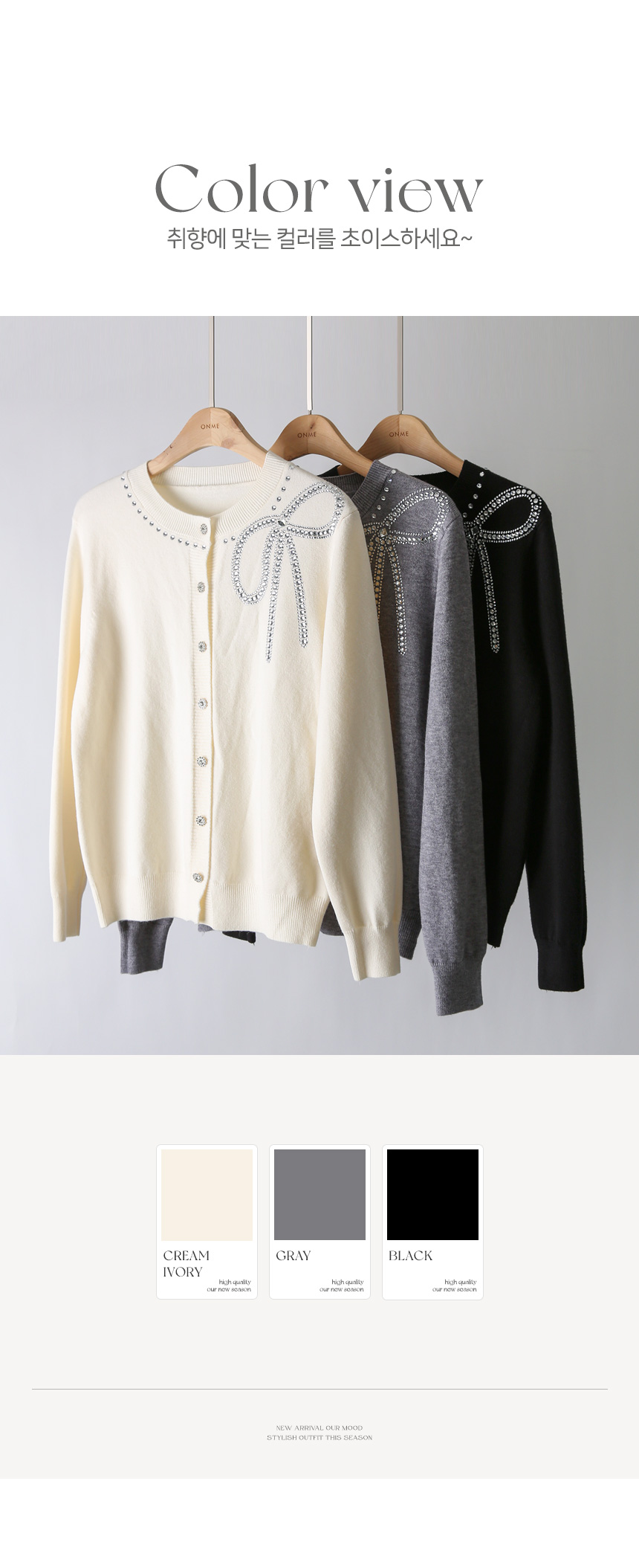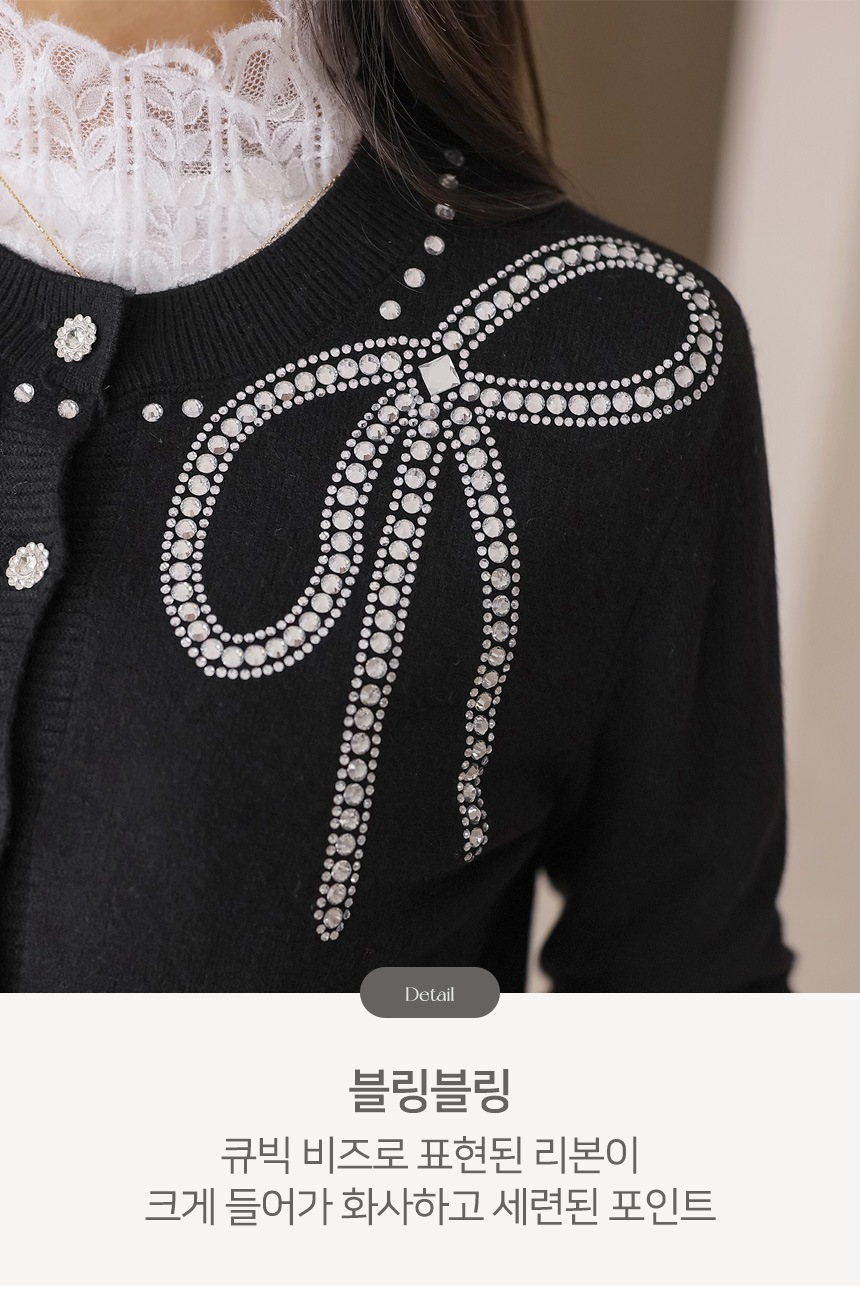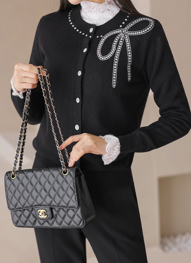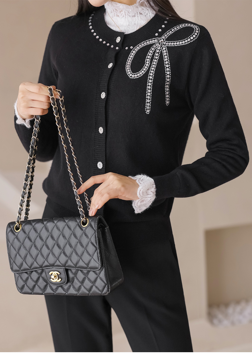 [Shimmering stones trace a graceful bow motif, adding refined sparkle to a slim, clean silhouette that layers effortlessly through the colder season.]
