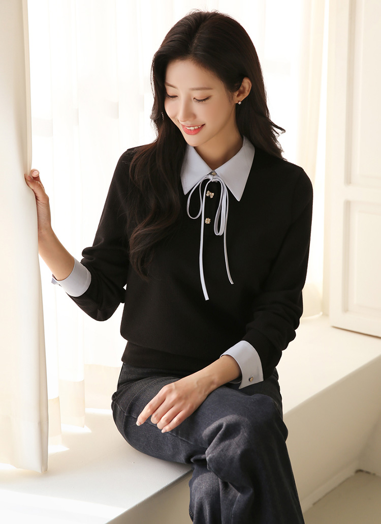 [A sleek blouse tee featuring a contrast crisp collar, cuffs, and a delicate tie, offering a unique mix of elegance and comfort for versatile styling.]