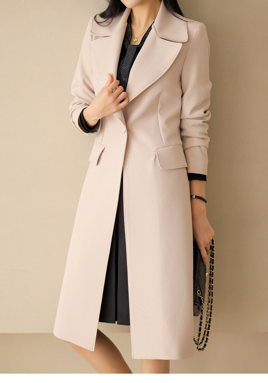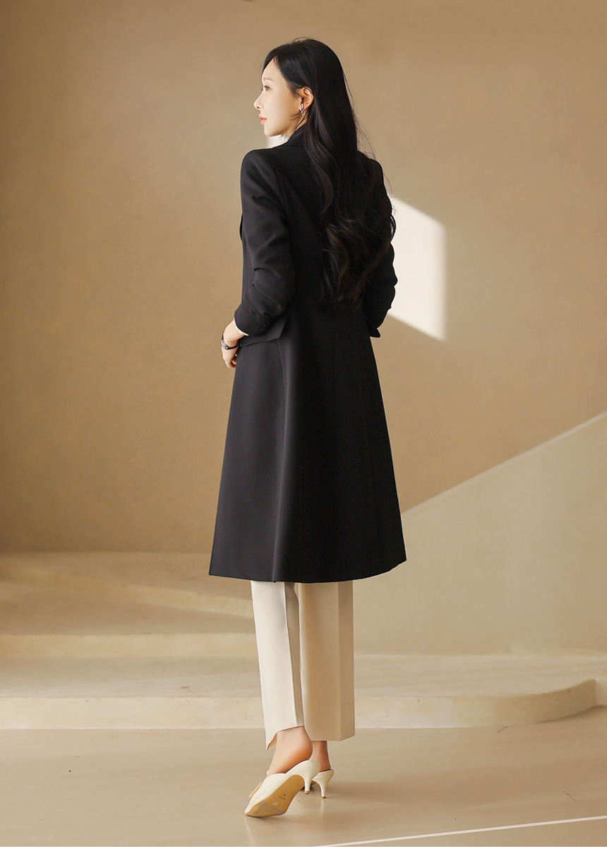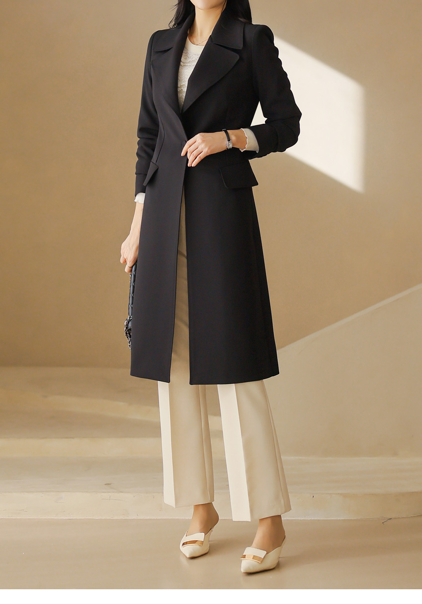 [A smooth single-button closure and wide lapels frame a modern, elongated shape, delivering warm structure and an effortlessly sophisticated presence in cool weather.]