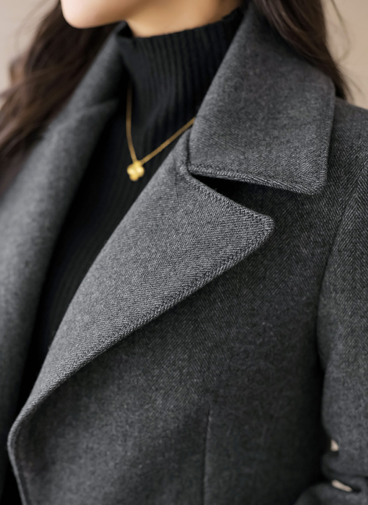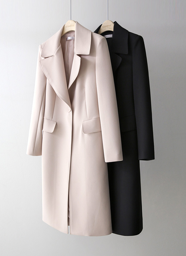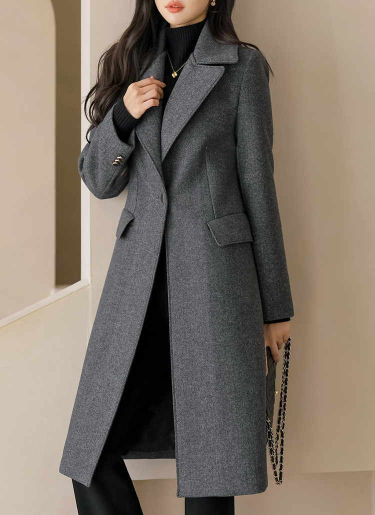 [A smooth single-button closure and wide lapels frame a modern, elongated shape, delivering warm structure and an effortlessly sophisticated presence in cool weather.]