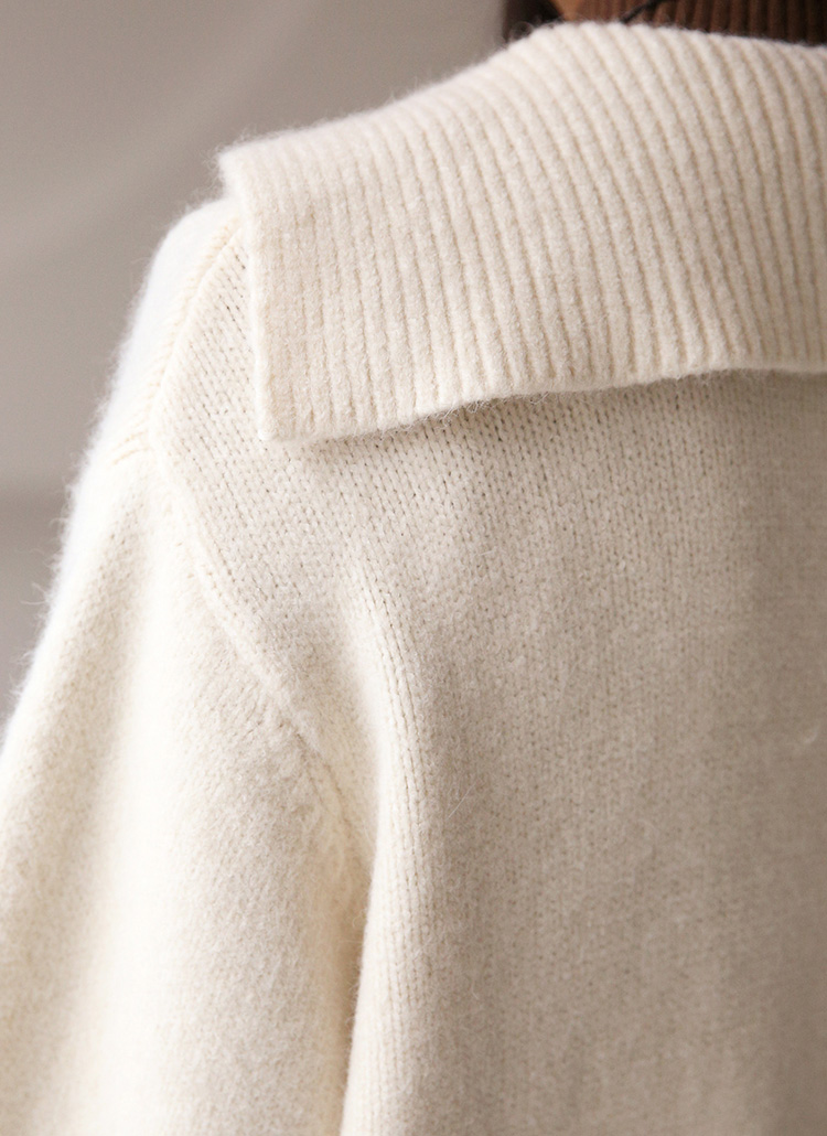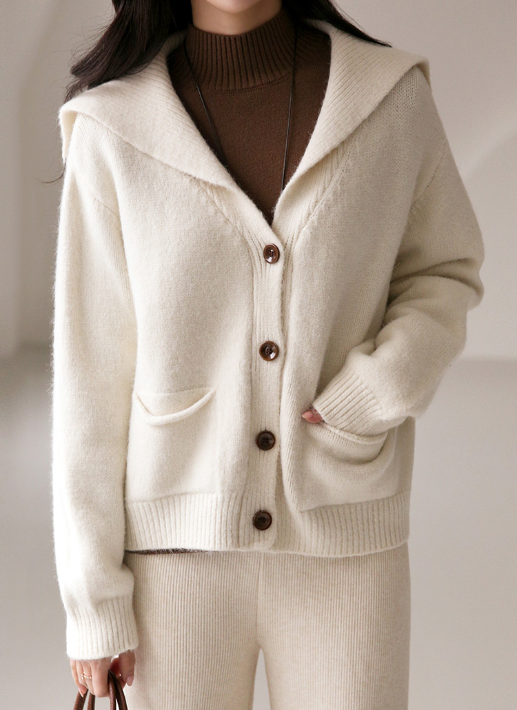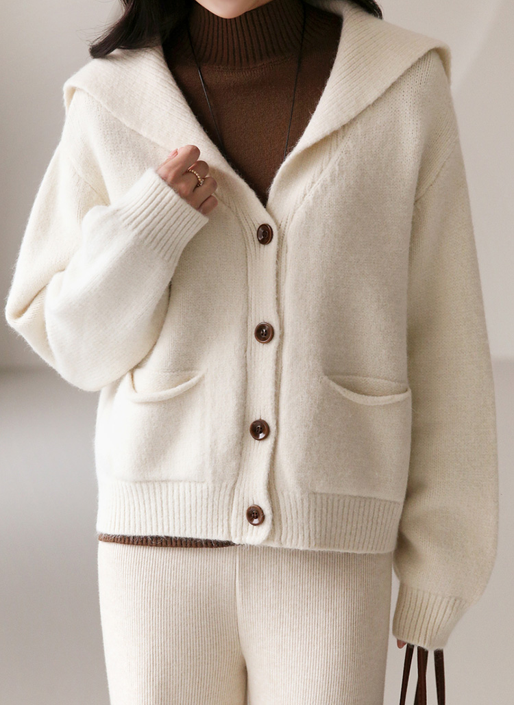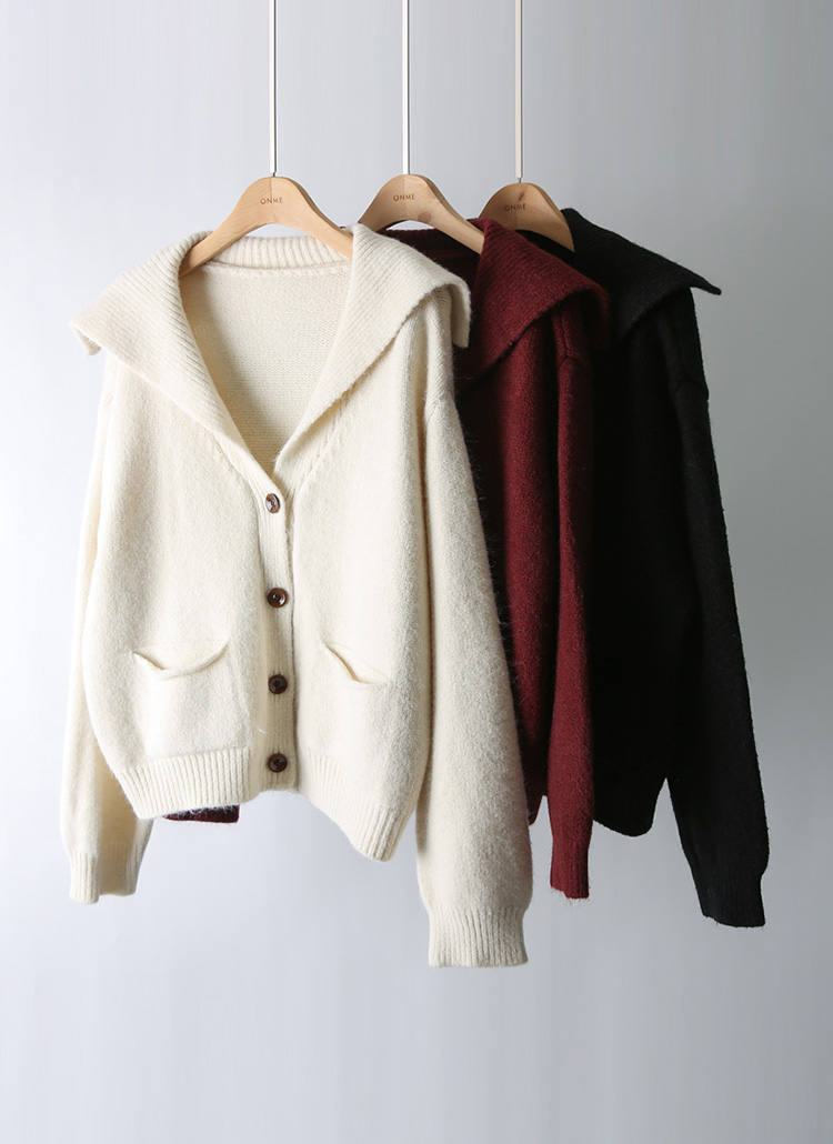 [This gentle, loose-fit cardigan blends a soft sailor collar with a flattering V shape, adding warmth and style while front pockets bring a playful touch.]
