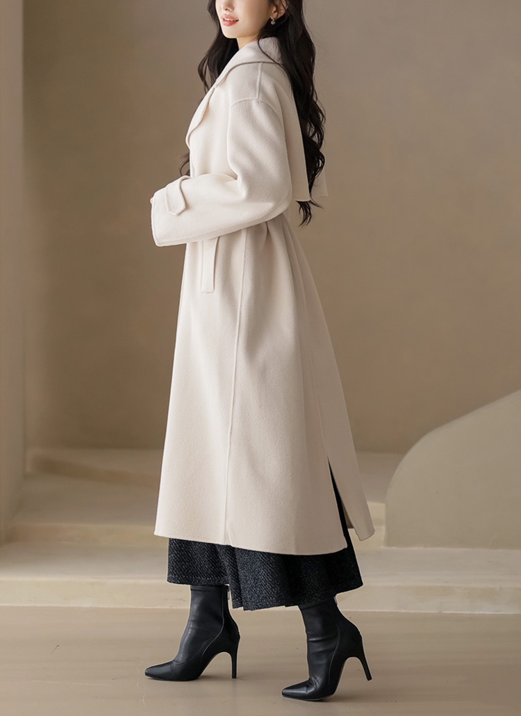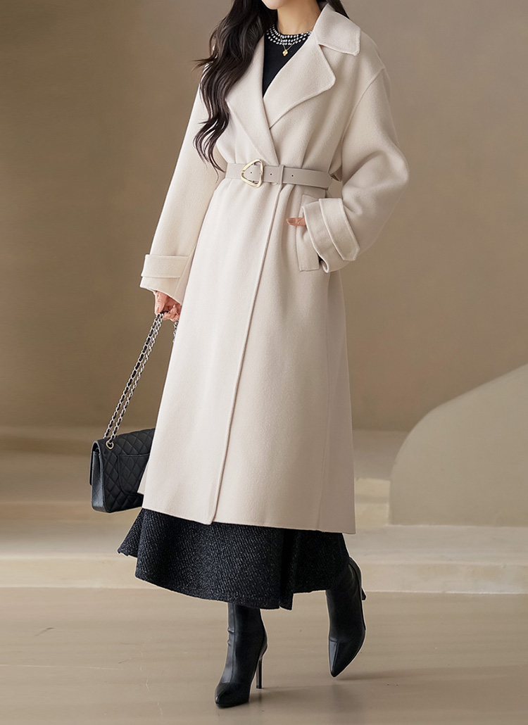 [A softly structured long coat in pure wool, finished with a sculpting leather belt and wide lapels that frame the face while creating a timeless, graceful silhouette.]