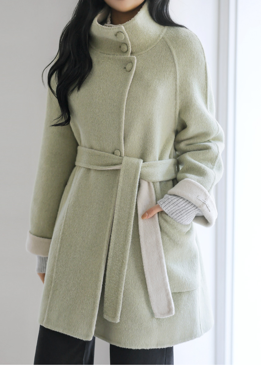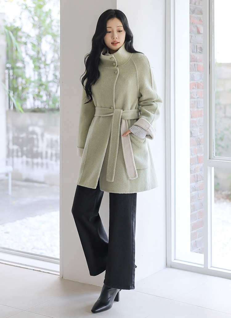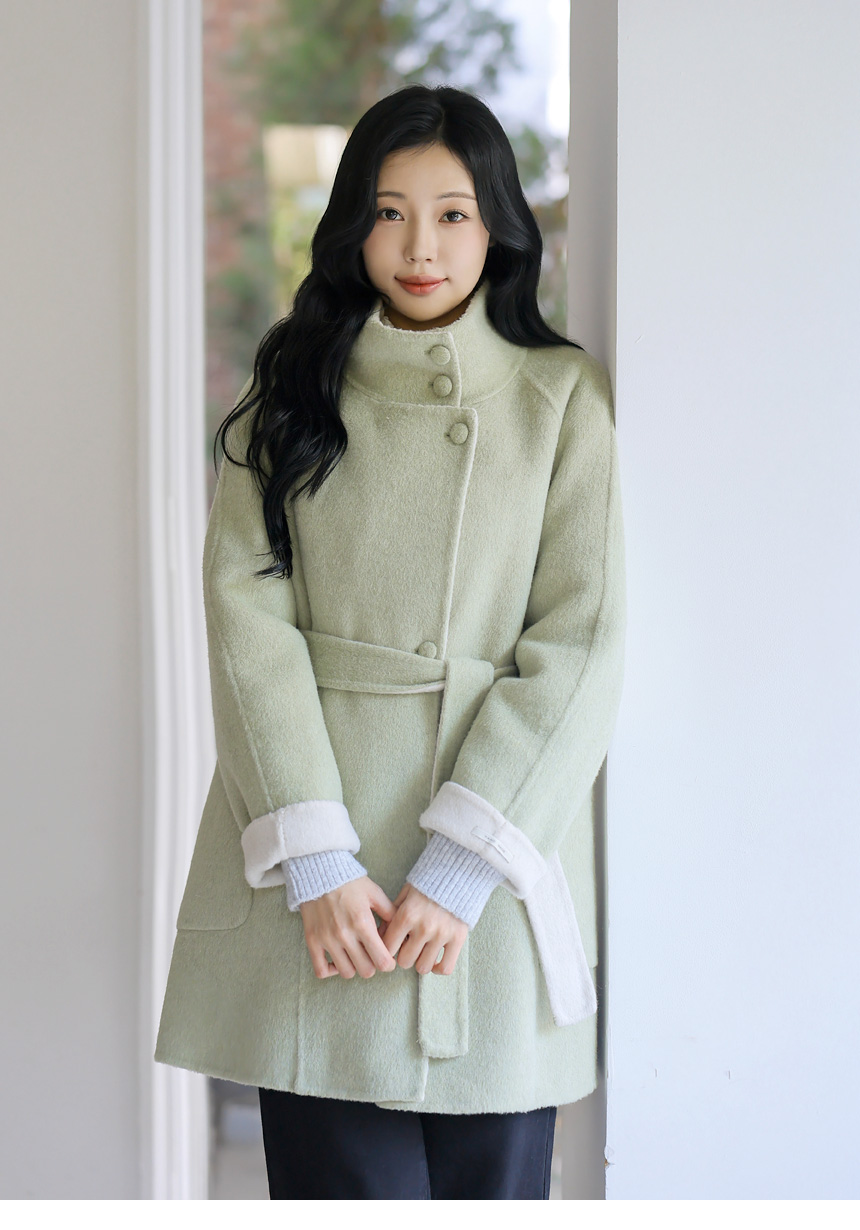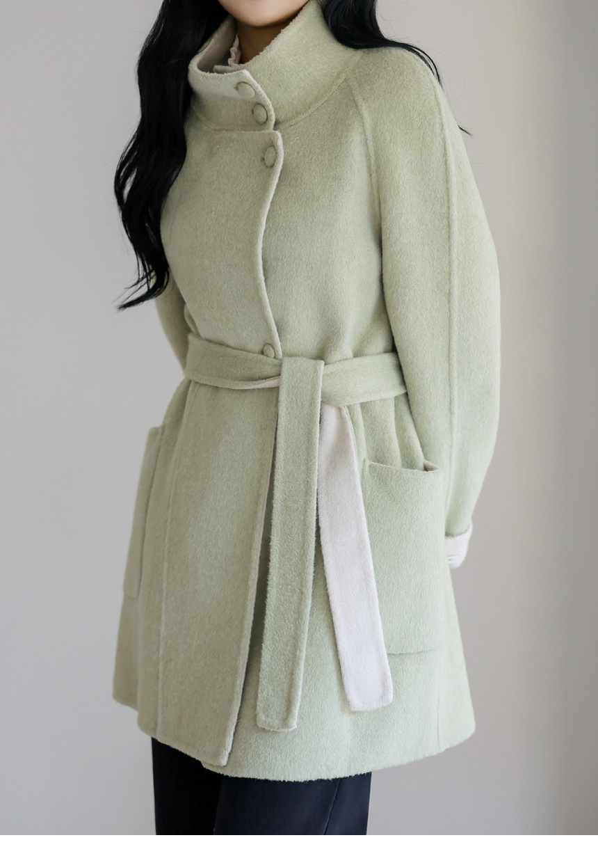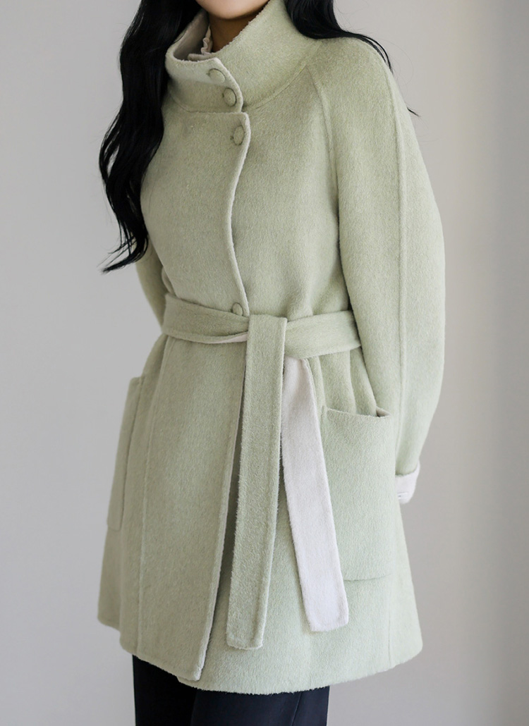[The Onme] Soft Pastel High-Neck Belted Wool-Blend Coat