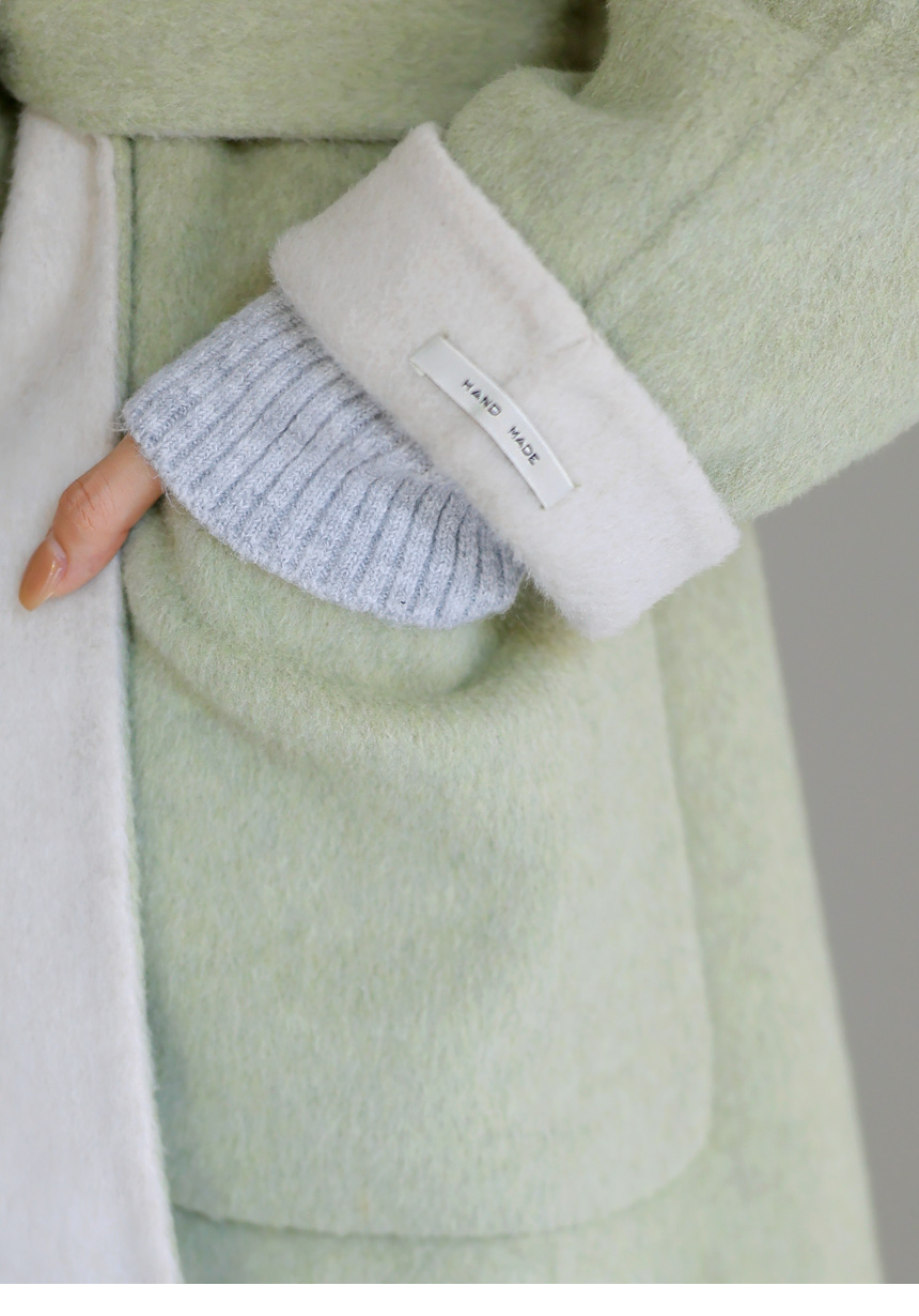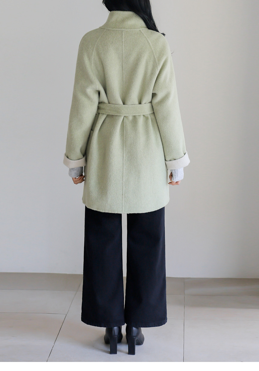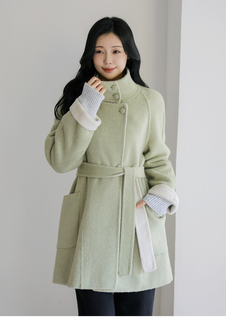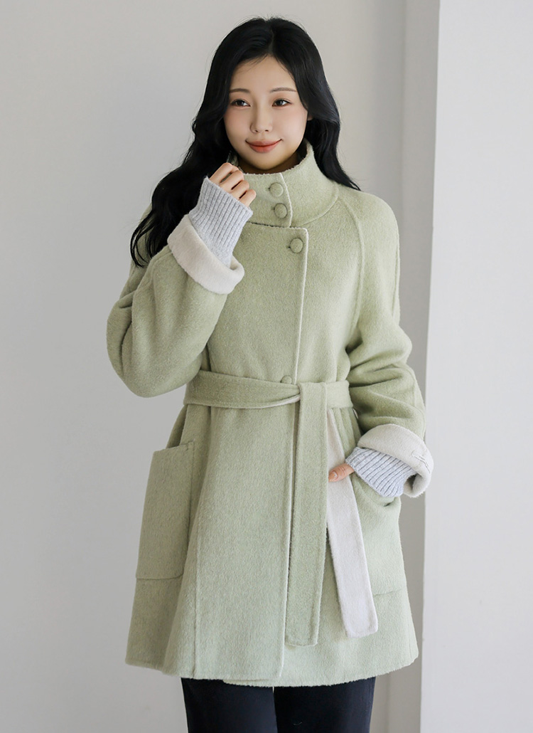 [The Onme] Soft Pastel High-Neck Belted Wool-Blend Coat