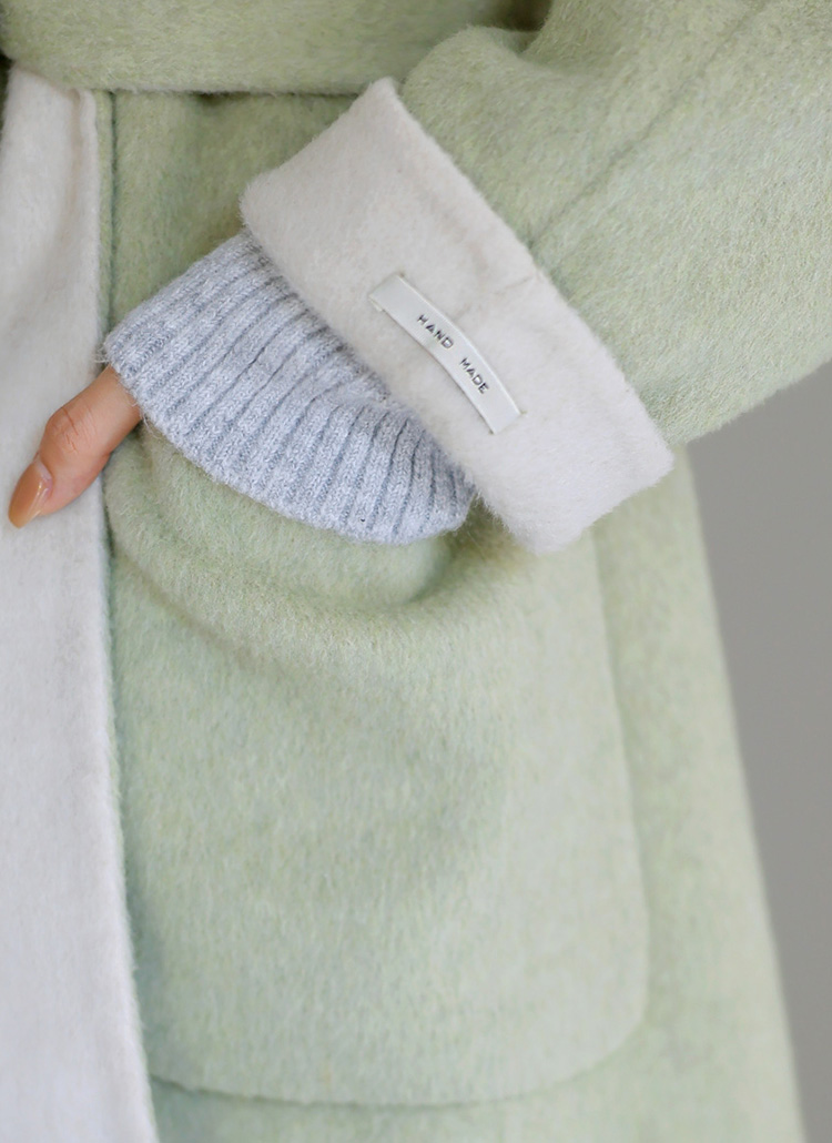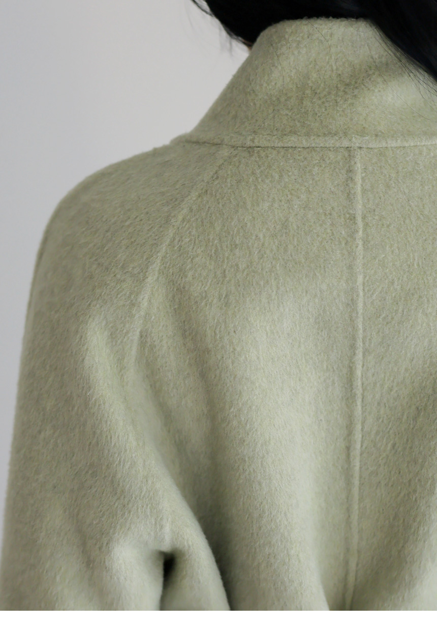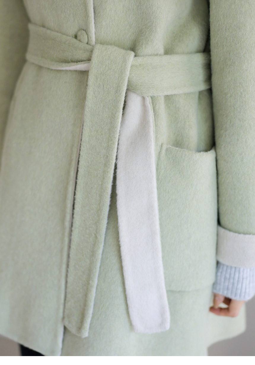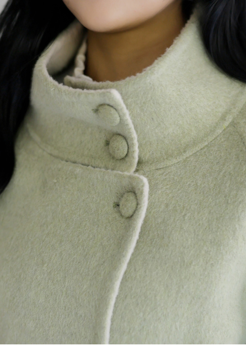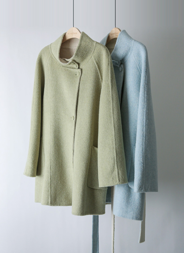 [A cozy half coat in a rare pastel shade, featuring a convertible high neck, raglan lines, and a belted silhouette that brings warmth and modern elegance to everyday looks.]