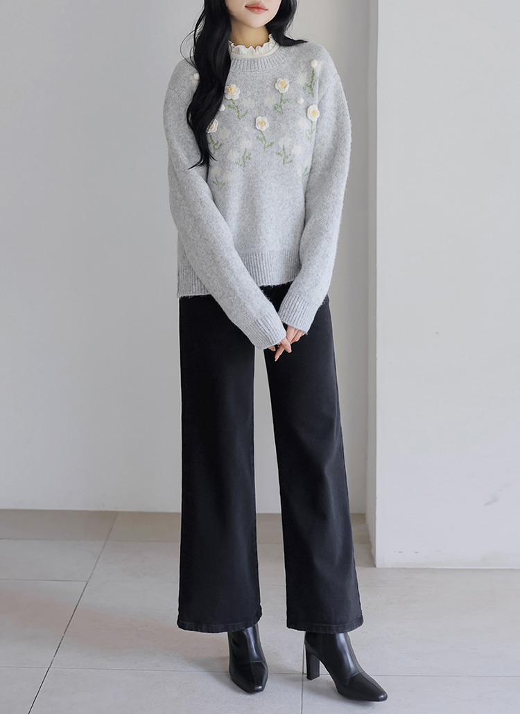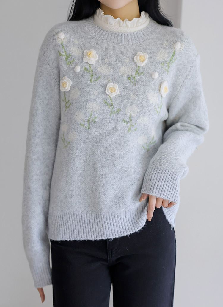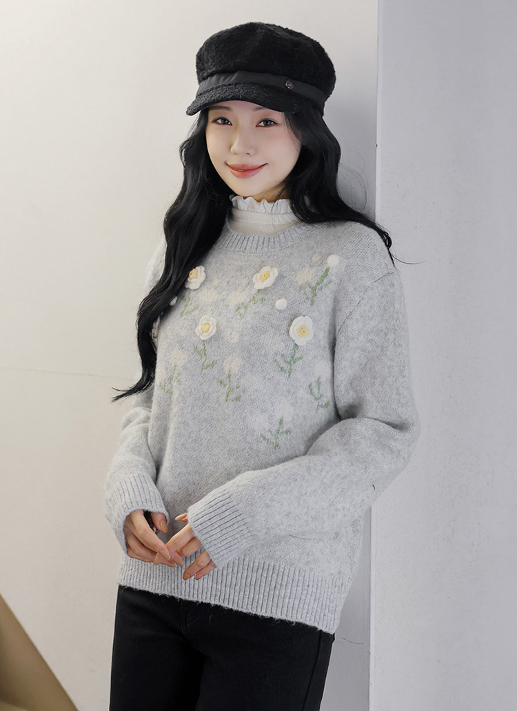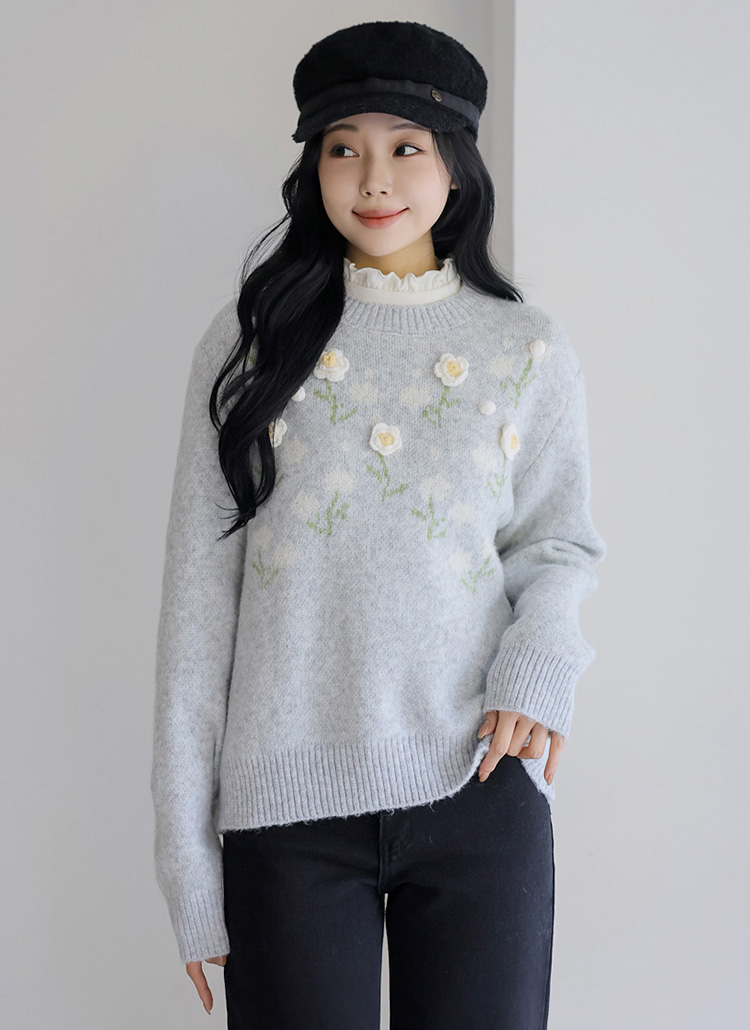 [The Onme] Cozy Petal Accent Embroidered Flower Knit Top