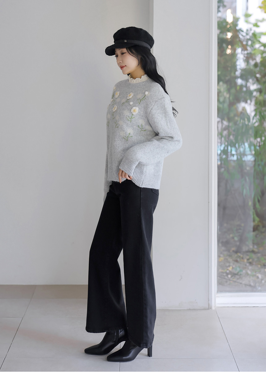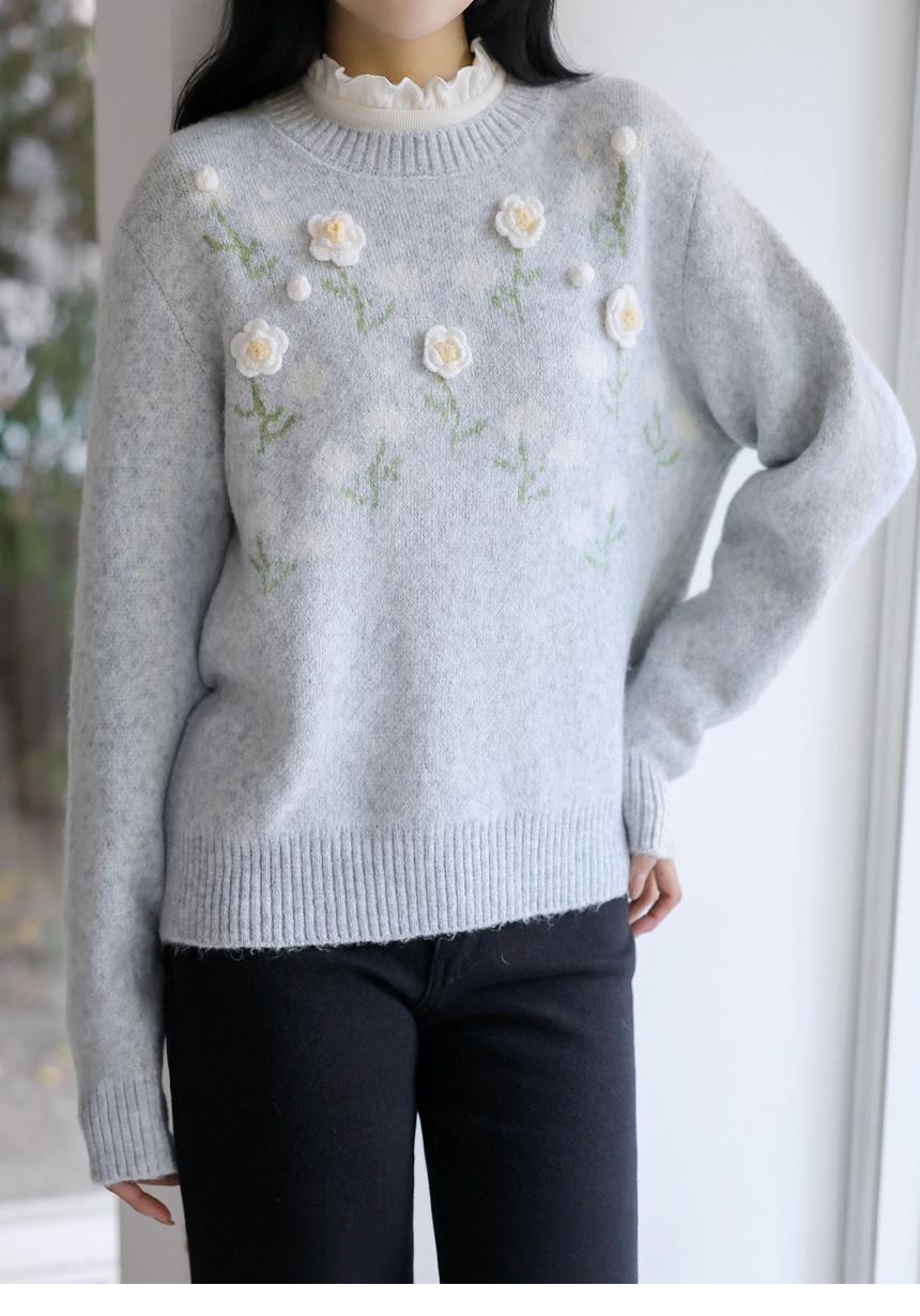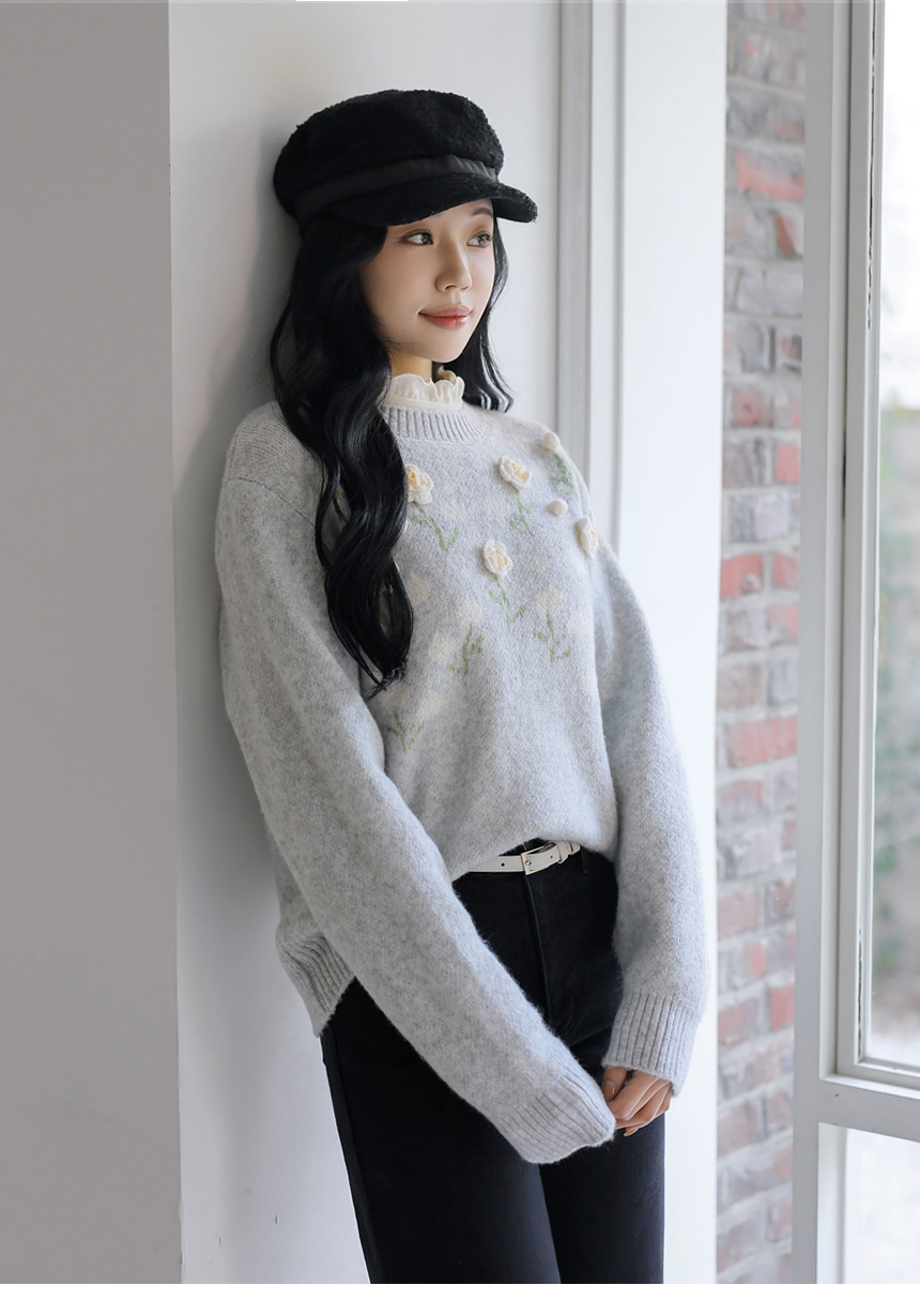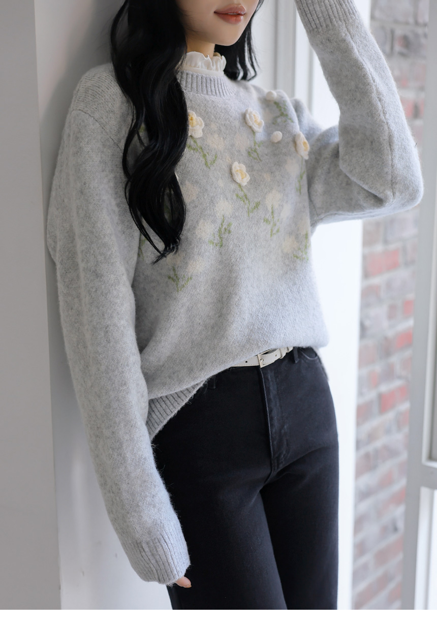 [The Onme] Cozy Petal Accent Embroidered Flower Knit Top