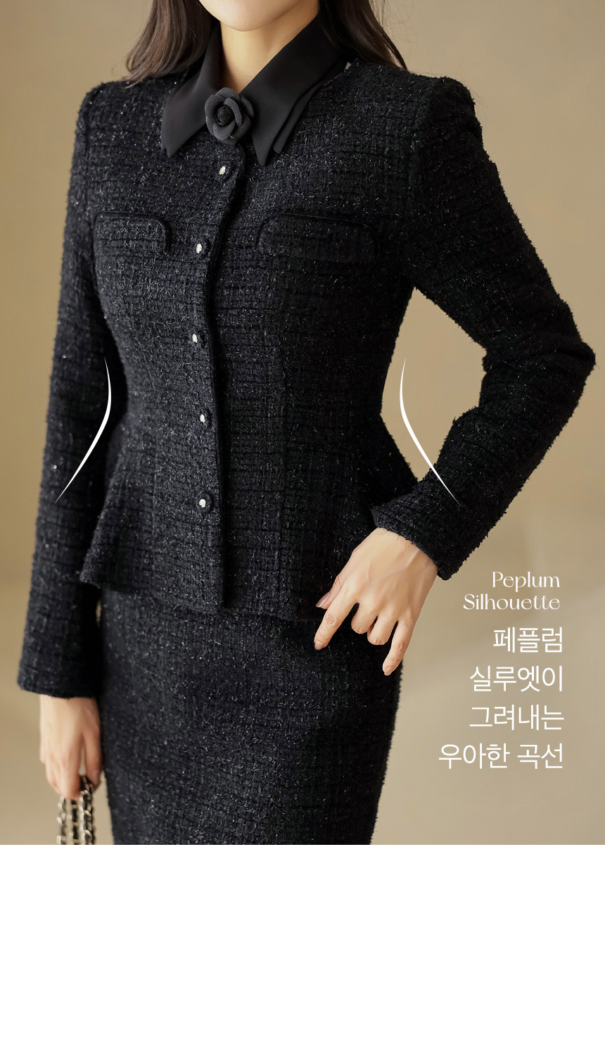 허리를 따라 자연스레 퍼지는 페플럼 라인이 여성스러운 곡선을 고급스럽게 드러내주고