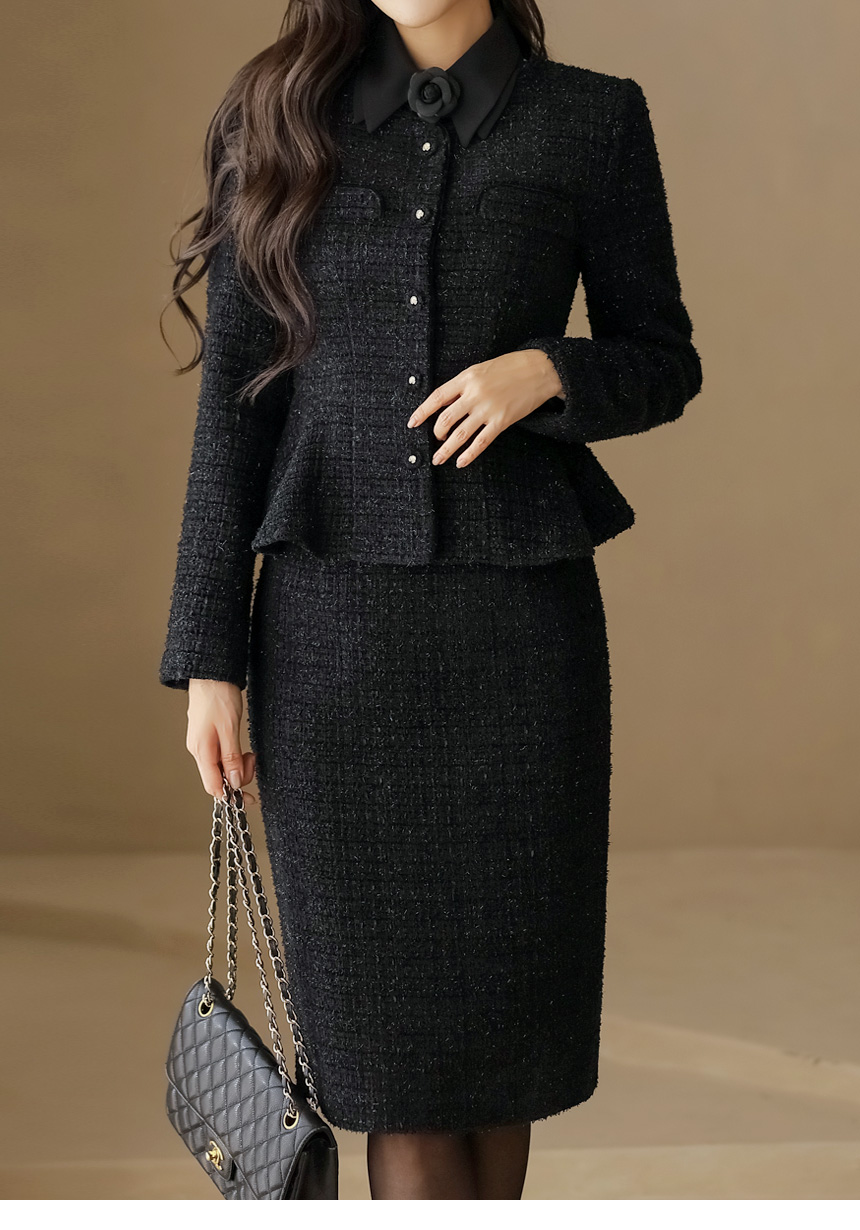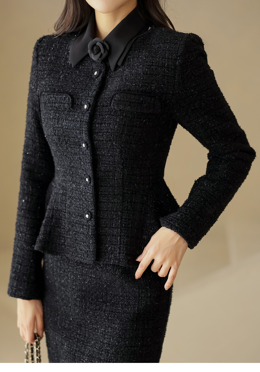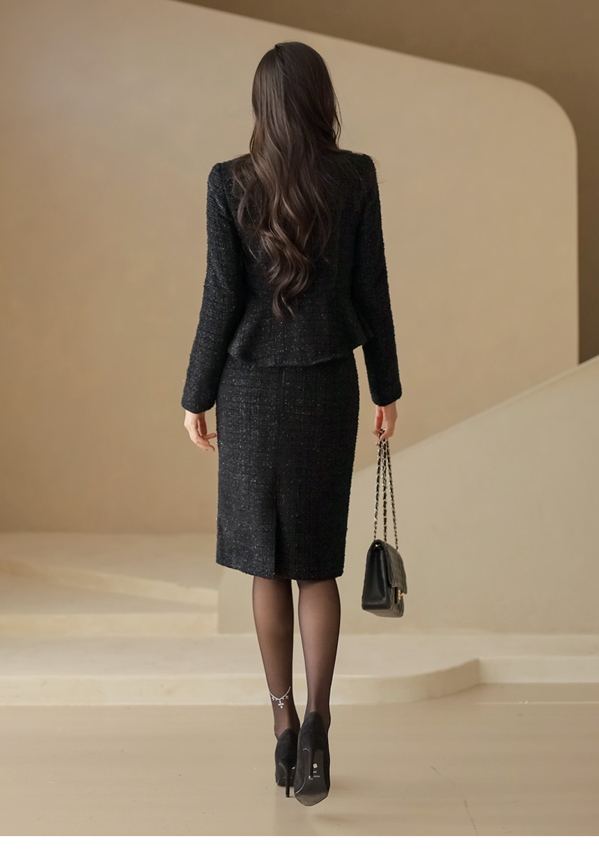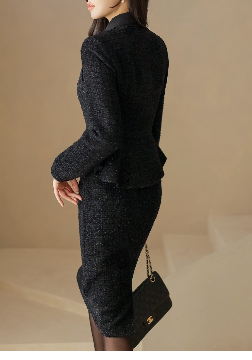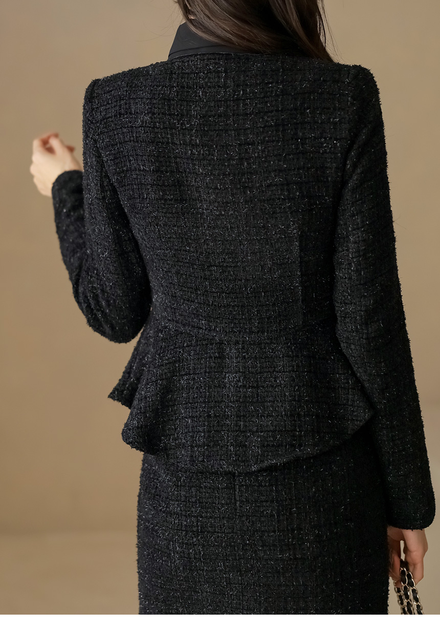 [Rich textured tweed with subtle metallic shine forms a graceful peplum line that flatters the waist, offering timeless sophistication for any setting.]