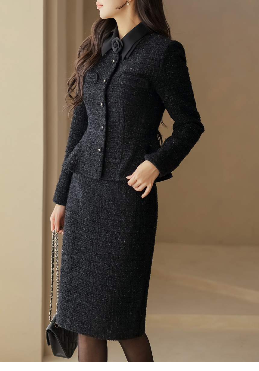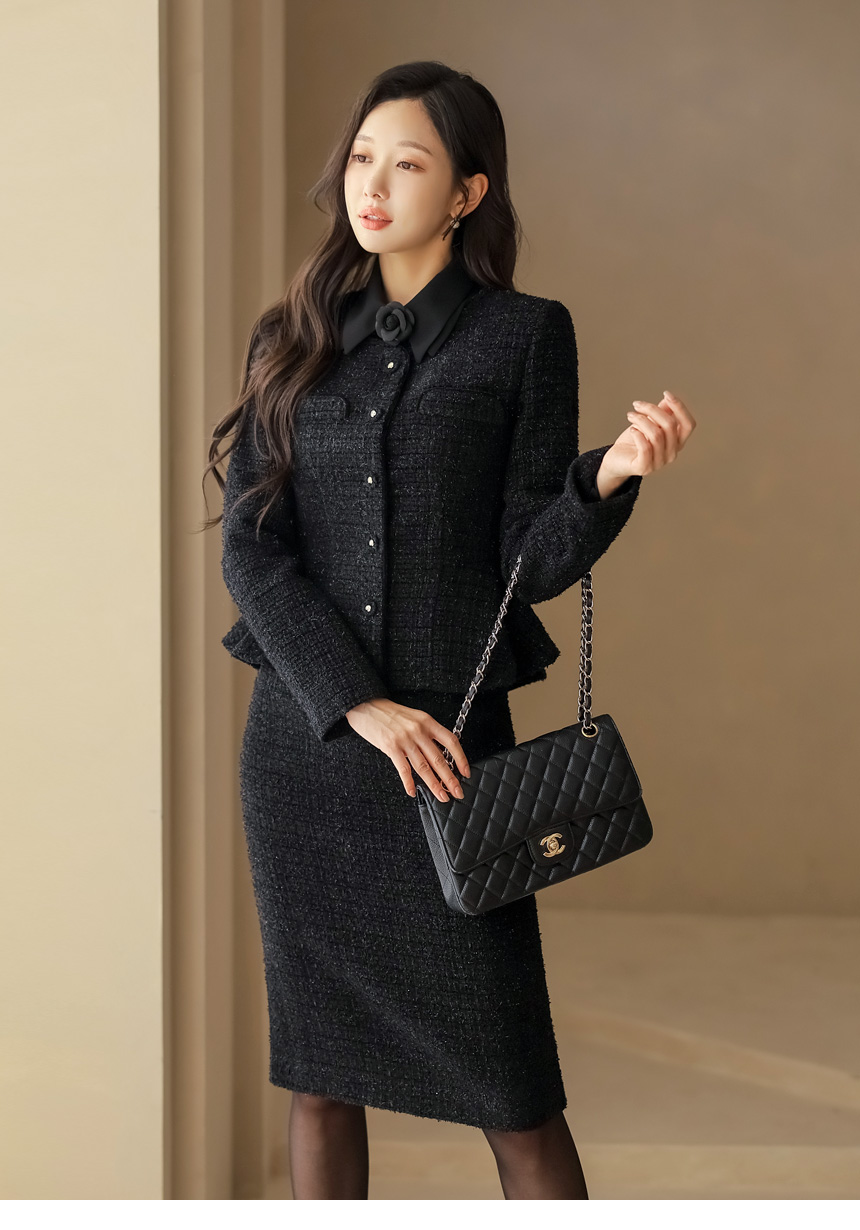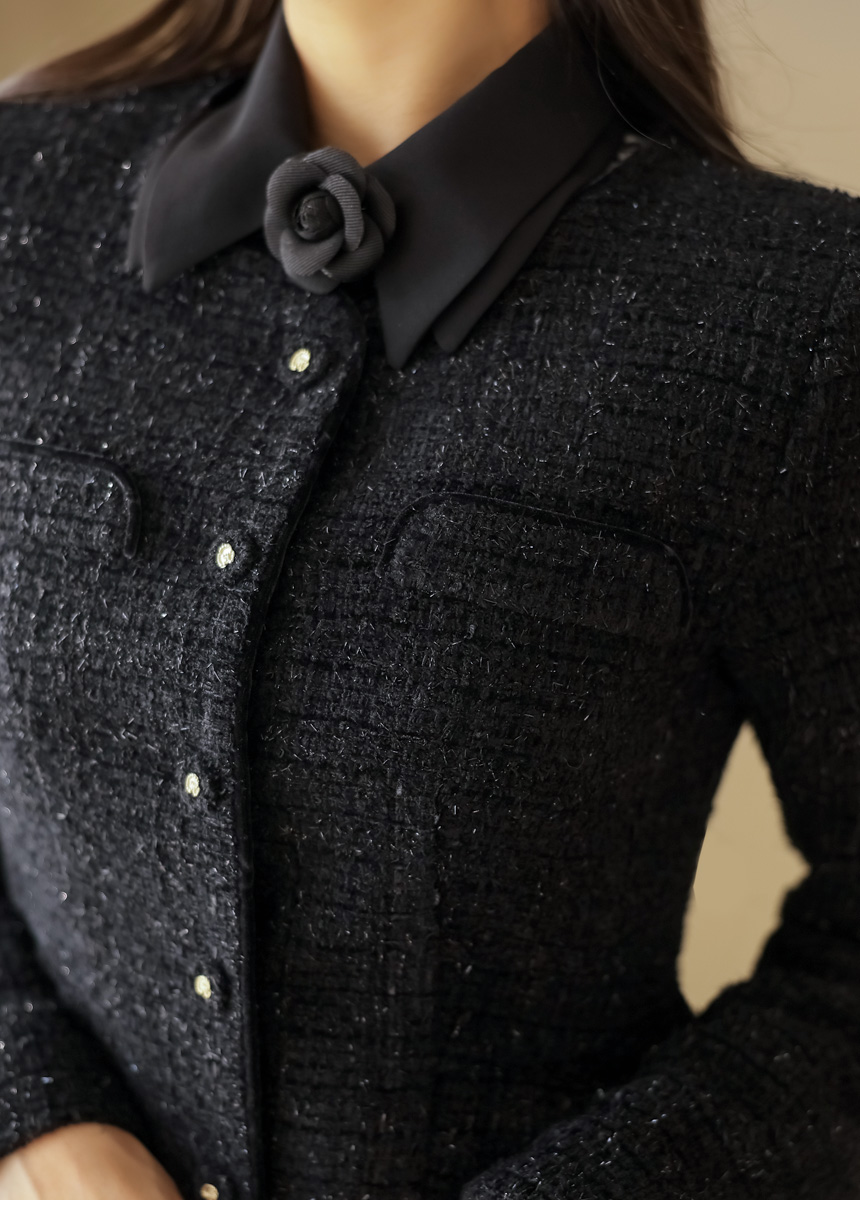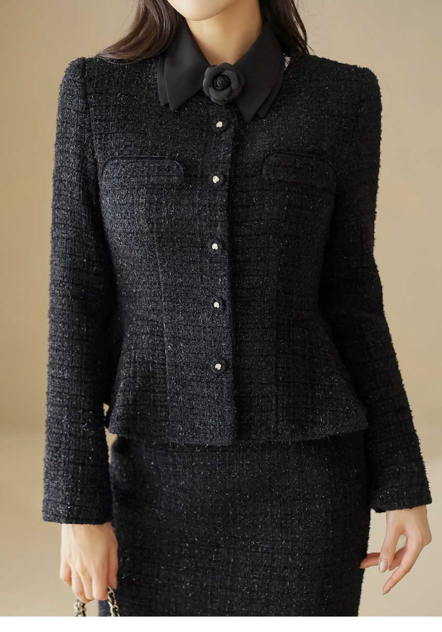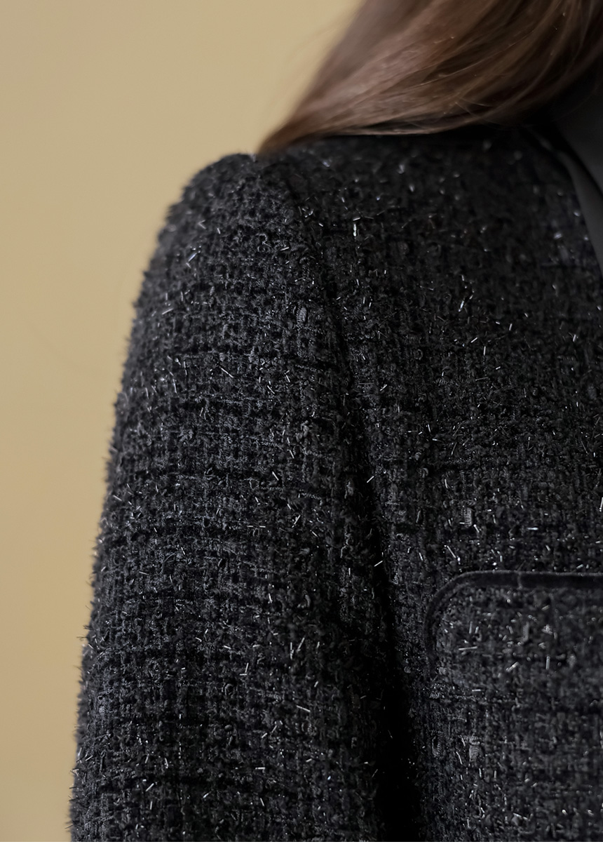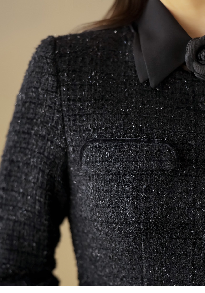 [Rich textured tweed with subtle metallic shine forms a graceful peplum line that flatters the waist, offering timeless sophistication for any setting.]