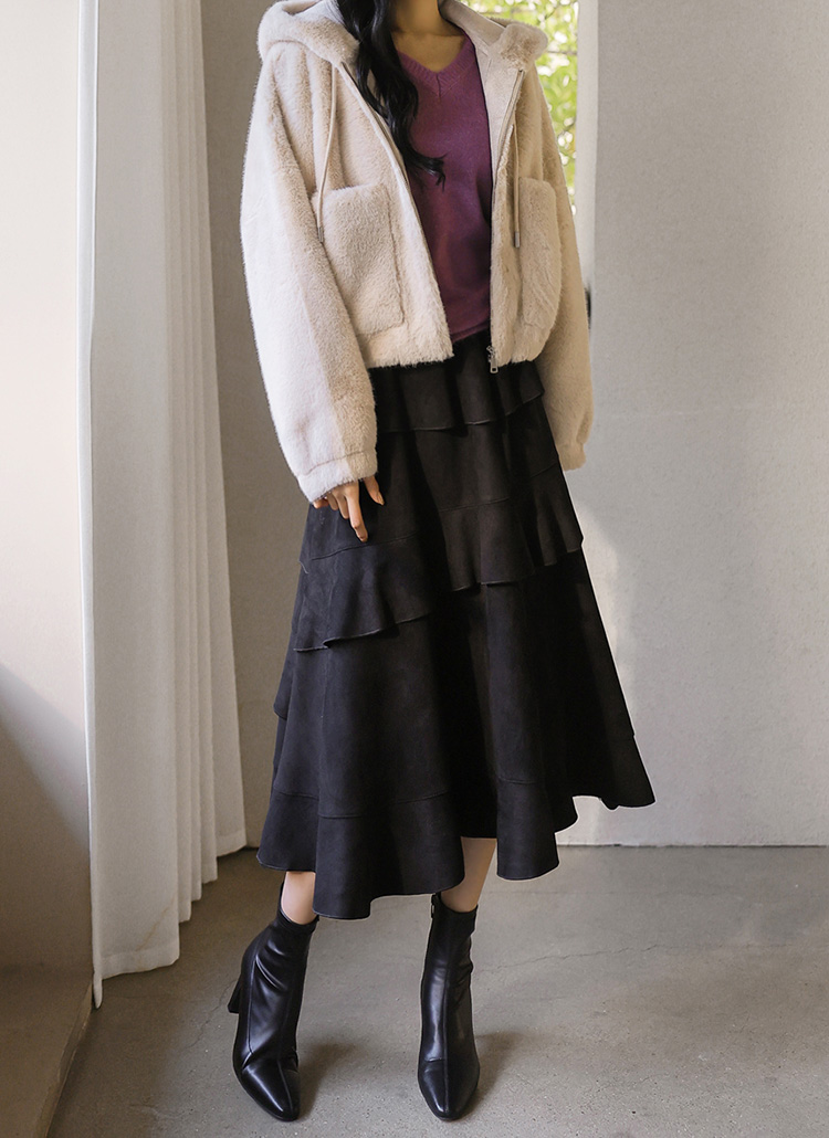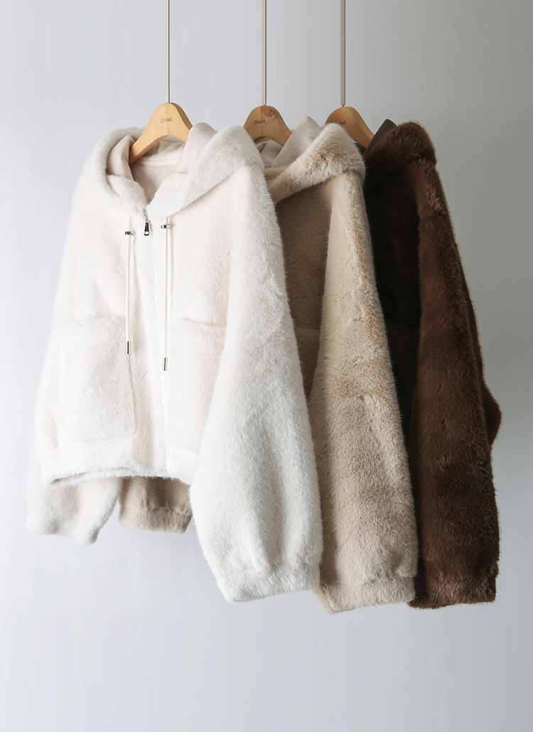 [Velvety fur and an airy silhouette offer snug comfort while the hood and big pockets add charm and function, making cold-weather dressing feel playful.]