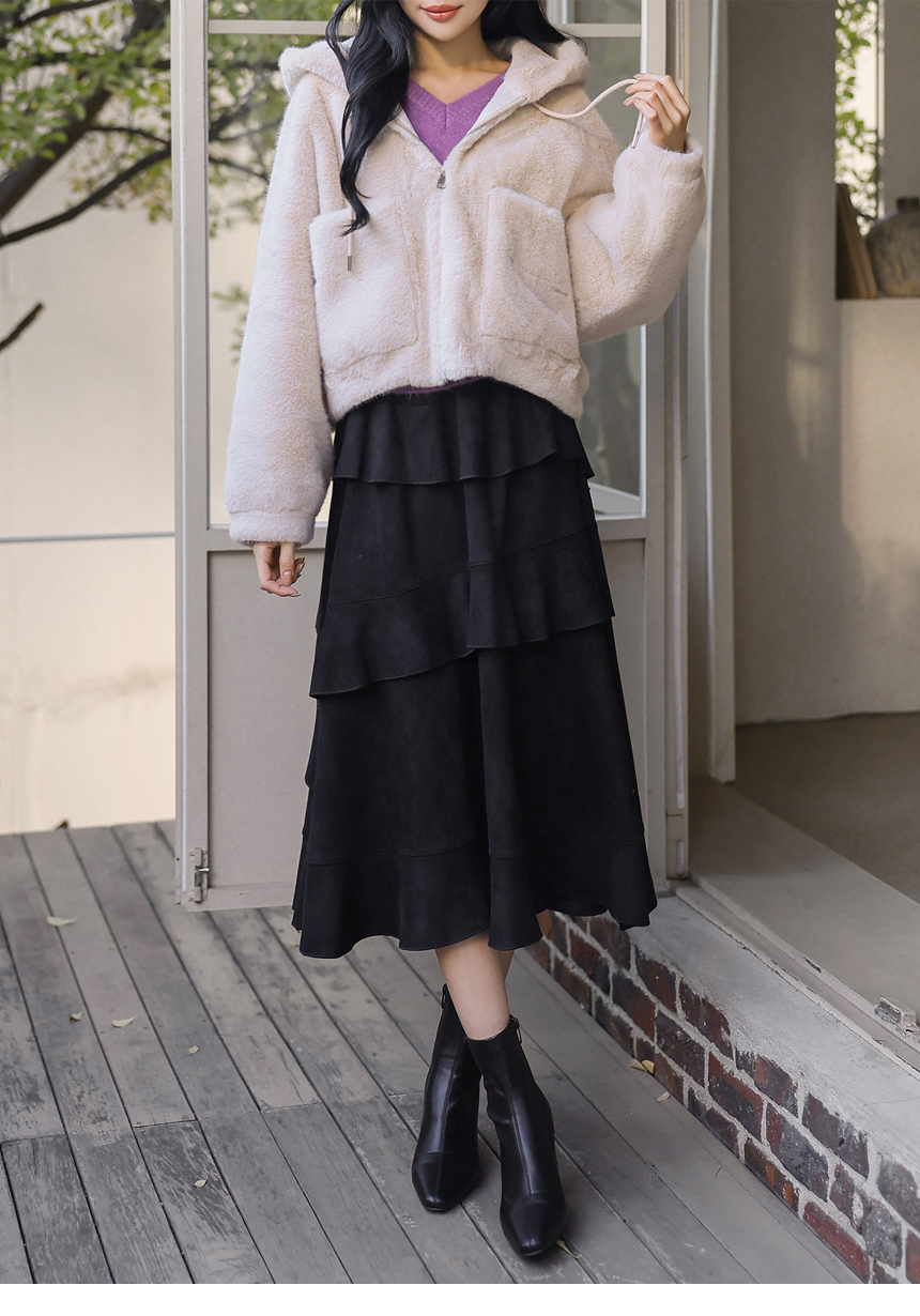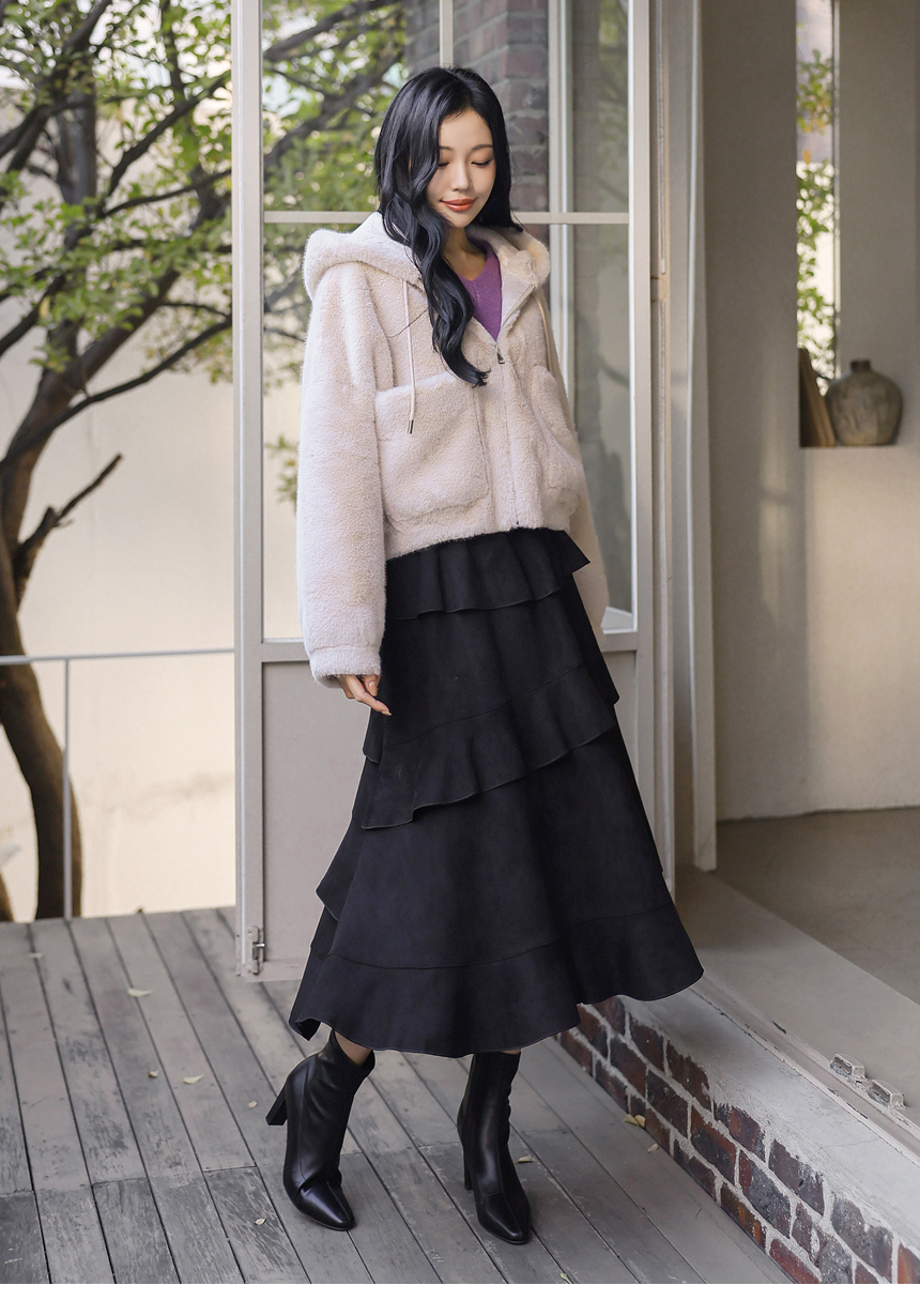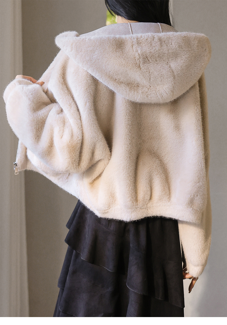 [Velvety fur and an airy silhouette offer snug comfort while the hood and big pockets add charm and function, making cold-weather dressing feel playful.]