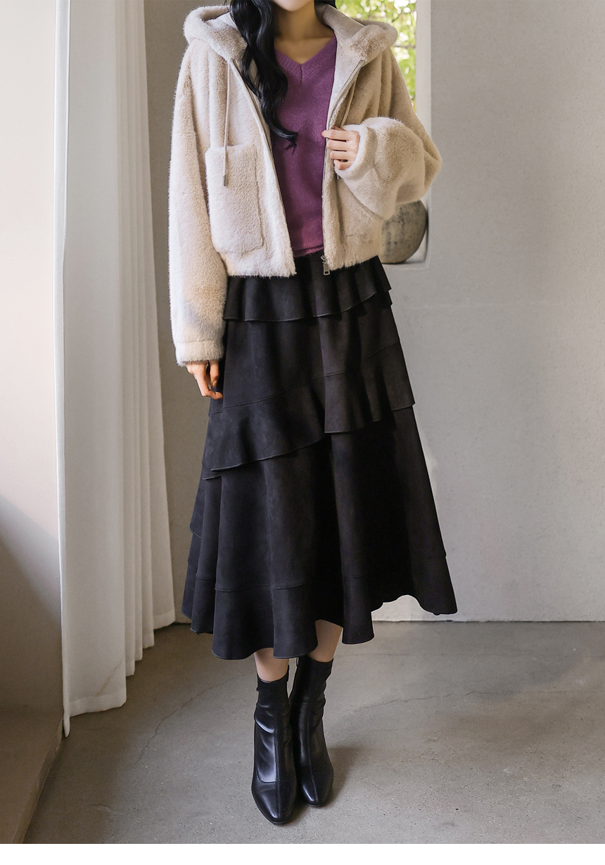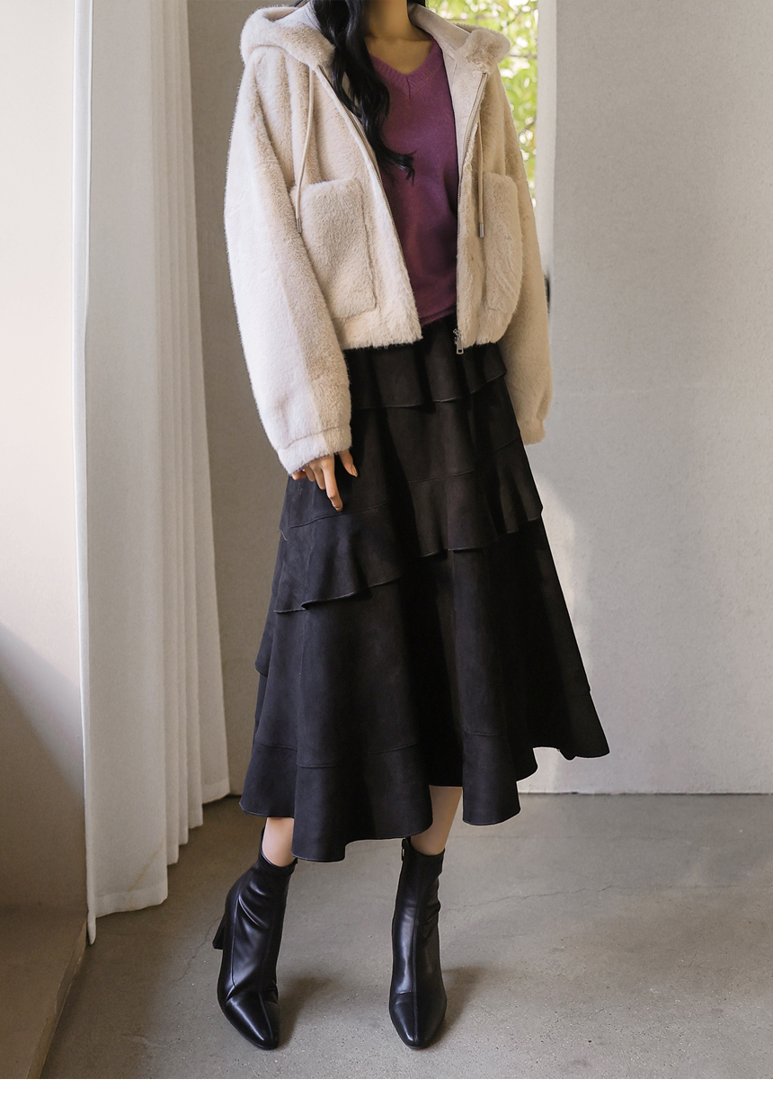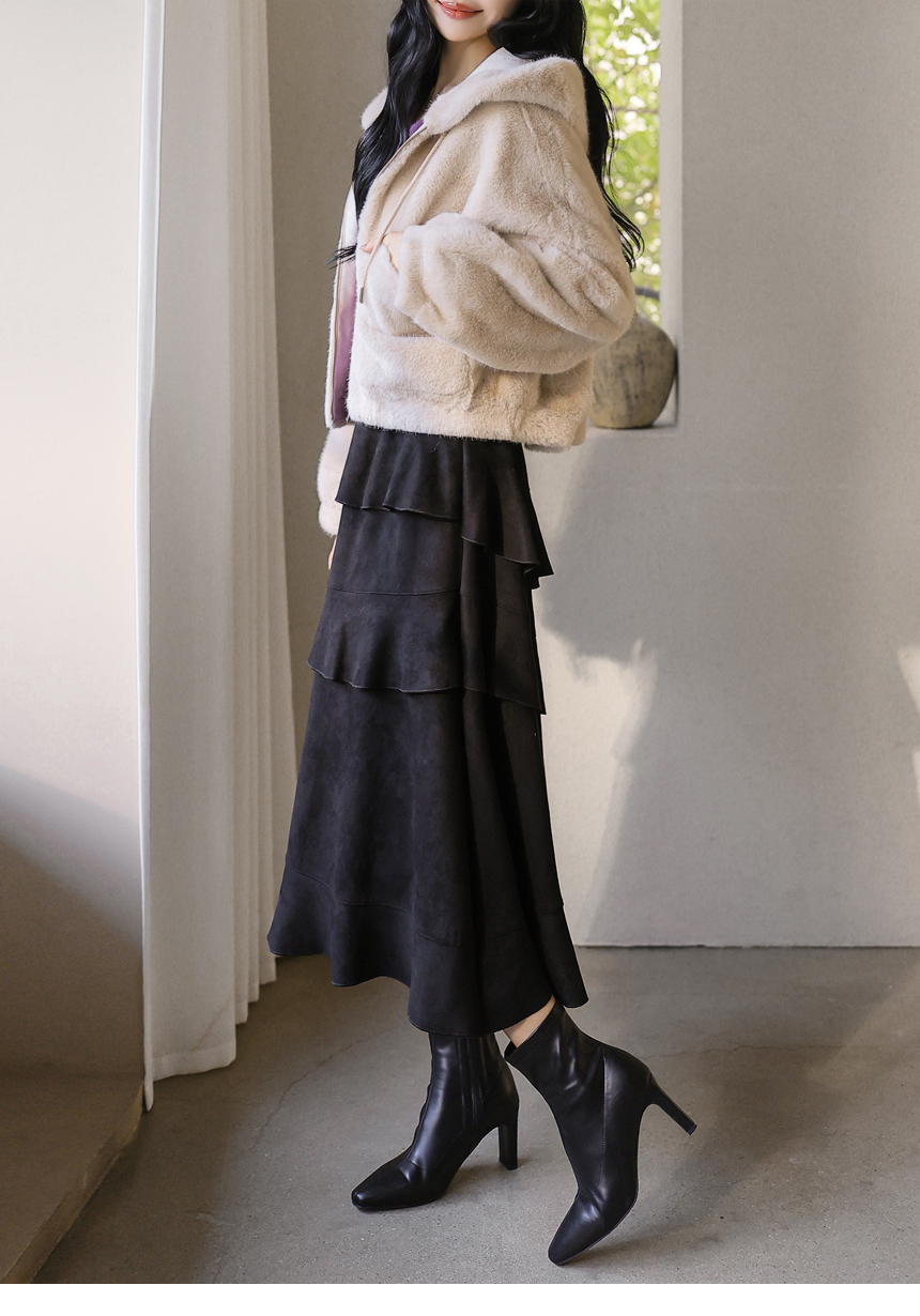 [Velvety fur and an airy silhouette offer snug comfort while the hood and big pockets add charm and function, making cold-weather dressing feel playful.]