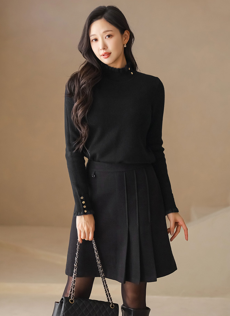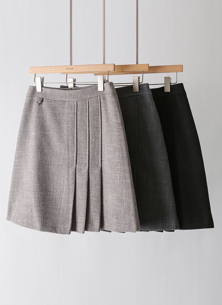 [A soft wool-like texture and asymmetric pleat detail elevate this classic A-line, creating a refined winter skirt that flatters effortlessly from office to daily looks.]