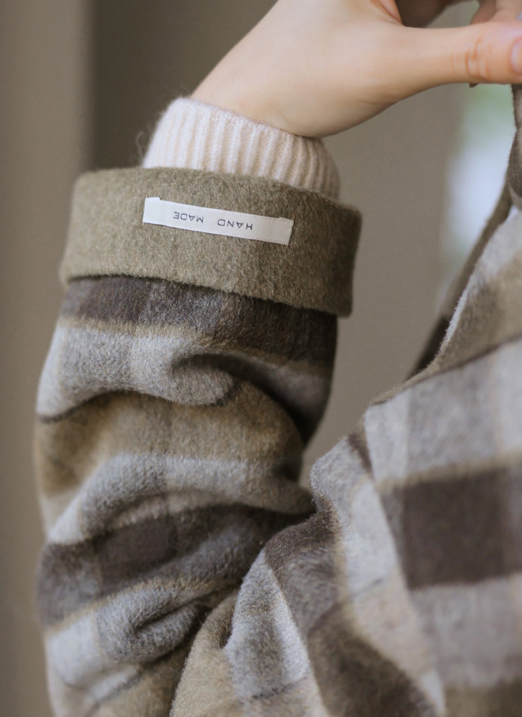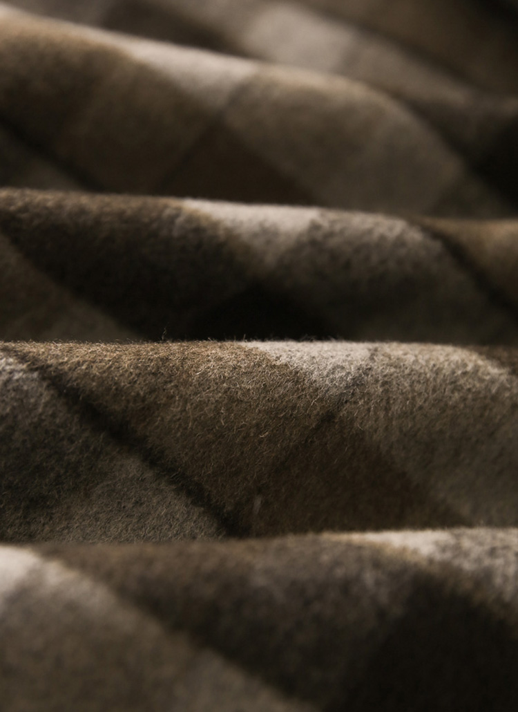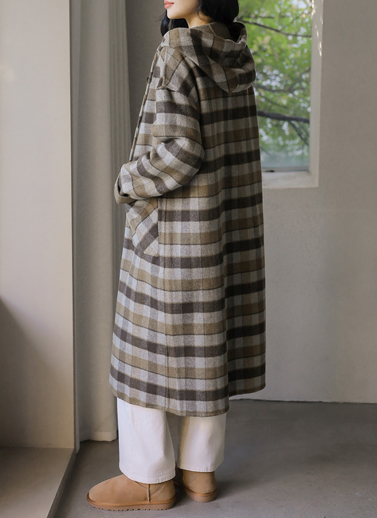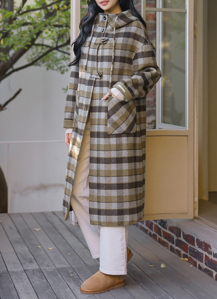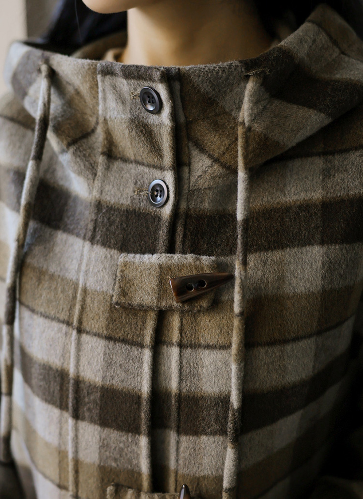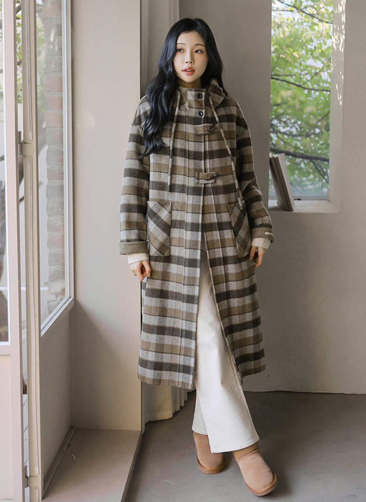 [A cozy wool-mix plaid and relaxed silhouette enhance cold-weather outfits, while the high neck, hood, and upper toggle accents bring both function and elevated style.]