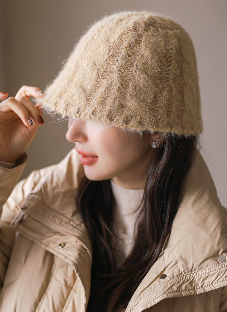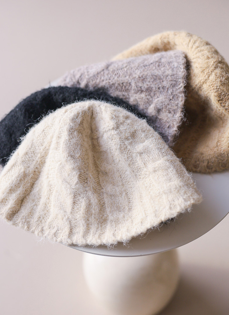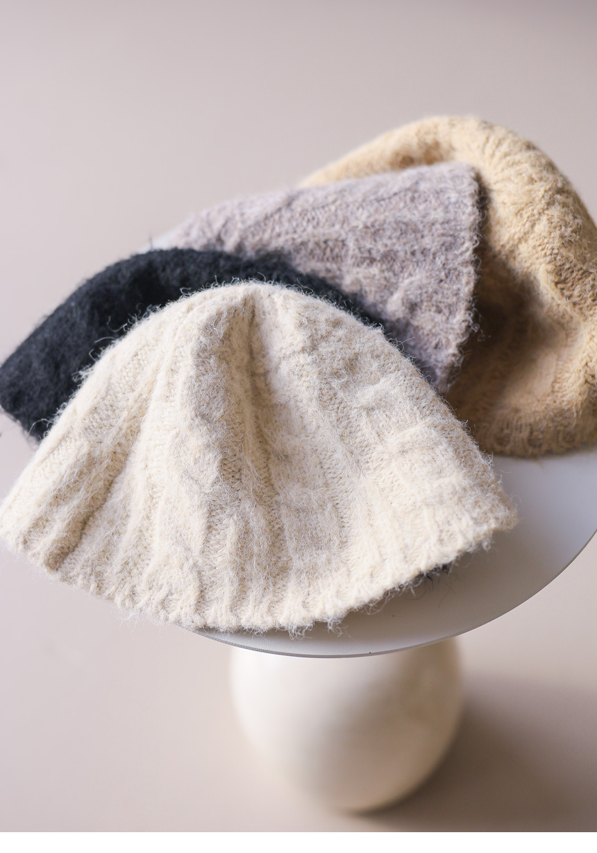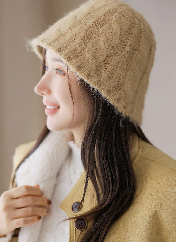 [A soft cable-textured bucket hat with a gentle fuzzy finish that adds warmth and charm. Its light structure frames the face beautifully for effortless winter styling.]