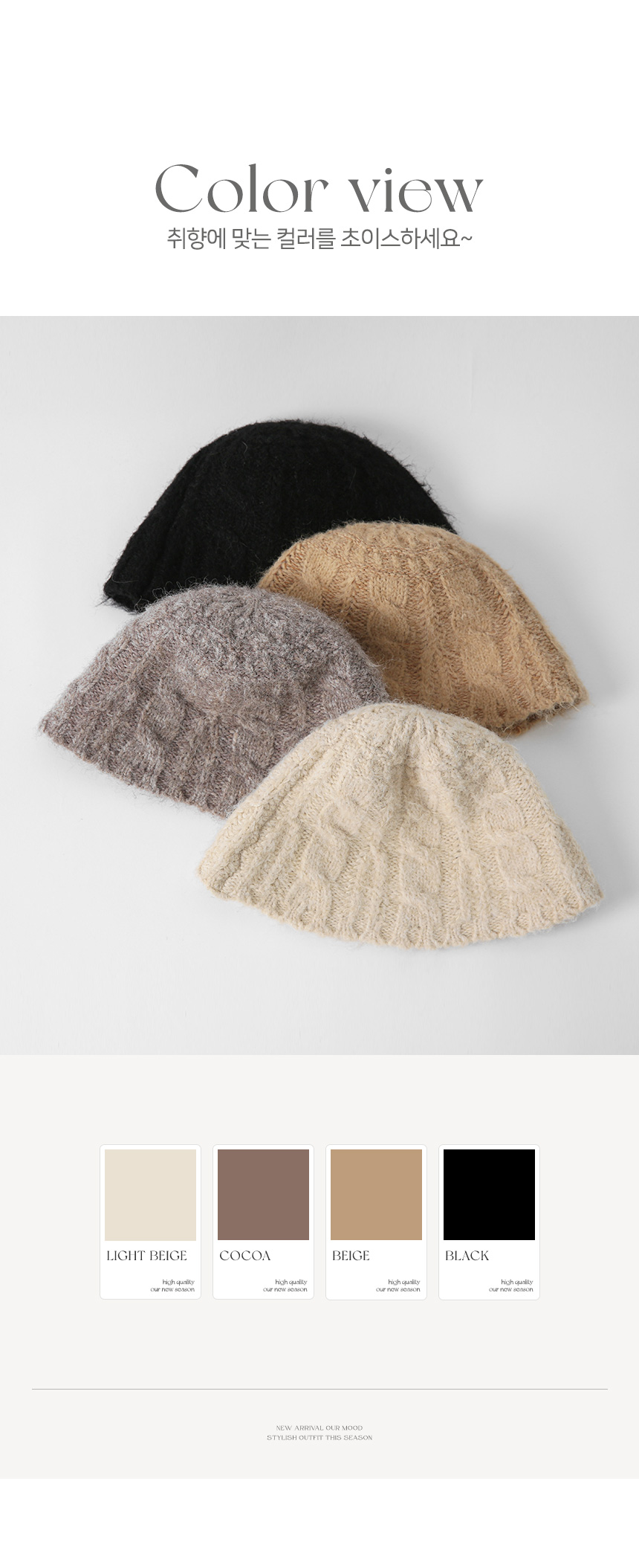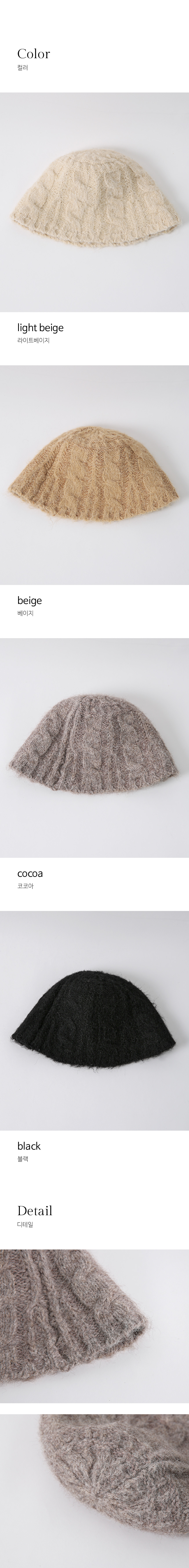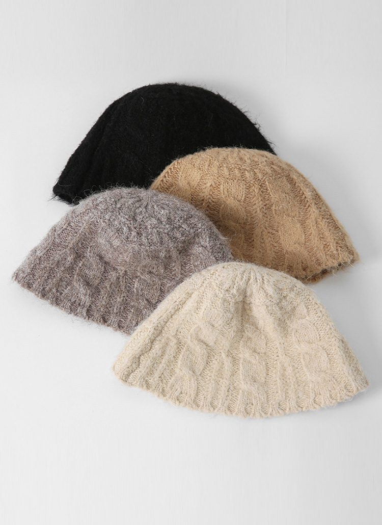 [A soft cable-textured bucket hat with a gentle fuzzy finish that adds warmth and charm. Its light structure frames the face beautifully for effortless winter styling.]