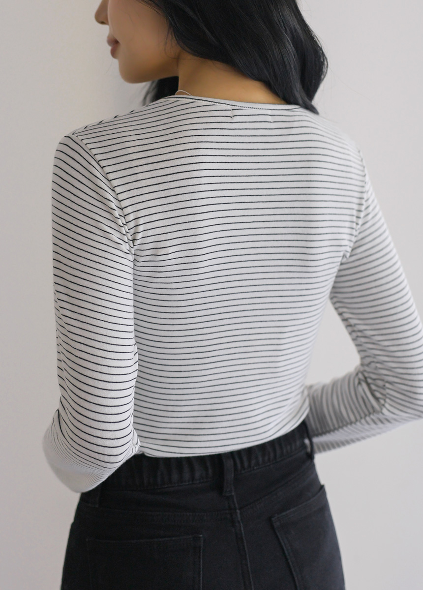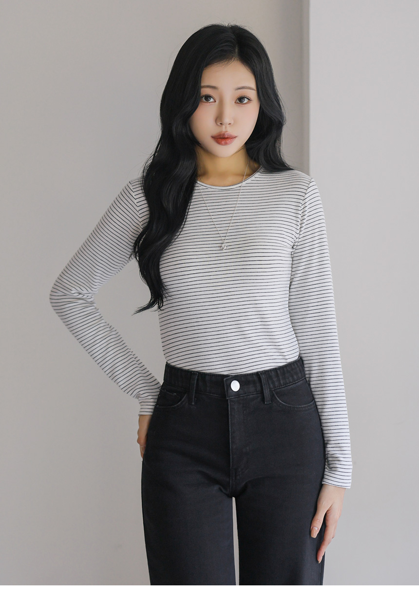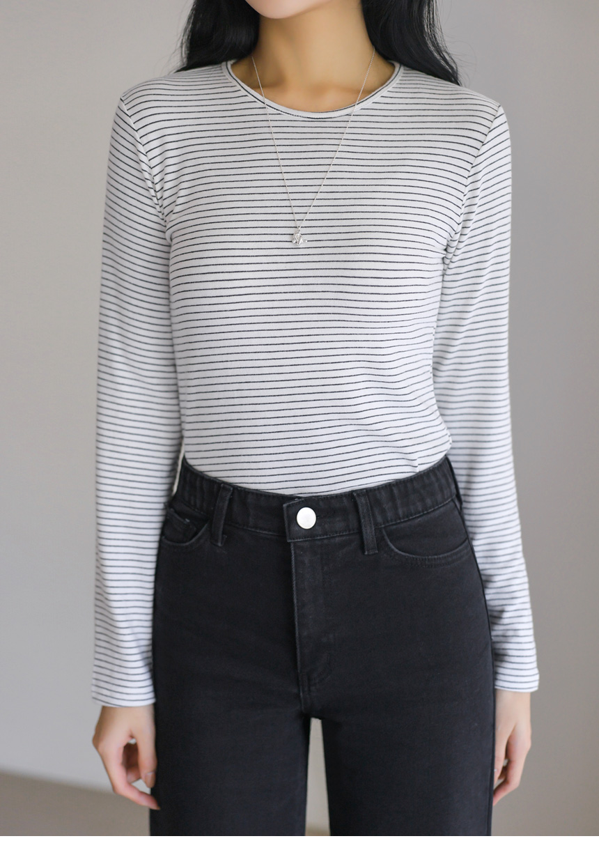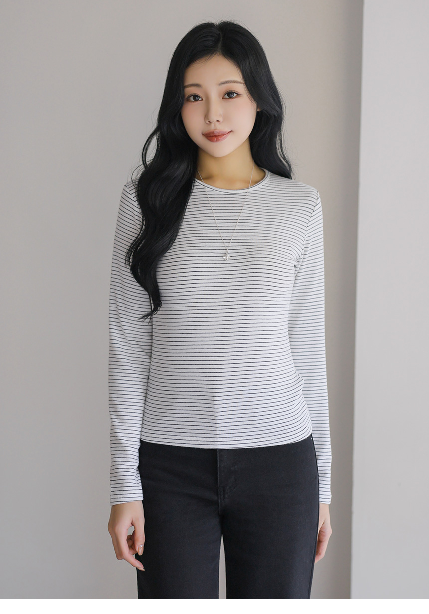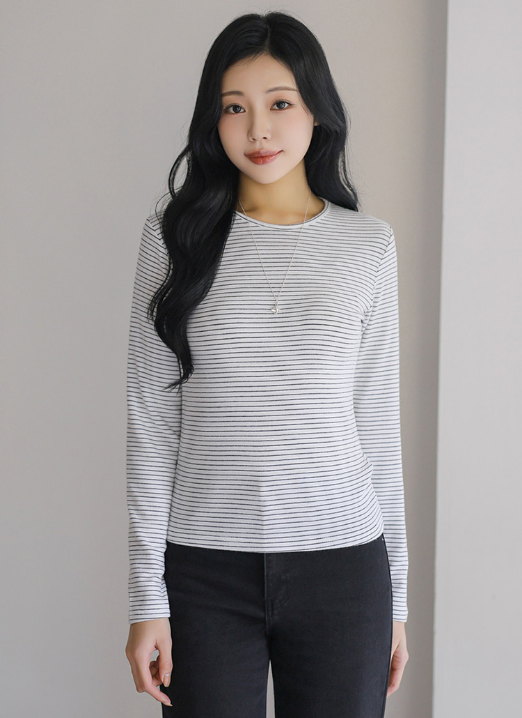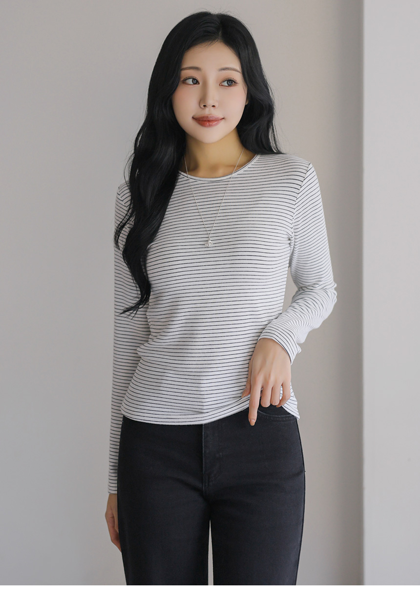 [A cozy angora-blend tee with gentle stretch and a sleek slim fit, adding a refined striped touch that layers beautifully through every season.]