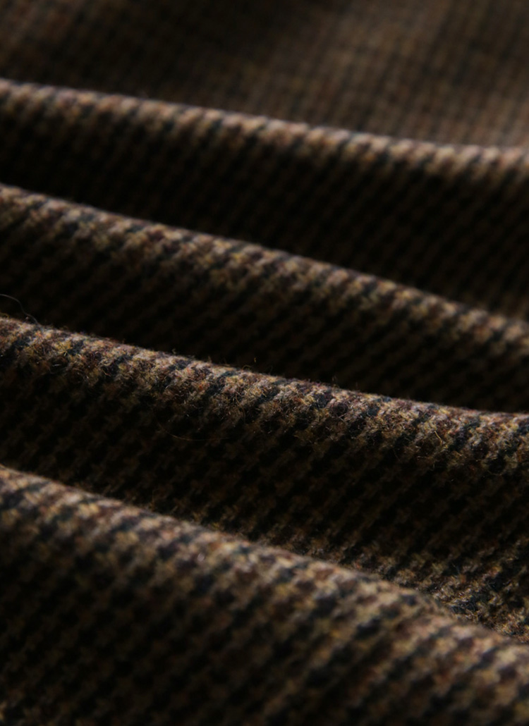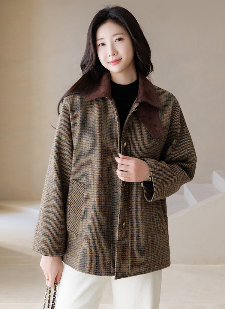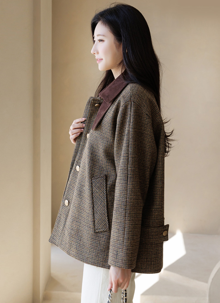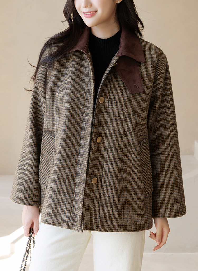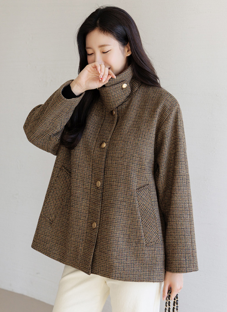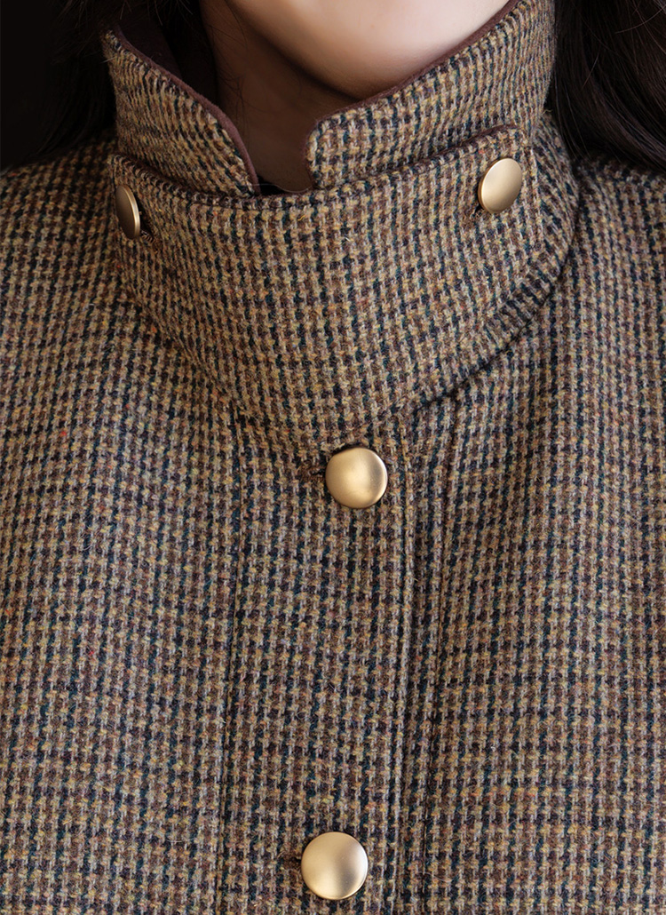[A refined wool-blend check coat with a softly structured silhouette, suede-trimmed collar, and adjustable high-neck tab for warm, polished winter styling.]