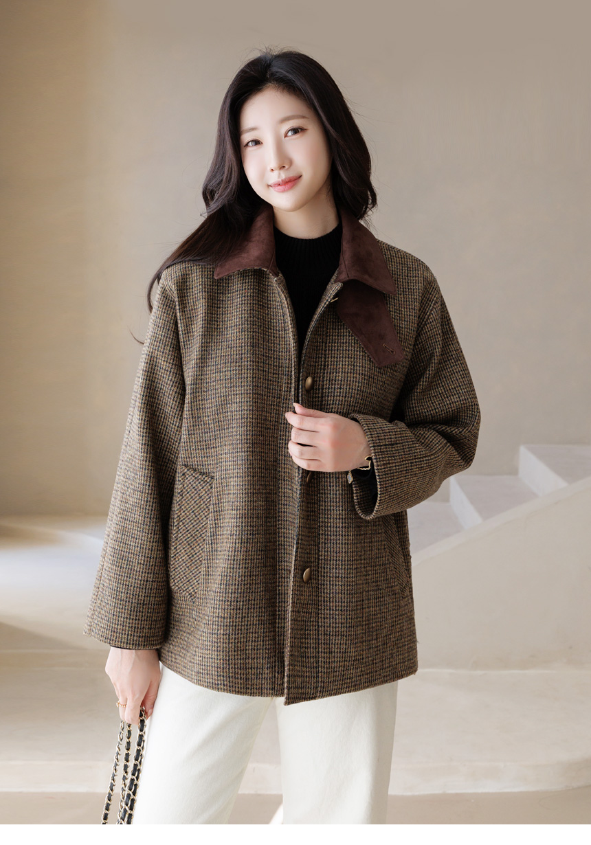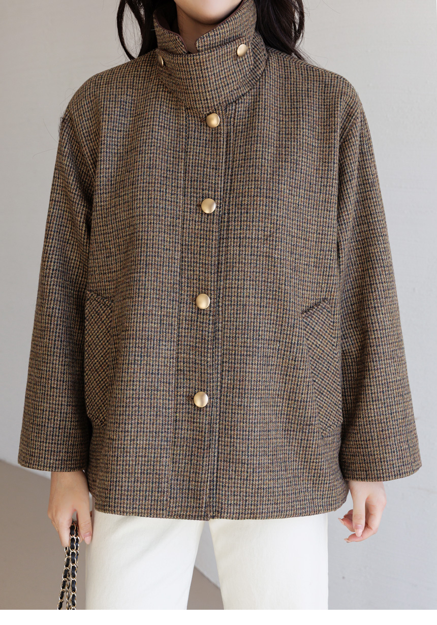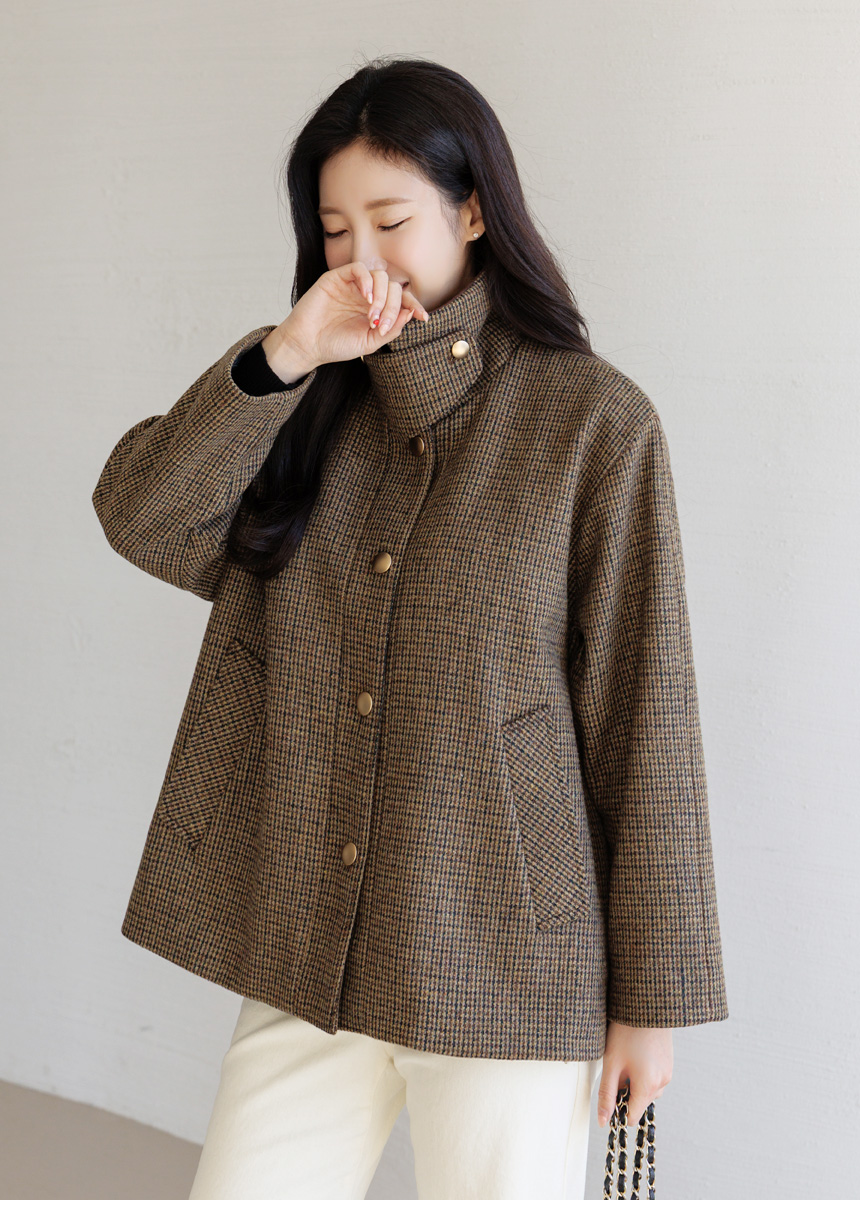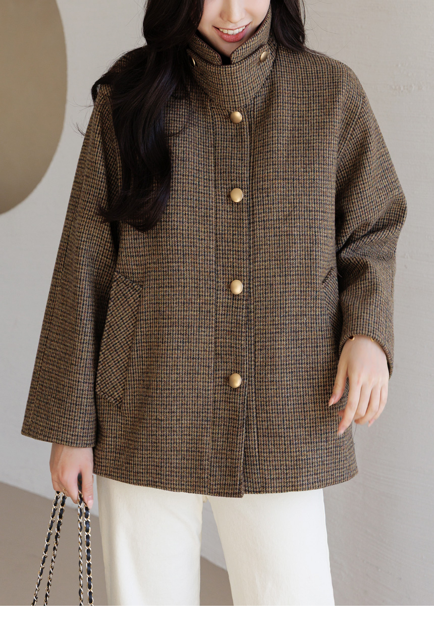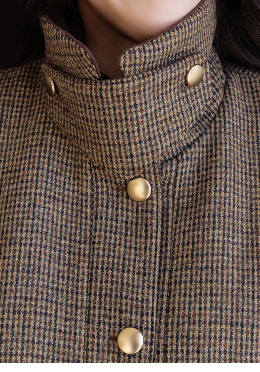 [A refined wool-blend check coat with a softly structured silhouette, suede-trimmed collar, and adjustable high-neck tab for warm, polished winter styling.]