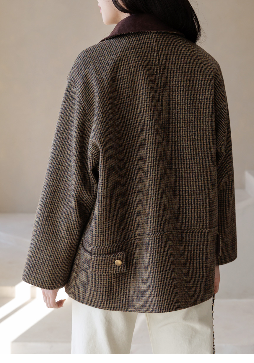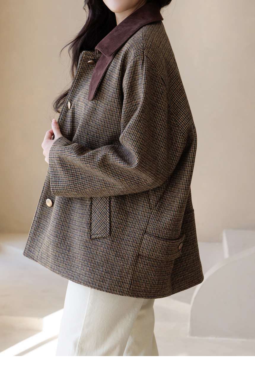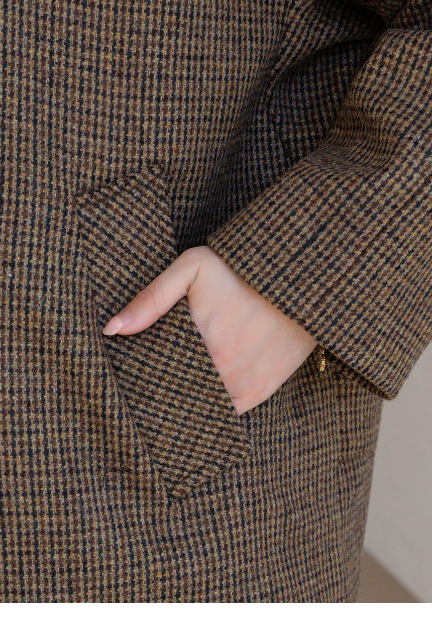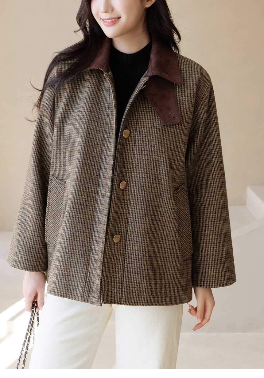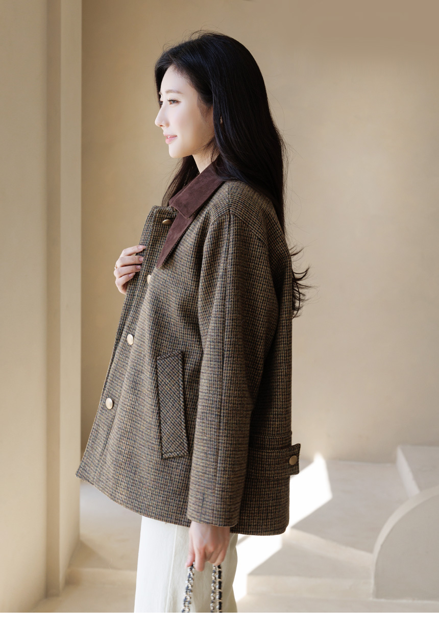 [A refined wool-blend check coat with a softly structured silhouette, suede-trimmed collar, and adjustable high-neck tab for warm, polished winter styling.]