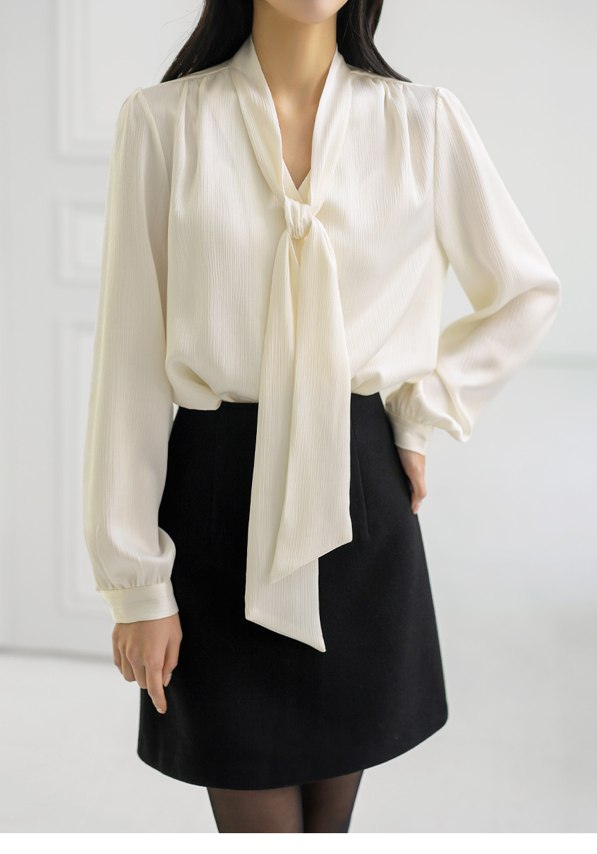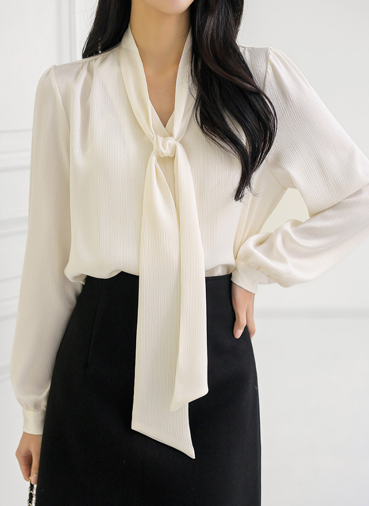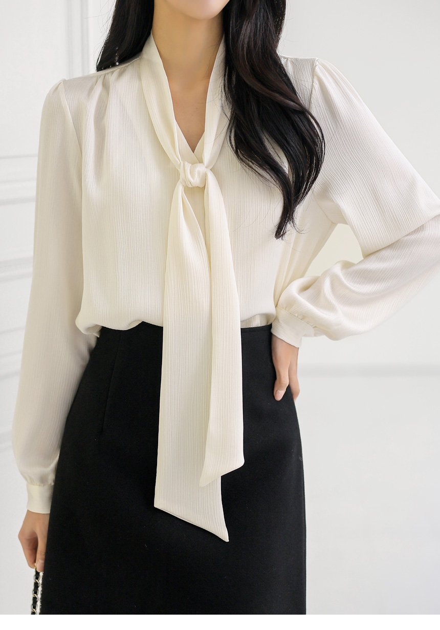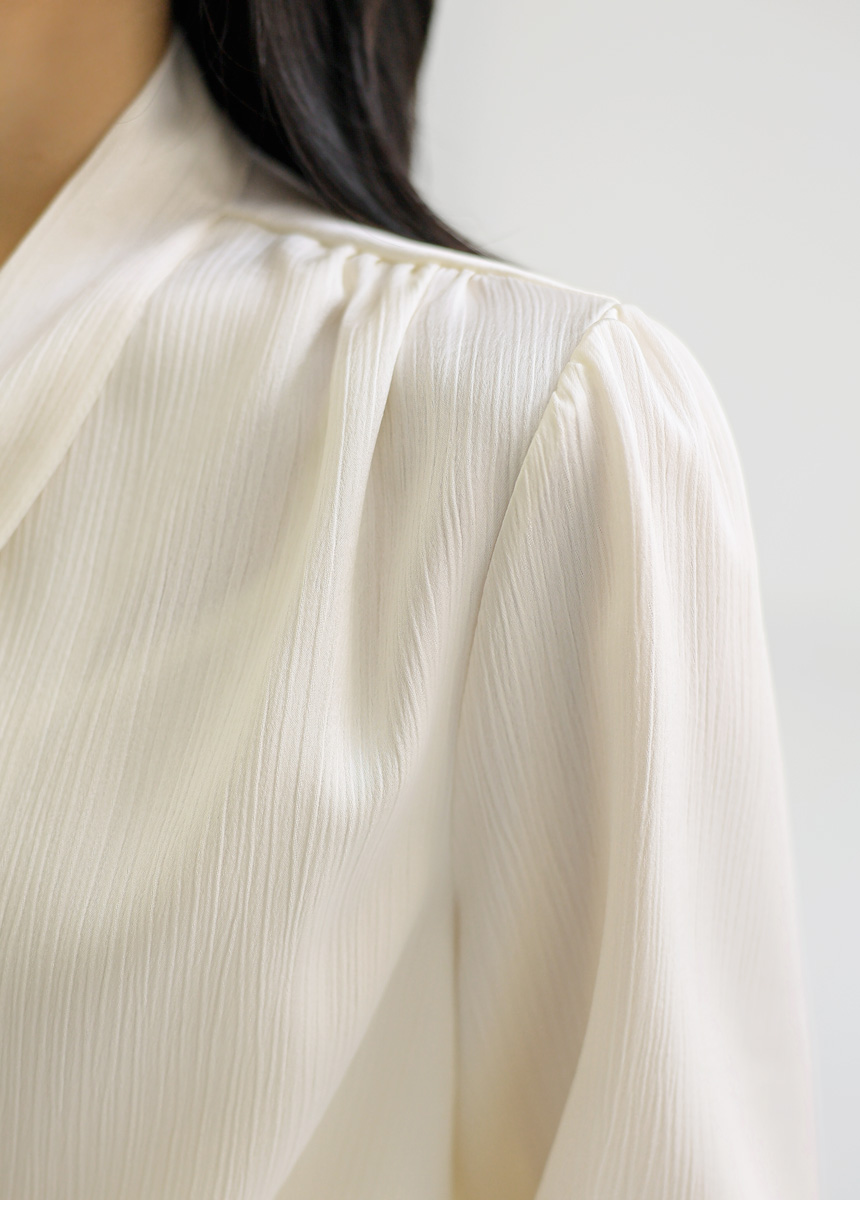 [A softly shimmering satin blouse with subtle crinkle texture, puff sleeves, and a versatile tie-neck that styles easily from office elegance to refined daily wear.]