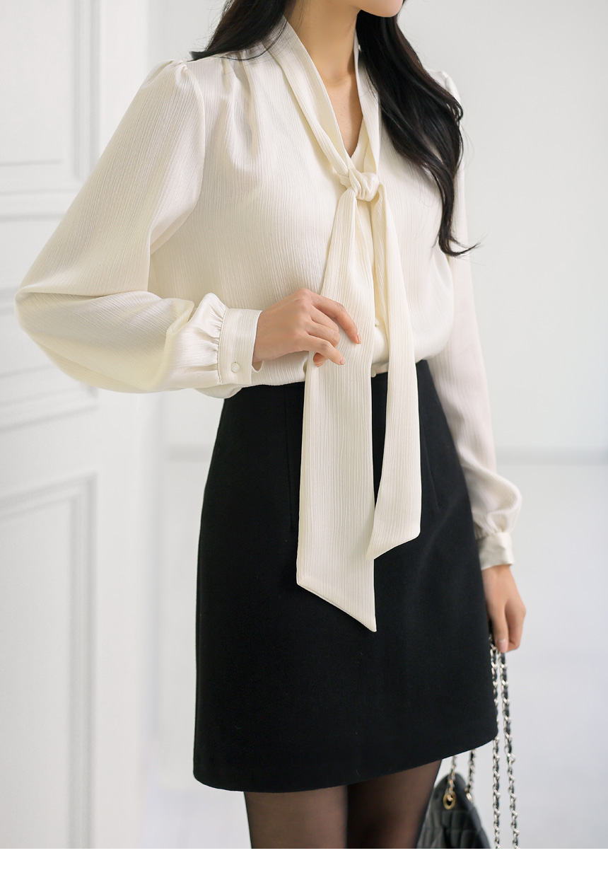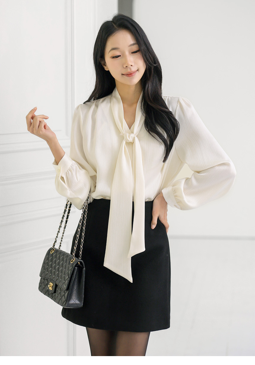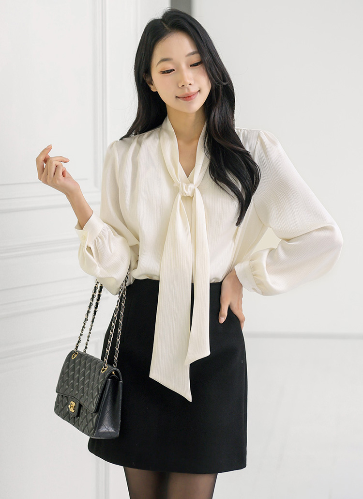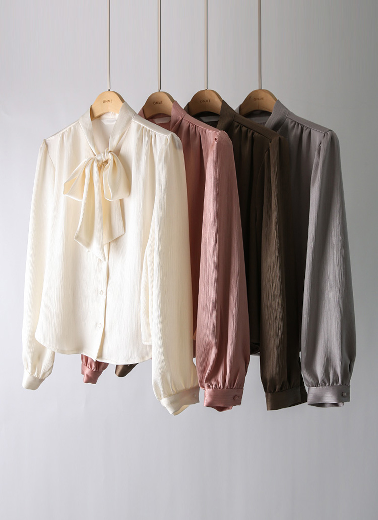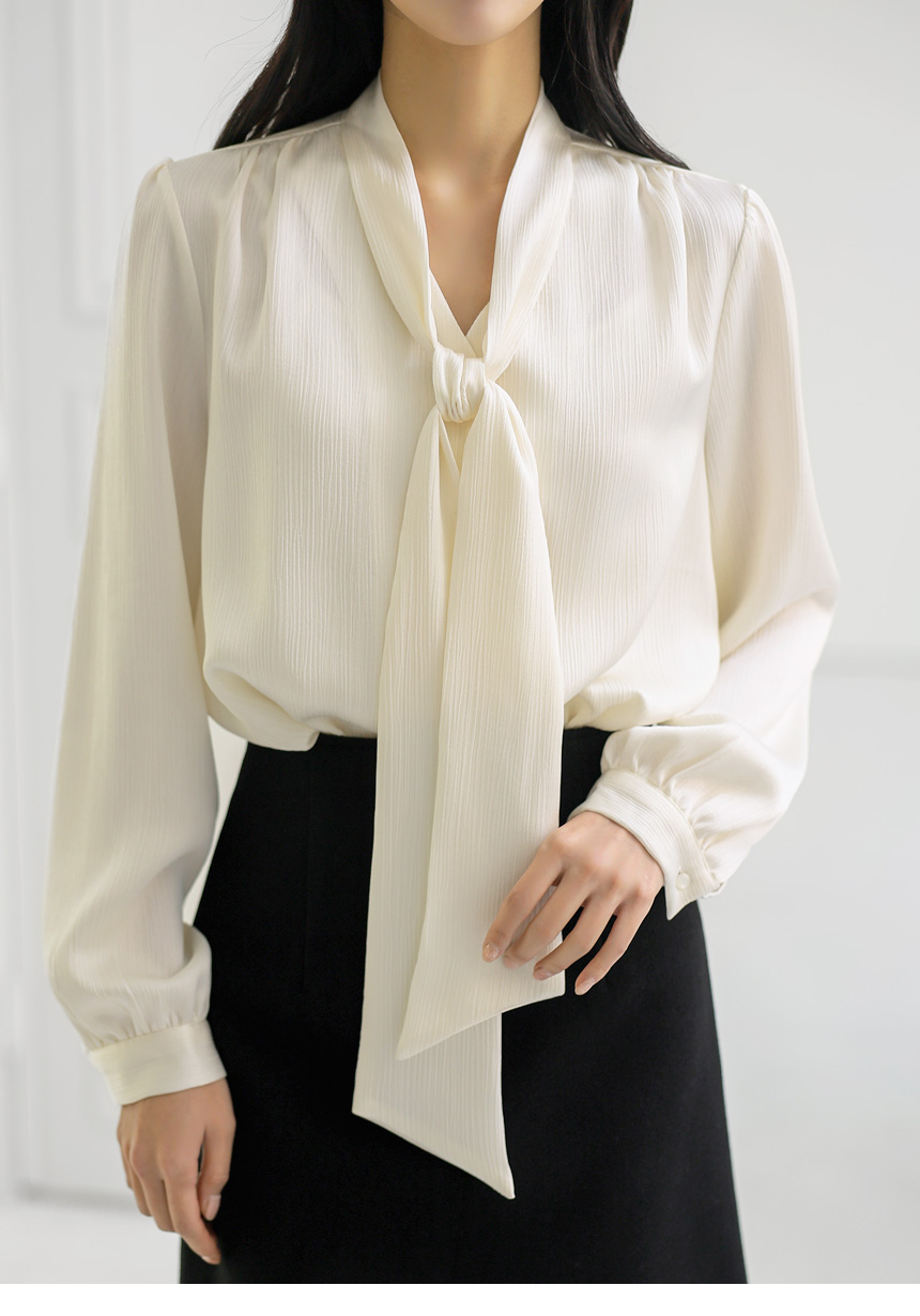 [A softly shimmering satin blouse with subtle crinkle texture, puff sleeves, and a versatile tie-neck that styles easily from office elegance to refined daily wear.]