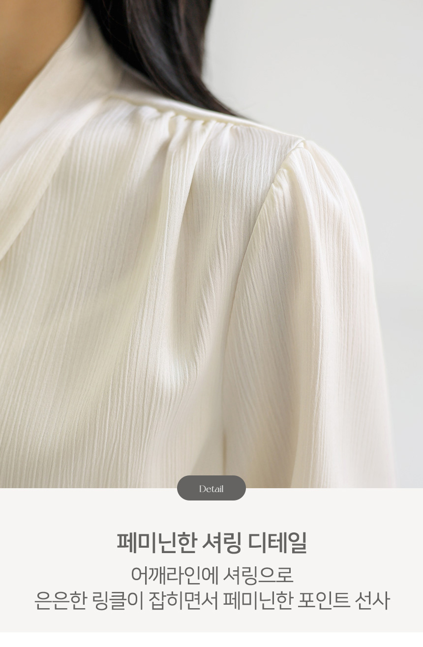 어깨 셔링과 퍼프 소매로 여성스러운 라인이 살아나며