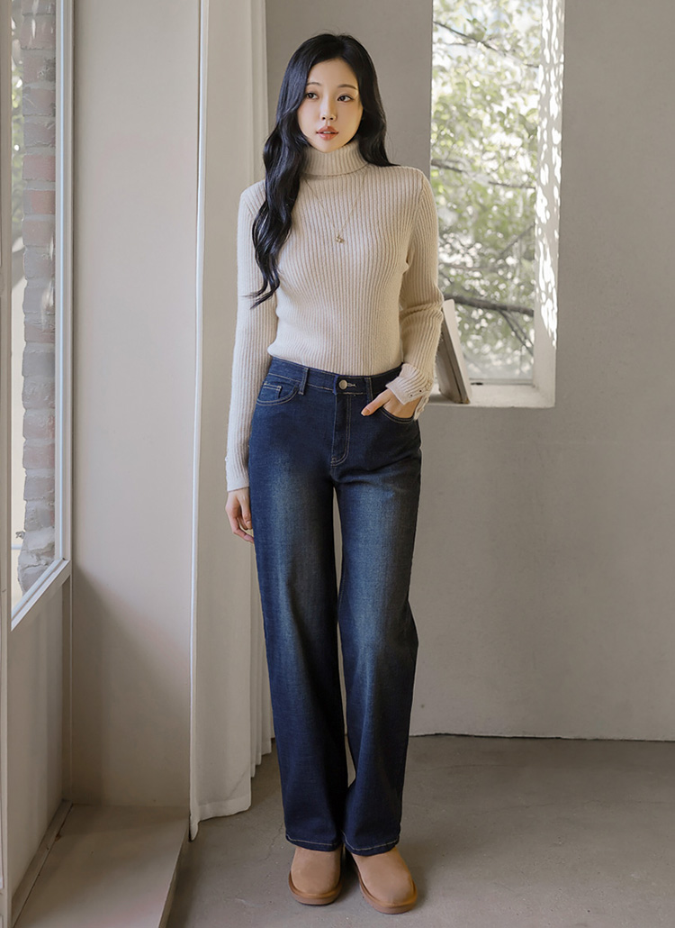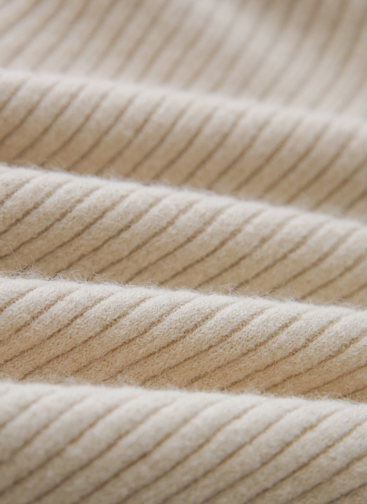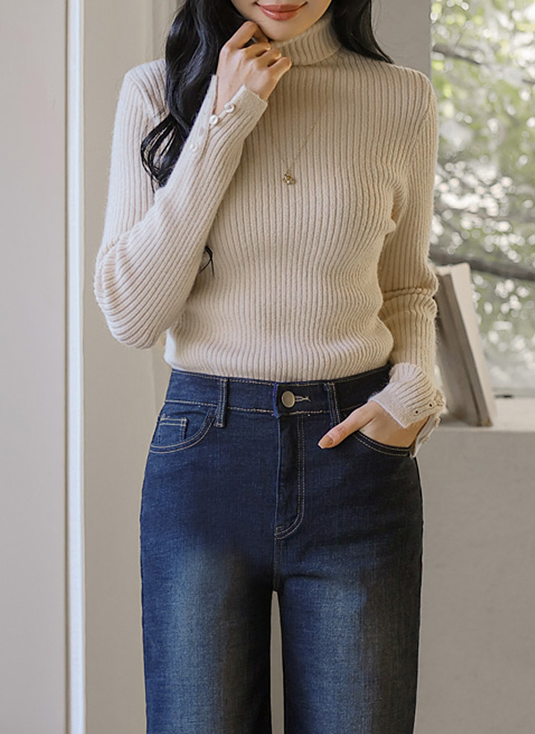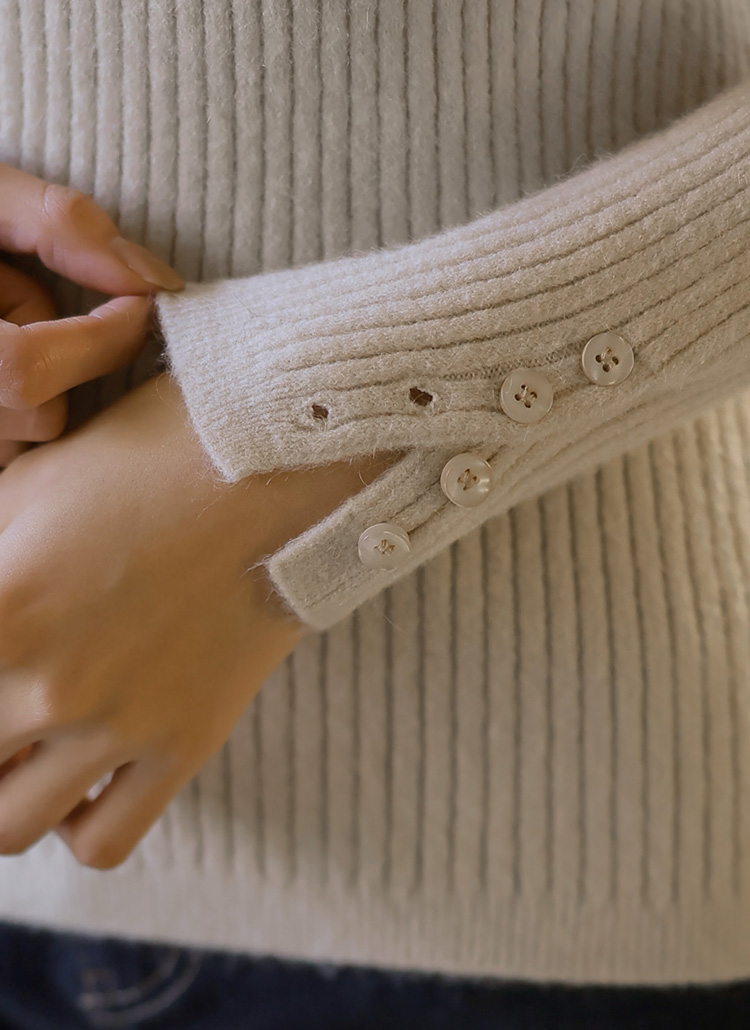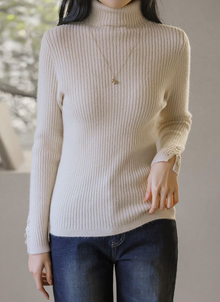 [A warm ribbed turtleneck knit with a slim, body-hugging fit. Sleeve button slits add subtle detail, creating a refined and feminine winter essential.]