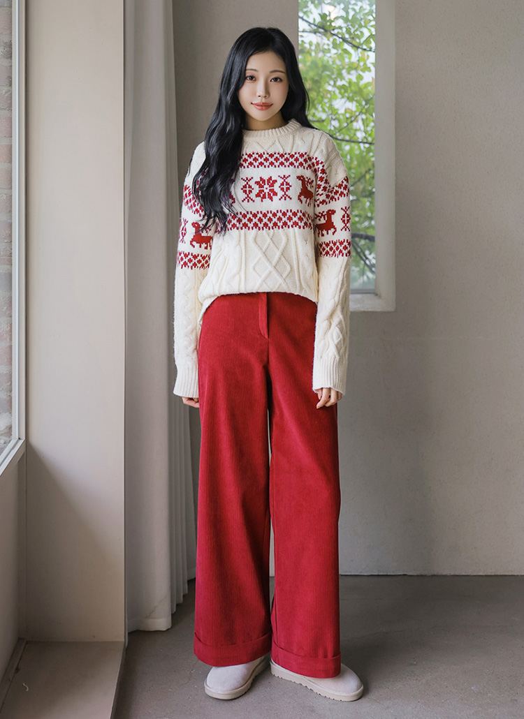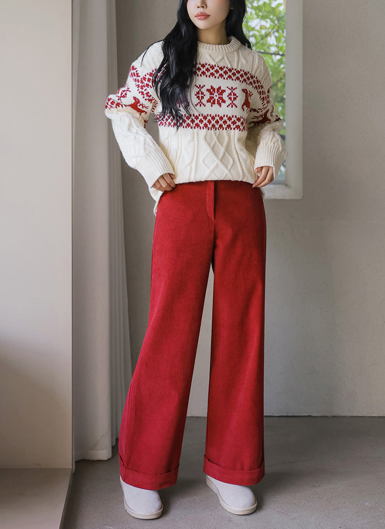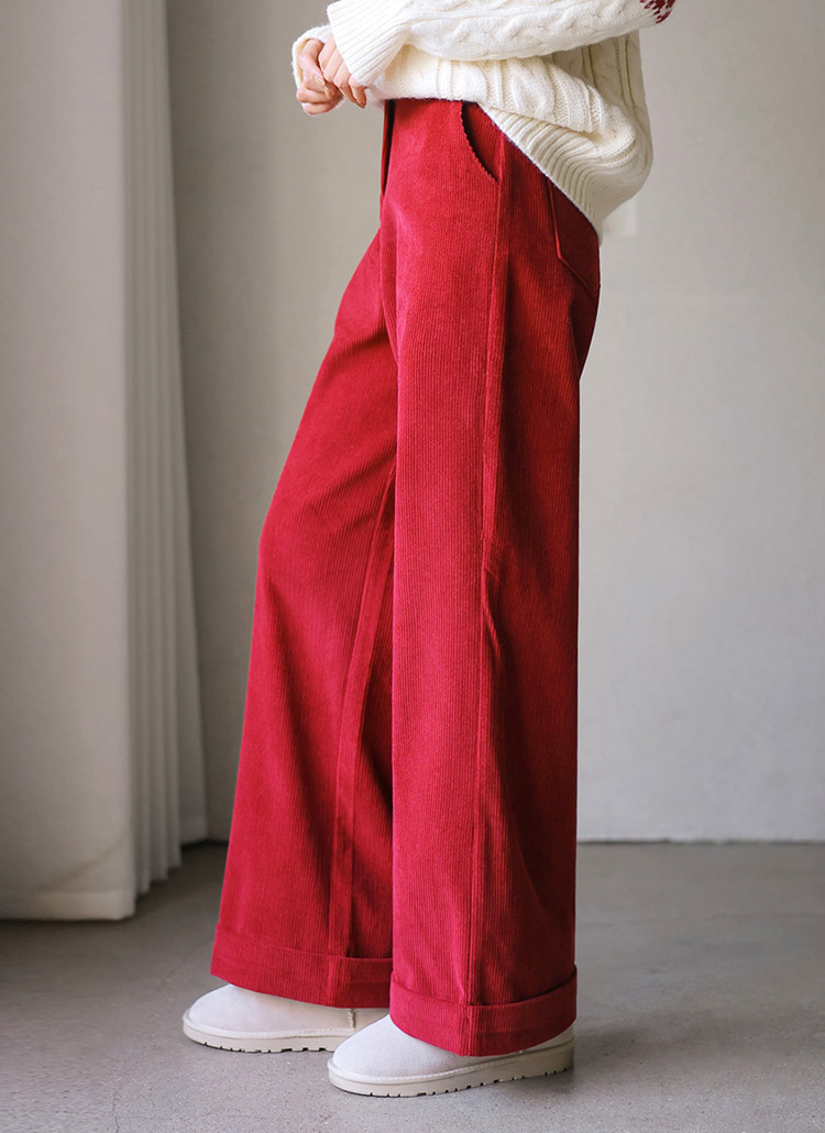 [Warm cotton corduroy slacks designed in a relaxed wide-leg fit, finished with roll-up hems that add a casual, stylish edge for winter outfits.]