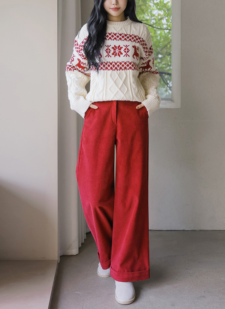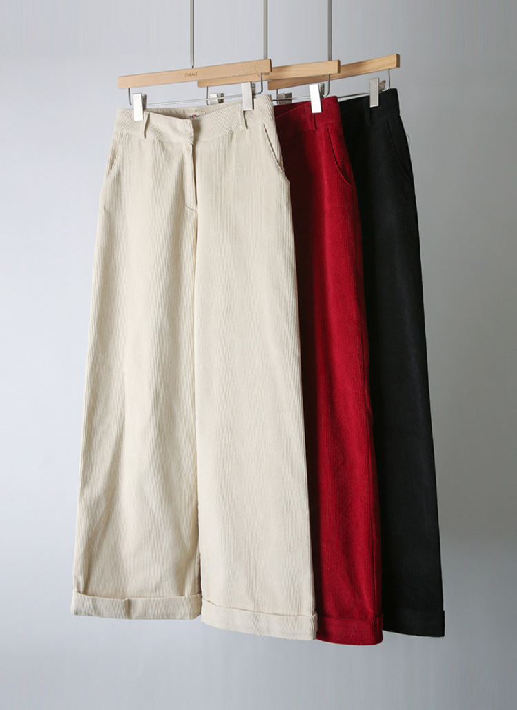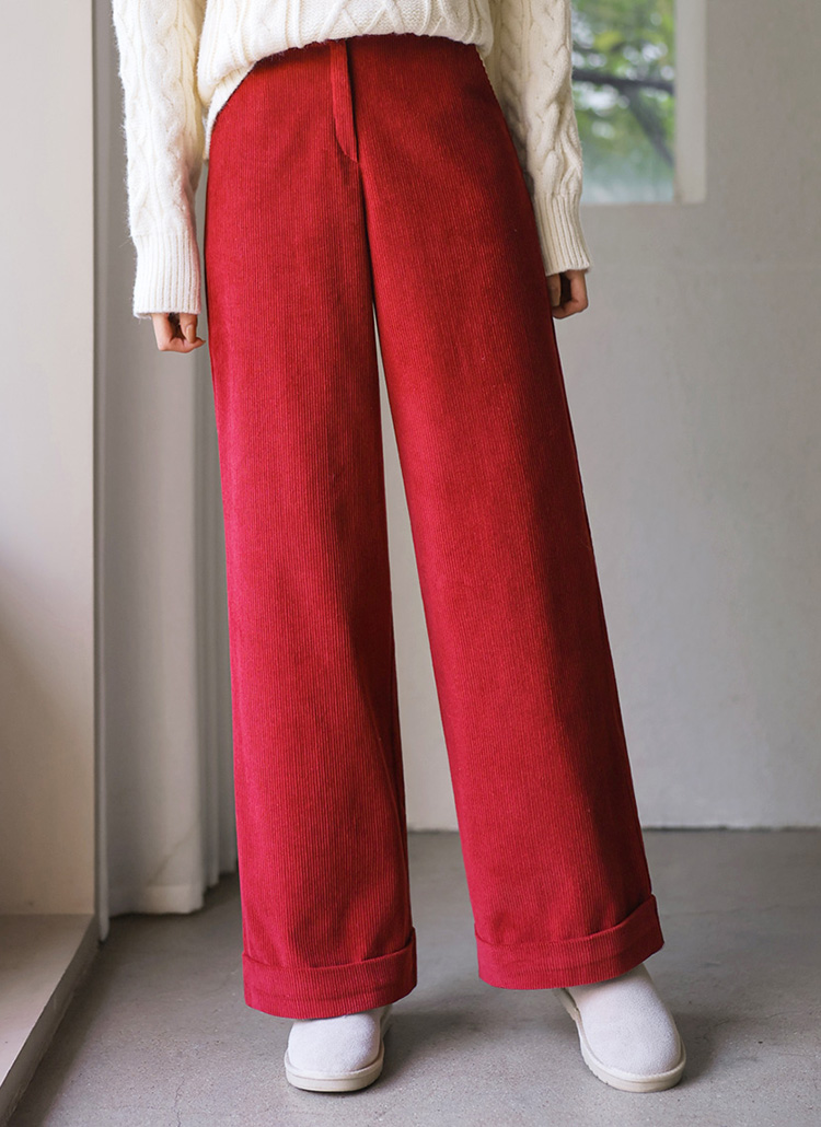 [Warm cotton corduroy slacks designed in a relaxed wide-leg fit, finished with roll-up hems that add a casual, stylish edge for winter outfits.]