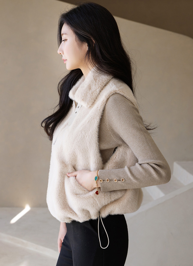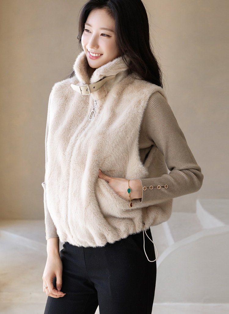 [Lightweight yet ultra cozy faux fur vest with a smooth suede lining, adjustable drawstring hem, and high-neck buckle detail for polished everyday layering.