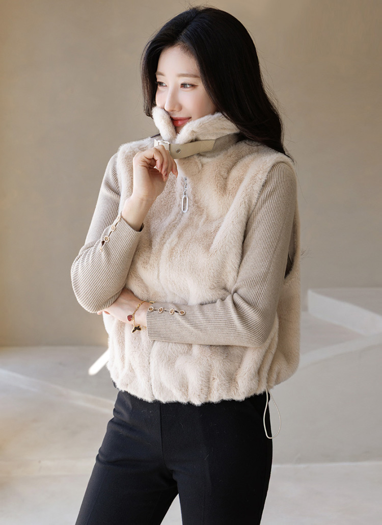 [Lightweight yet ultra cozy faux fur vest with a smooth suede lining, adjustable drawstring hem, and high-neck buckle detail for polished everyday layering.