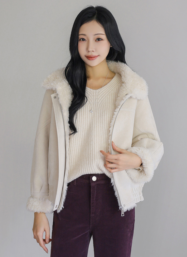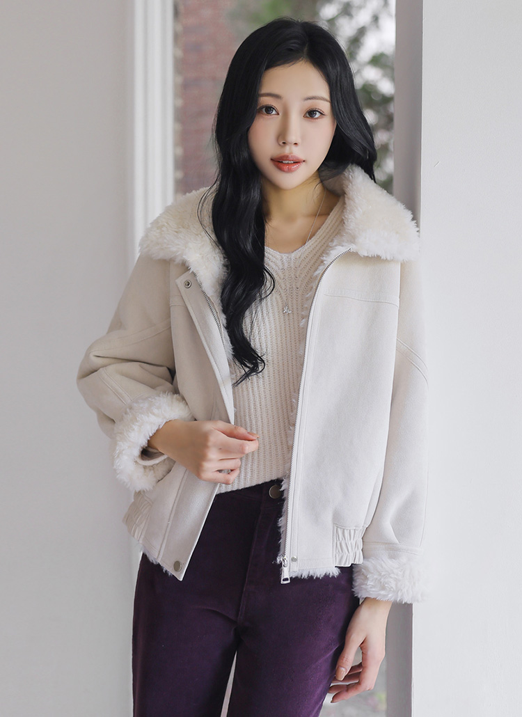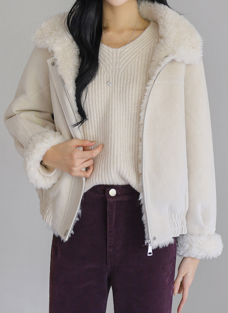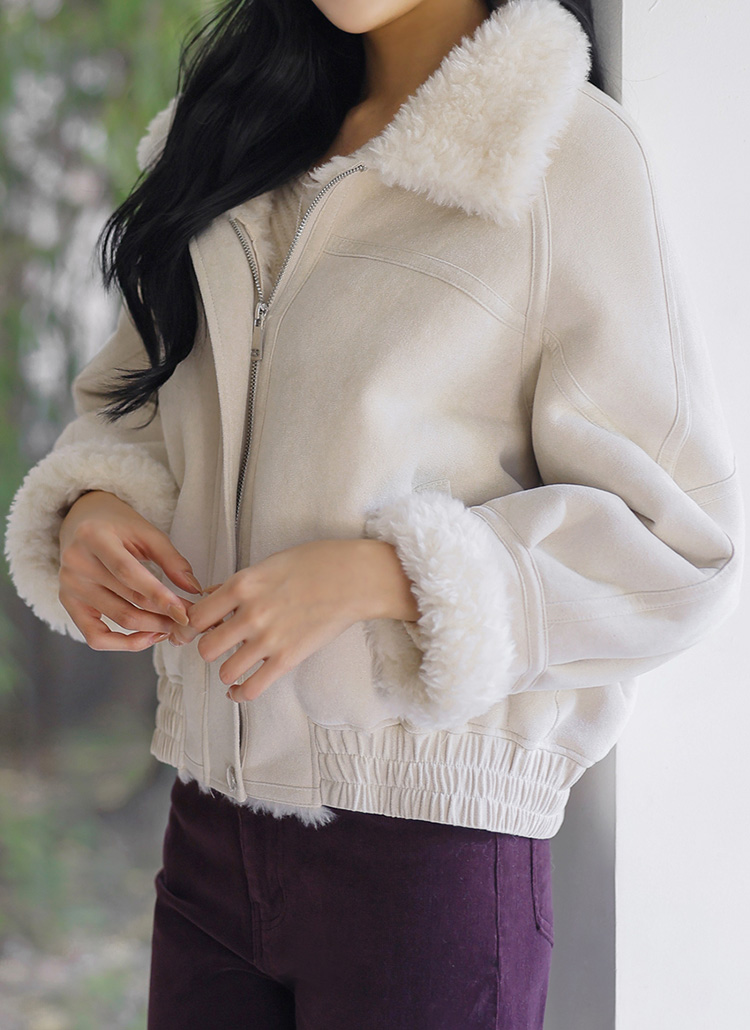 [A cozy zip-up jacket with soft suede-touch texture and plush faux fur lining. Relaxed fit and banded hem create warmth with a refined winter mood.]