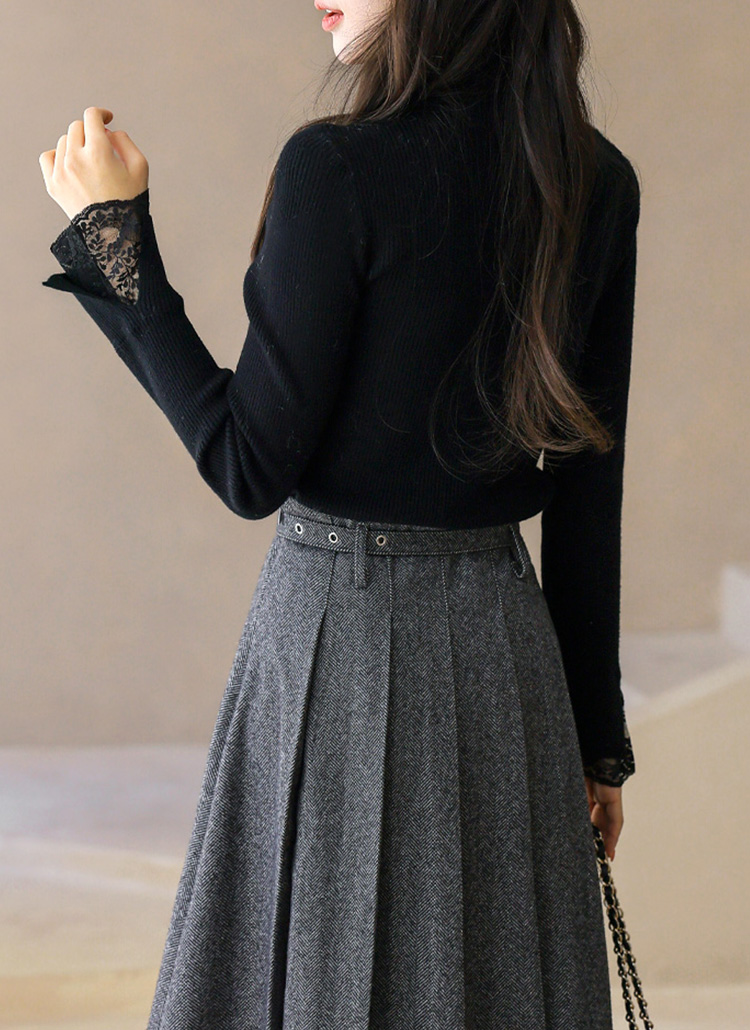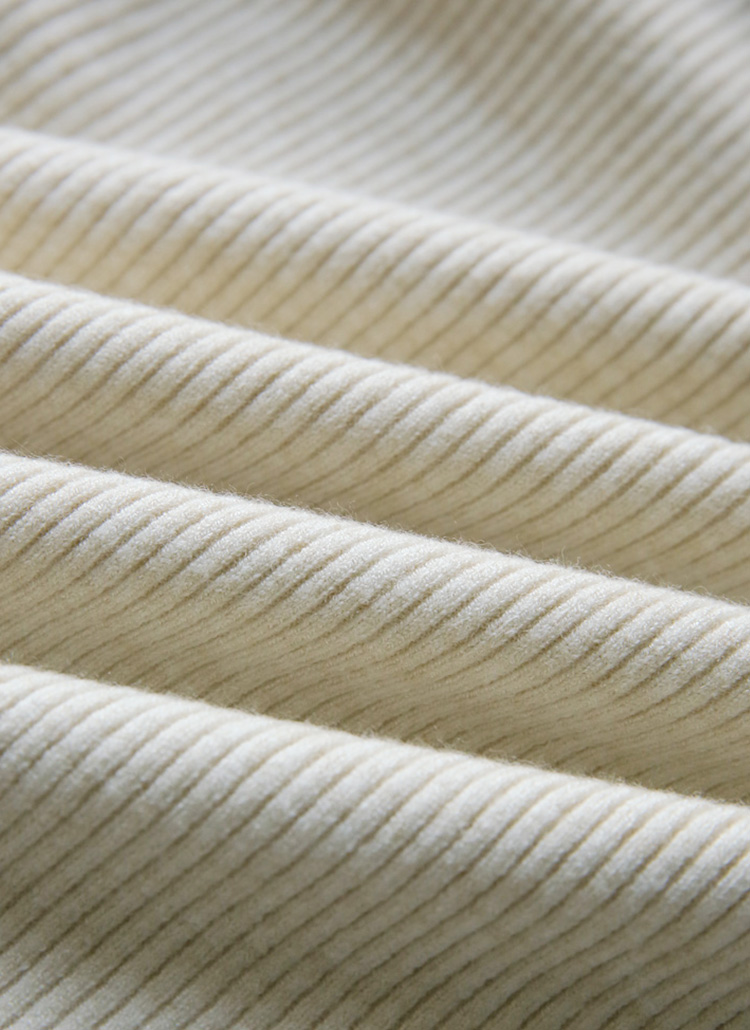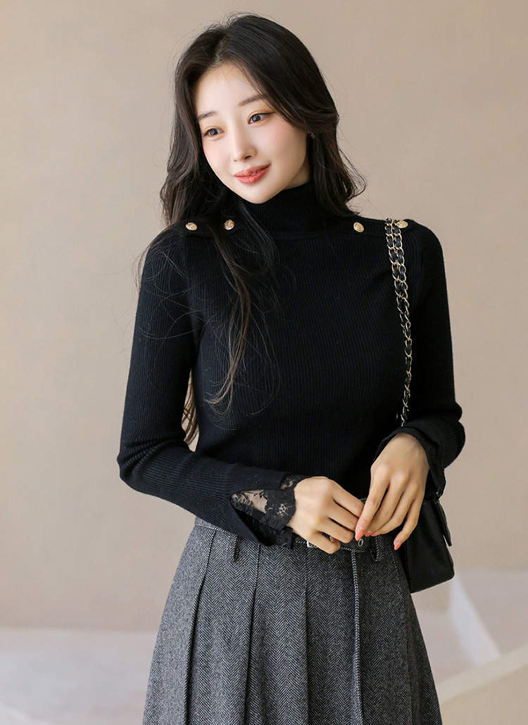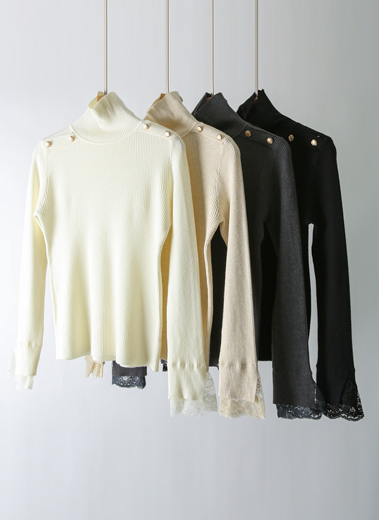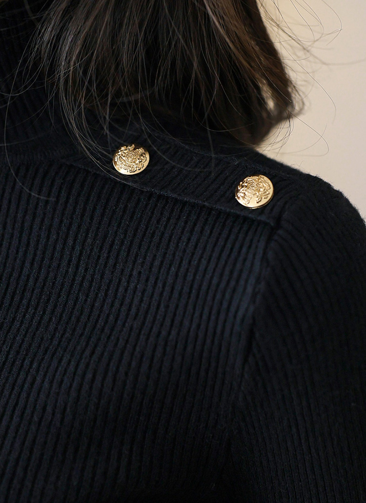 [A refined ribbed turtleneck featuring lace-slit cuffs and gold shoulder buttons, offering a slim yet comfortable fit with elegant layering appeal.]