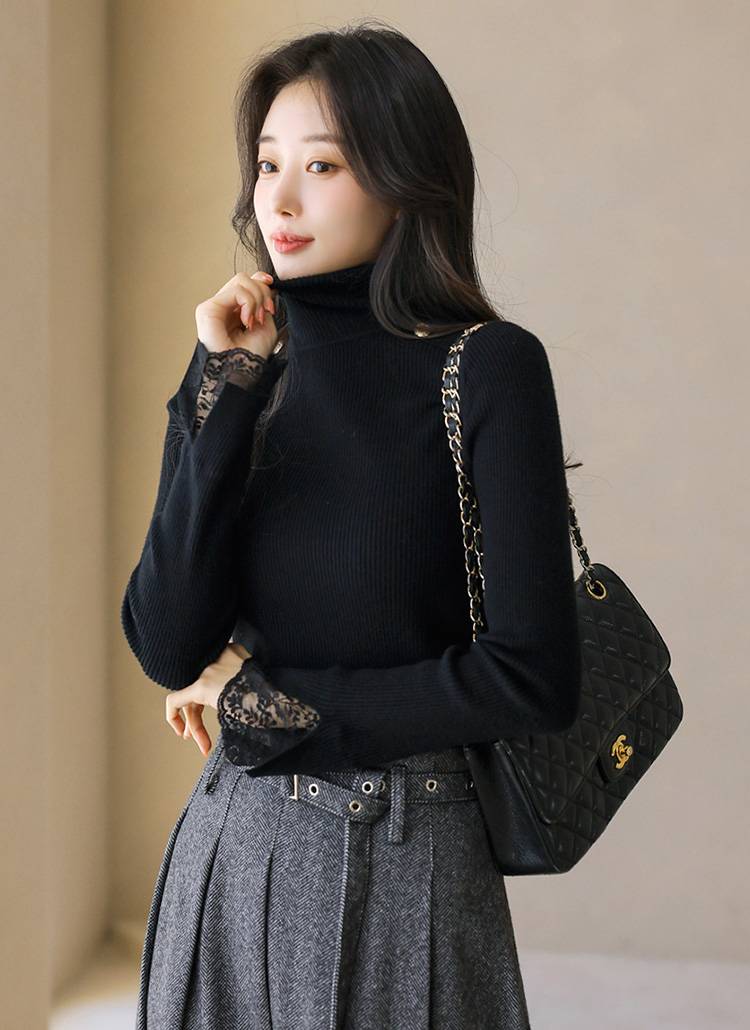 (4 Colors) Lace Accent Shoulder Button Turtleneck Knit