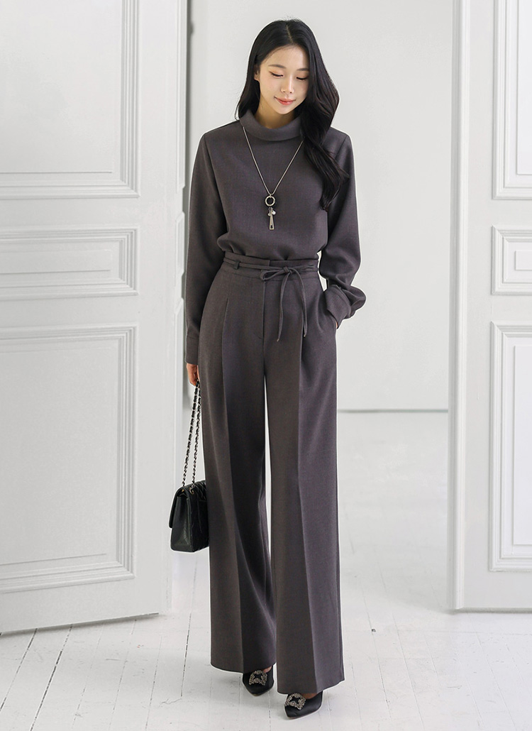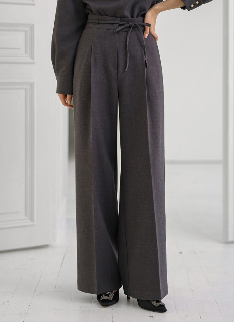 [Wide slacks with a single tuck and long leg line. A slim ribbon belt defines the waist, while the structured, stretch fabric keeps a clean, polished silhouette.]