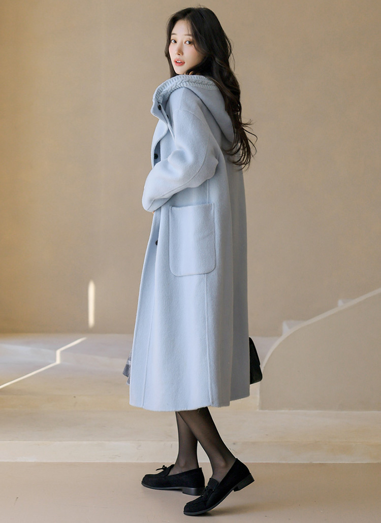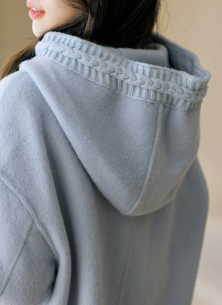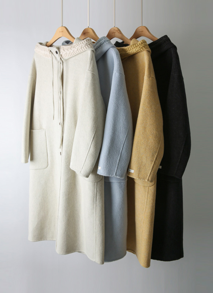 [This long handmade wool blend coat showcases delicate knit trimming along the hood, a fluid oversized fit, and elevated warmth for effortless cold-weather sophistication.